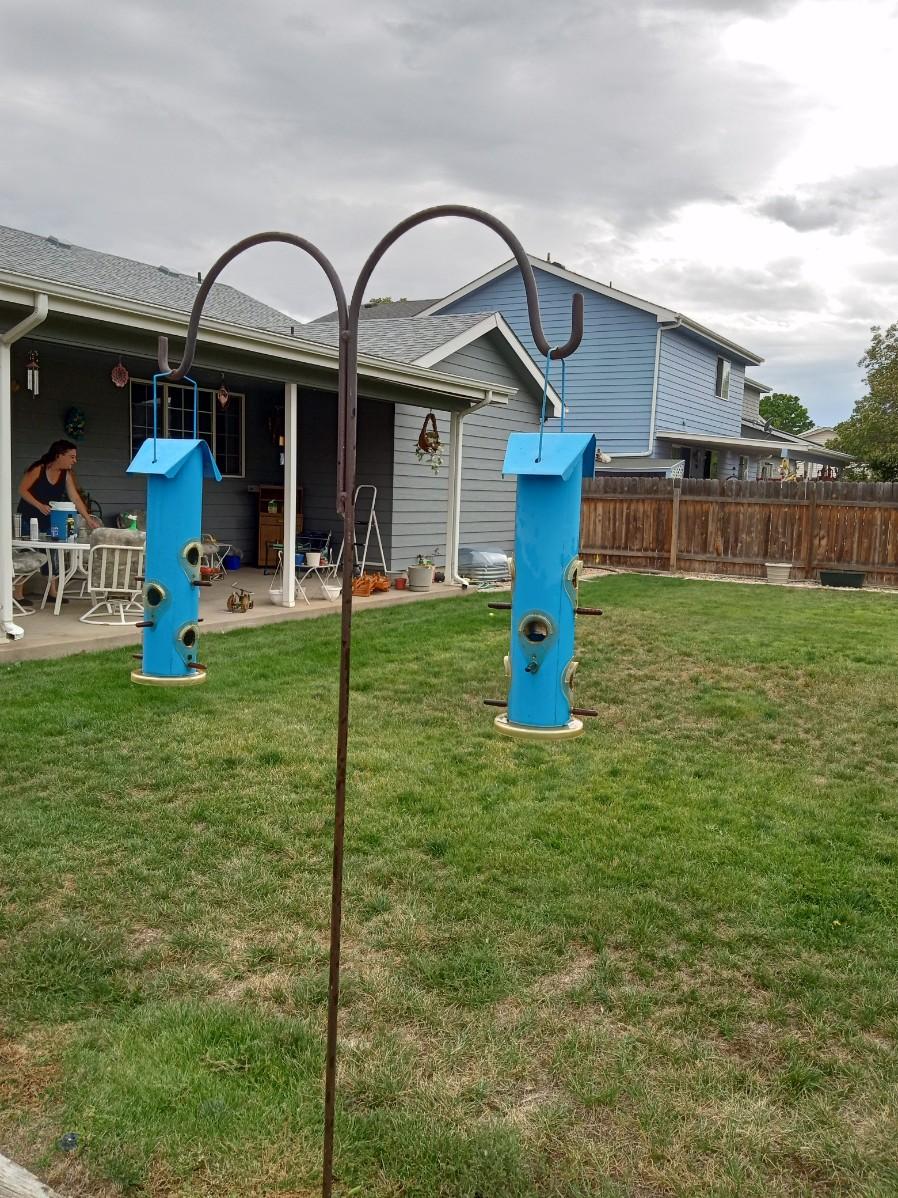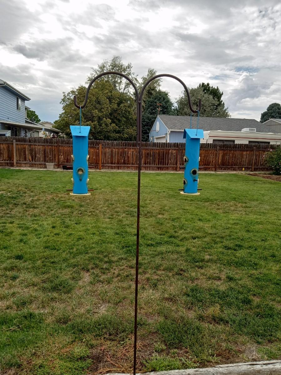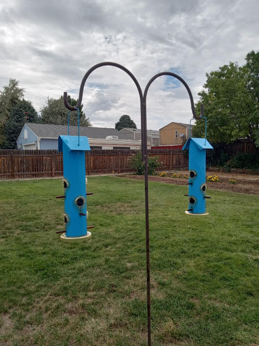 LOT 235 TWO METAL BIRD FEEDERS AND A DOUBLE SHEPHERDS HOOK