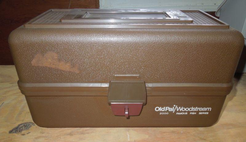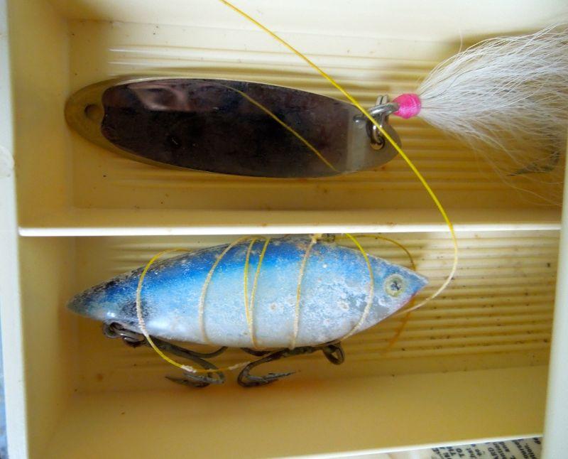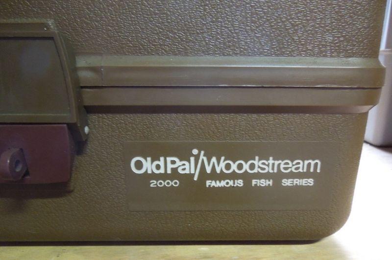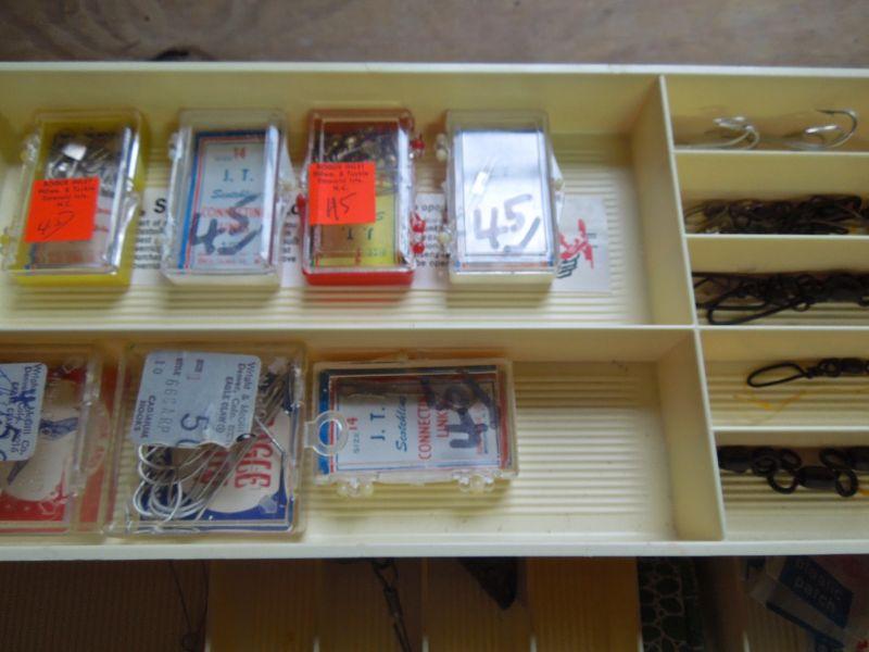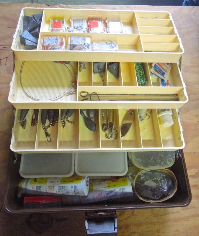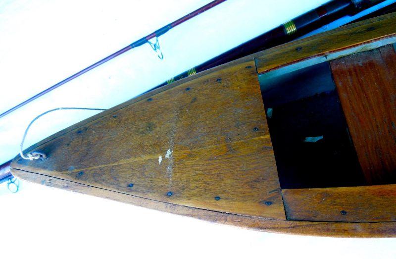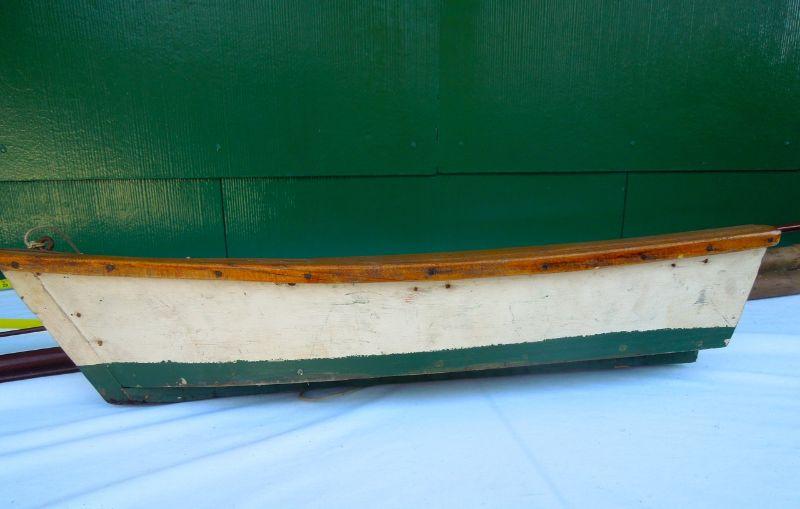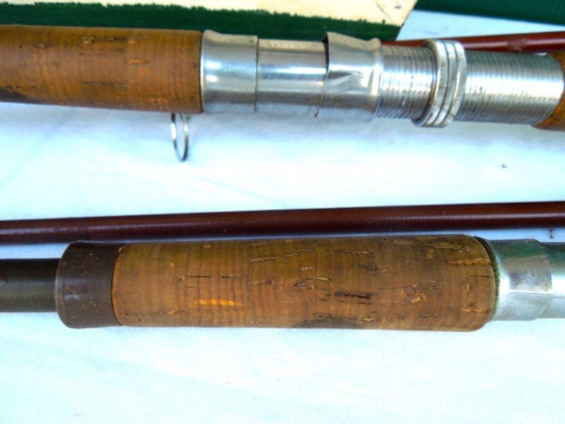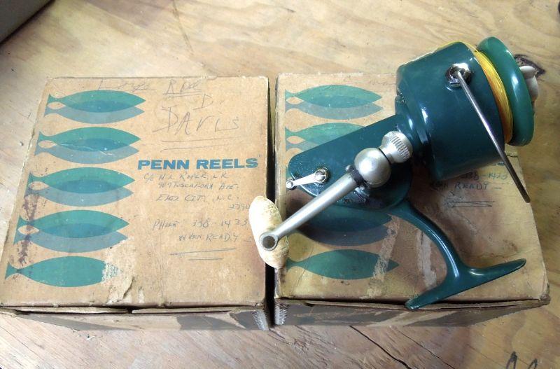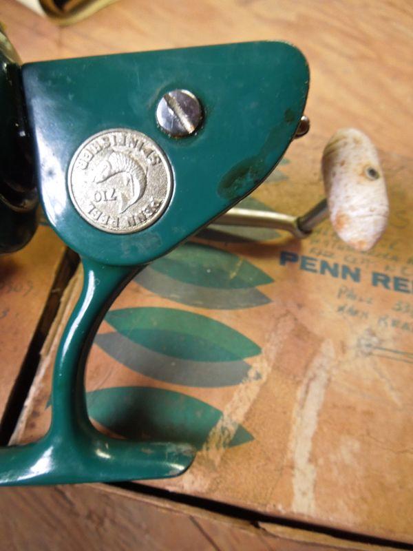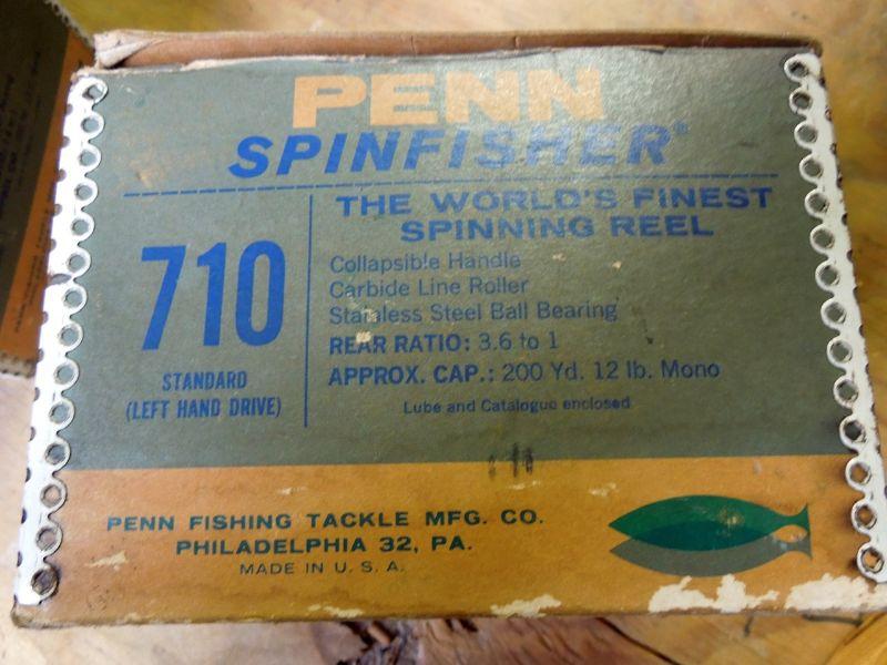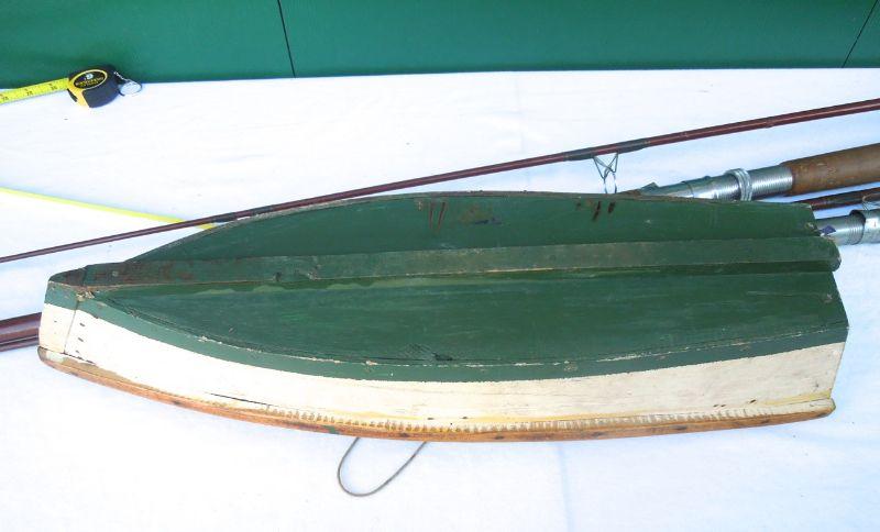 10 ft 6 in and an 8 ft fishing pole with cork handles by Berkely. A handmade wooden painted model of a Skiff dingy boat. Cork is in good condition. Two vintage Penn Open Fqce Reels Model 710 in original box and a plastic OldPal/Woodsman tackle box with tackle.