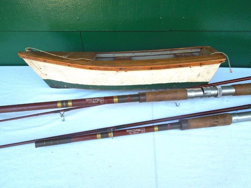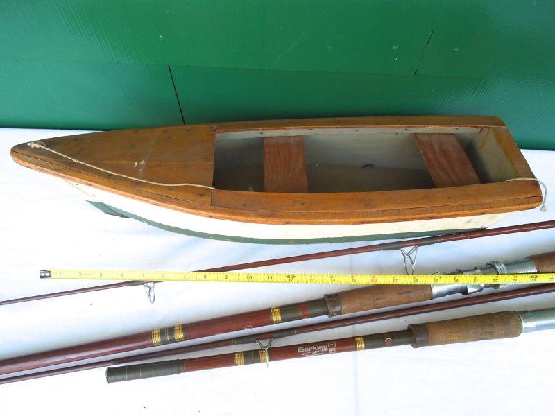 Lot 235: 2 Vintage Berkley Cork Fishing Poles, Penn Reels and Wood Model Skiff