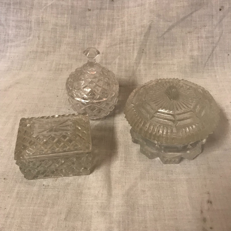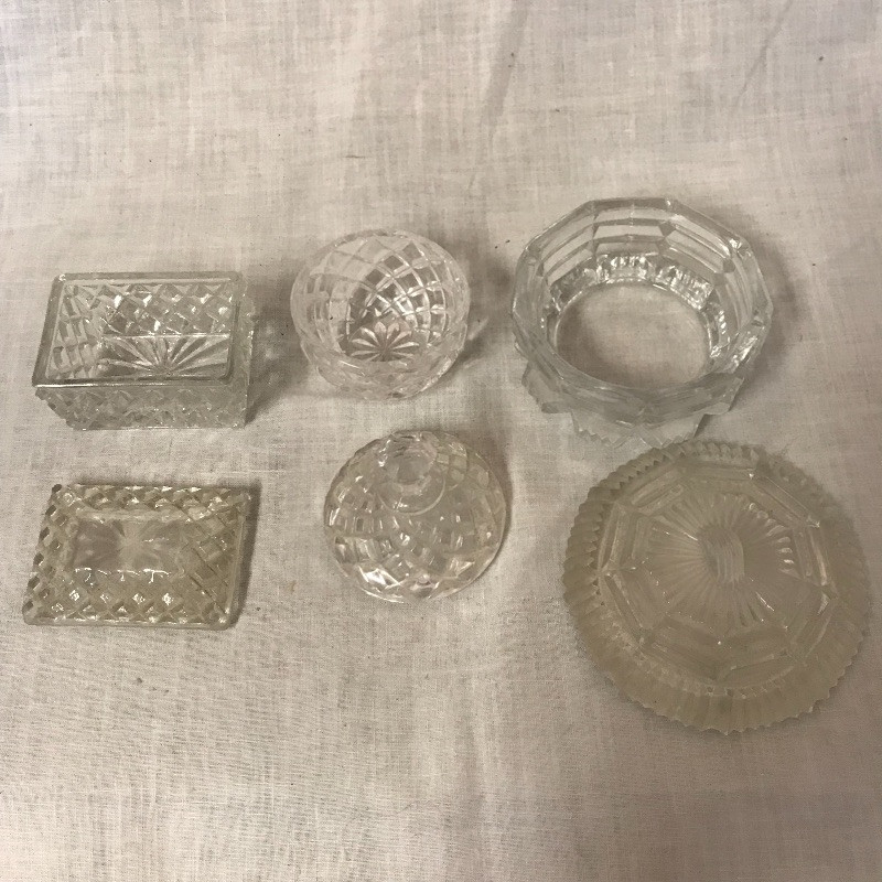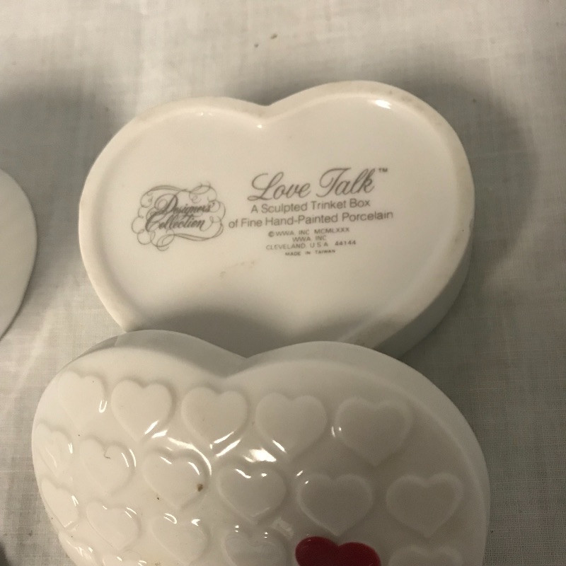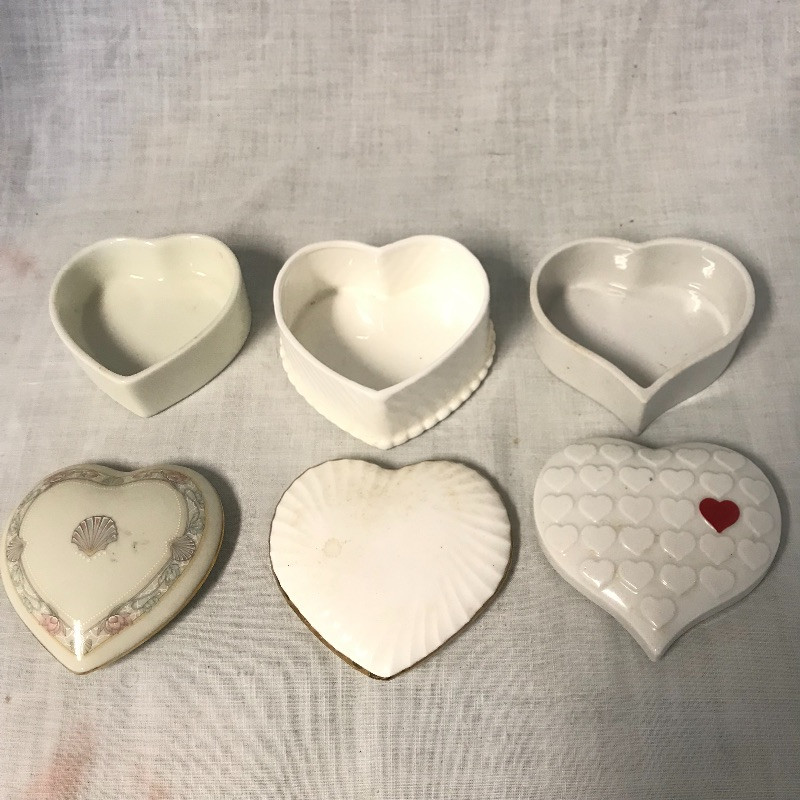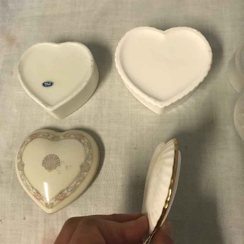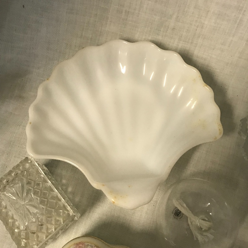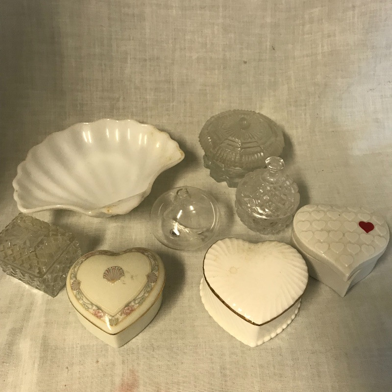 Romantic and quaint items here with this lovely collection that will brighten up your vanity. 7” shell dish appears to be milk glass with an assortment of glass and porcelain boxes. Two of the heart shaped boxes have gold trim and the other is marked Designers’ Collection. Lastly, an unused oil lamp globe. Local Pickup Only.