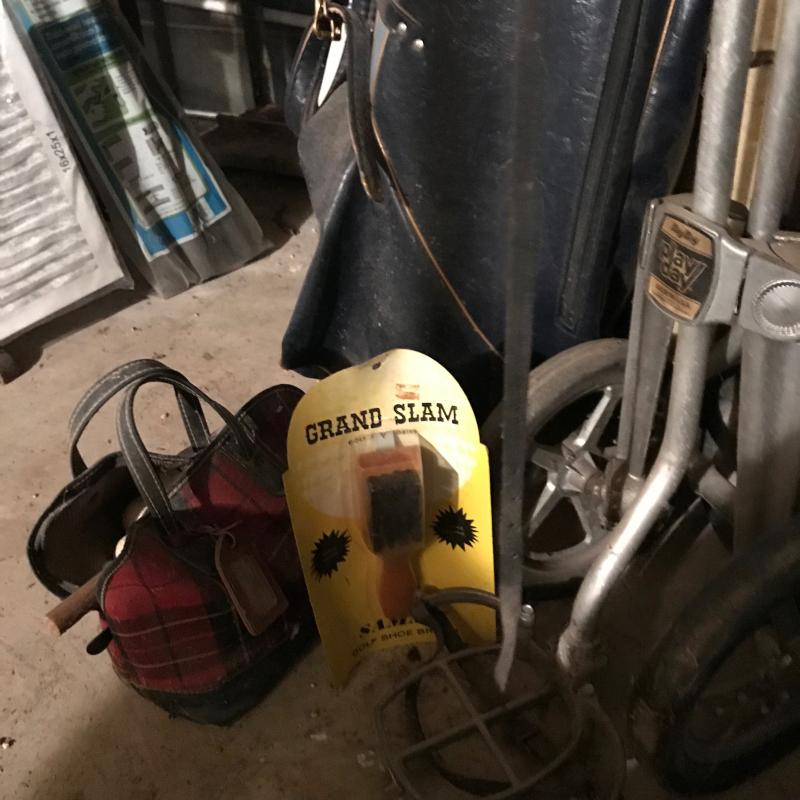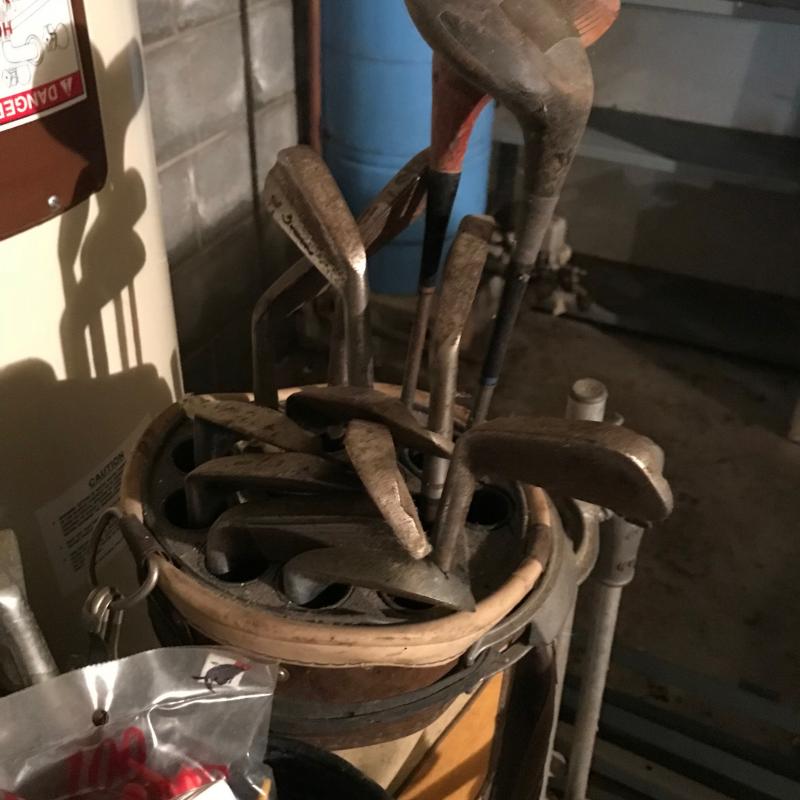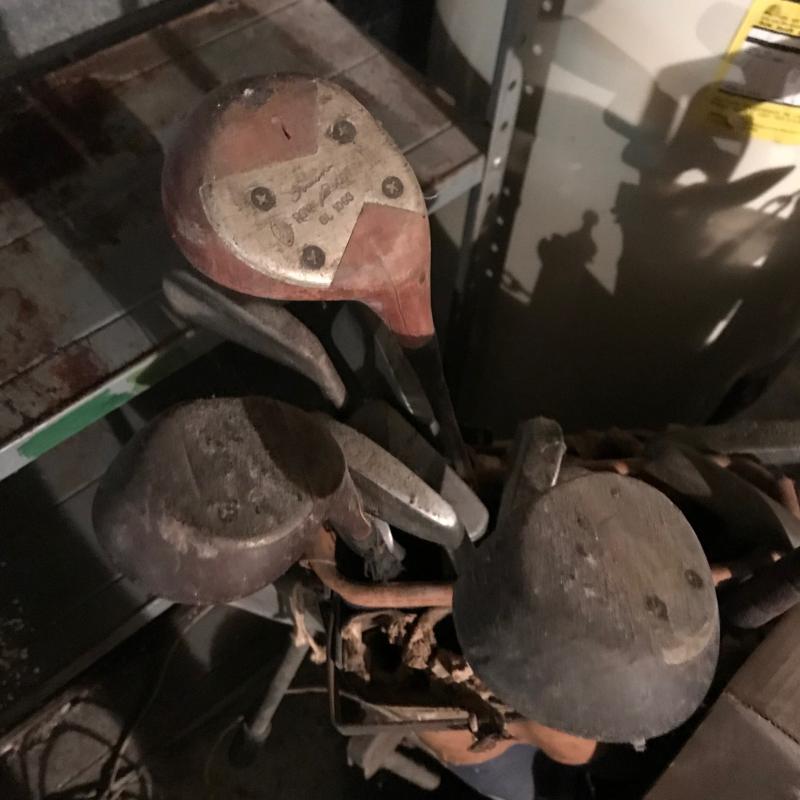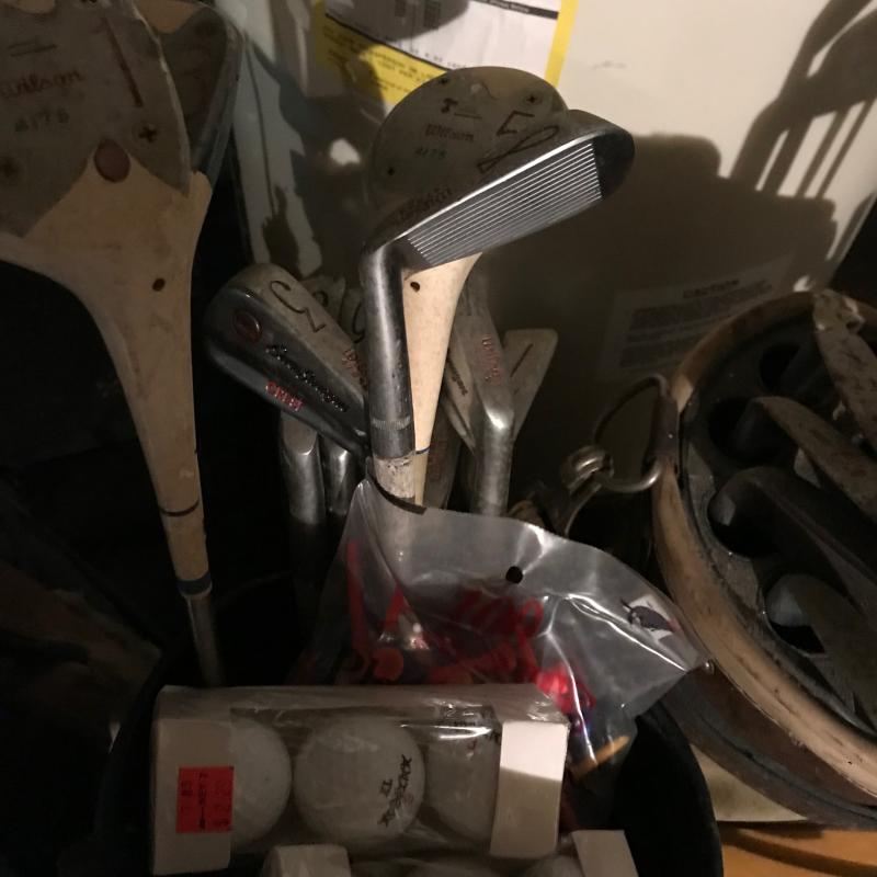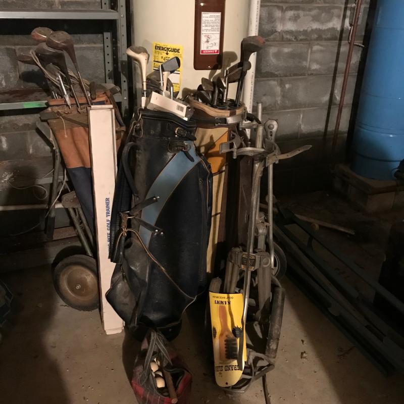 Three set of old golf clubs. One Wilson set. Wooden heads on woods. These clubs are old and need some love. Also includes three old bags, one rolling cart, a couple boxes of gold balls, a small bag full of old golf balls, and a Swing-rite golf trainer in box. No shipping. Local pick up only.