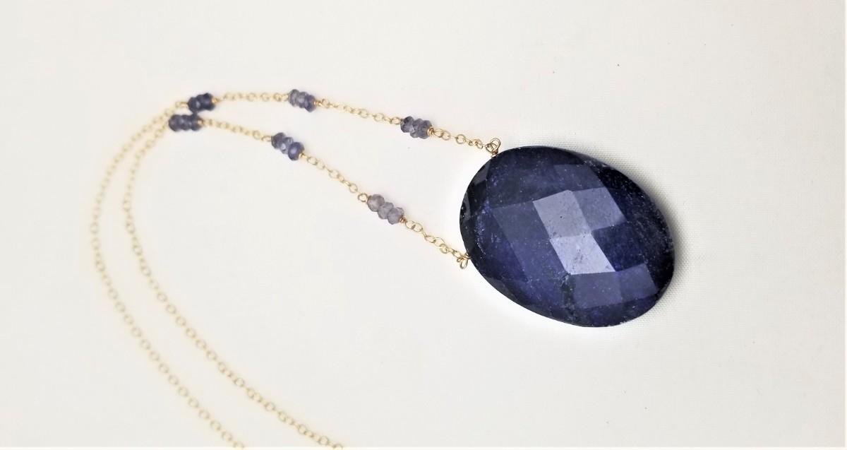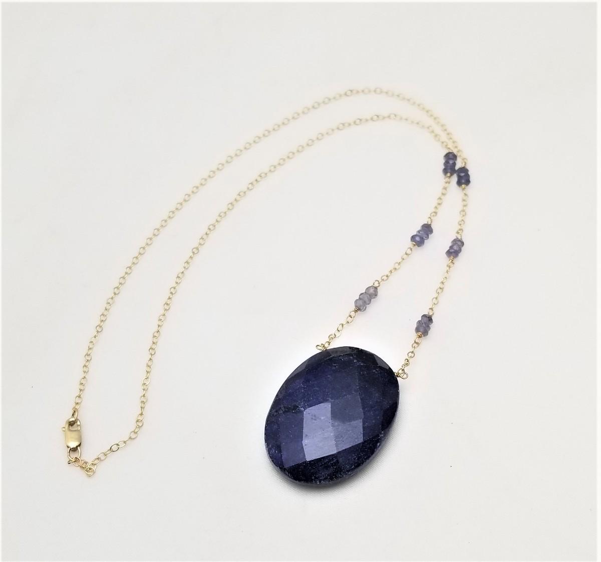 Large piece of faceted Lapis suspended from a delicate 14kt yellow gold chain. 22" long. Lapis measures 1.5" tall.