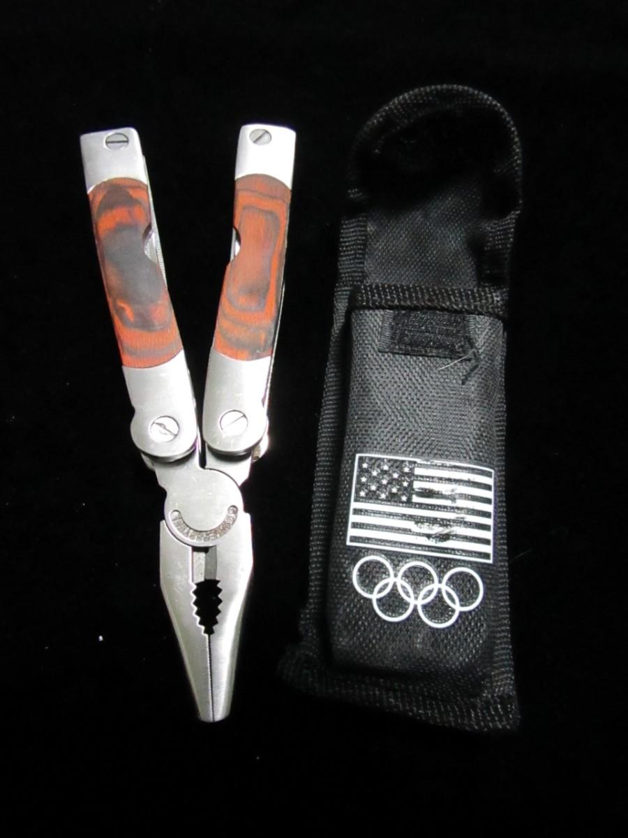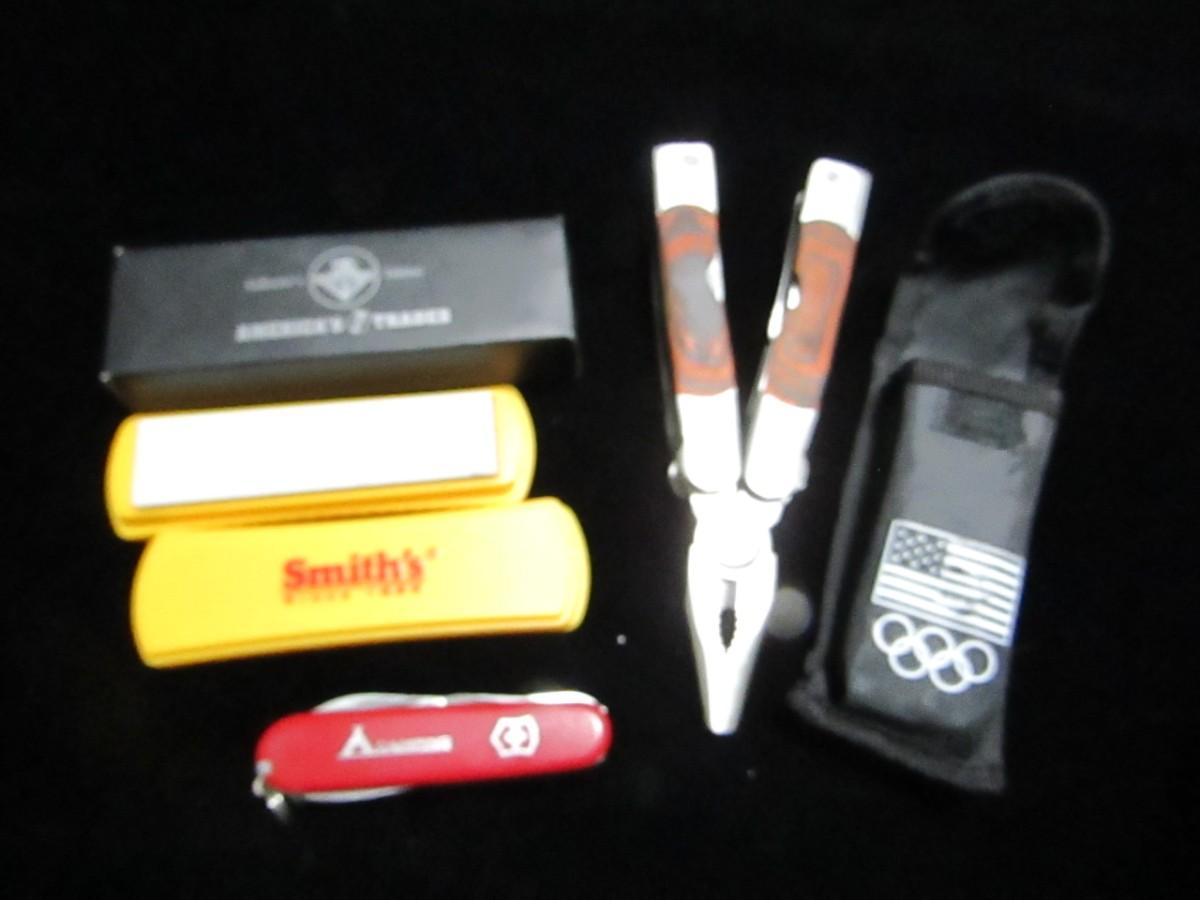 LEATHERMAN LIKE TOOL IN A NYLON SHEATH, MULTI-USE POCKET TOOL AND A SHARPENING STONE IN A PLASTIC CASE