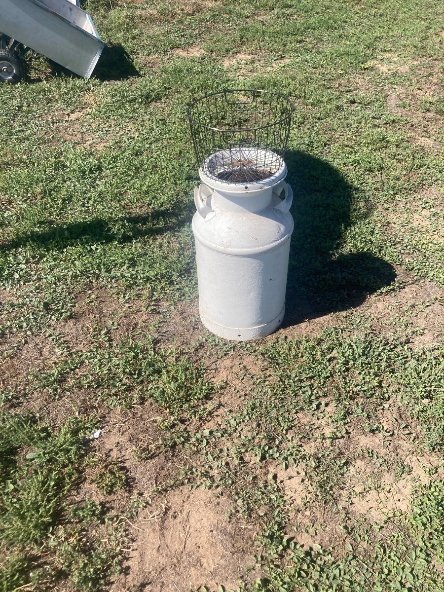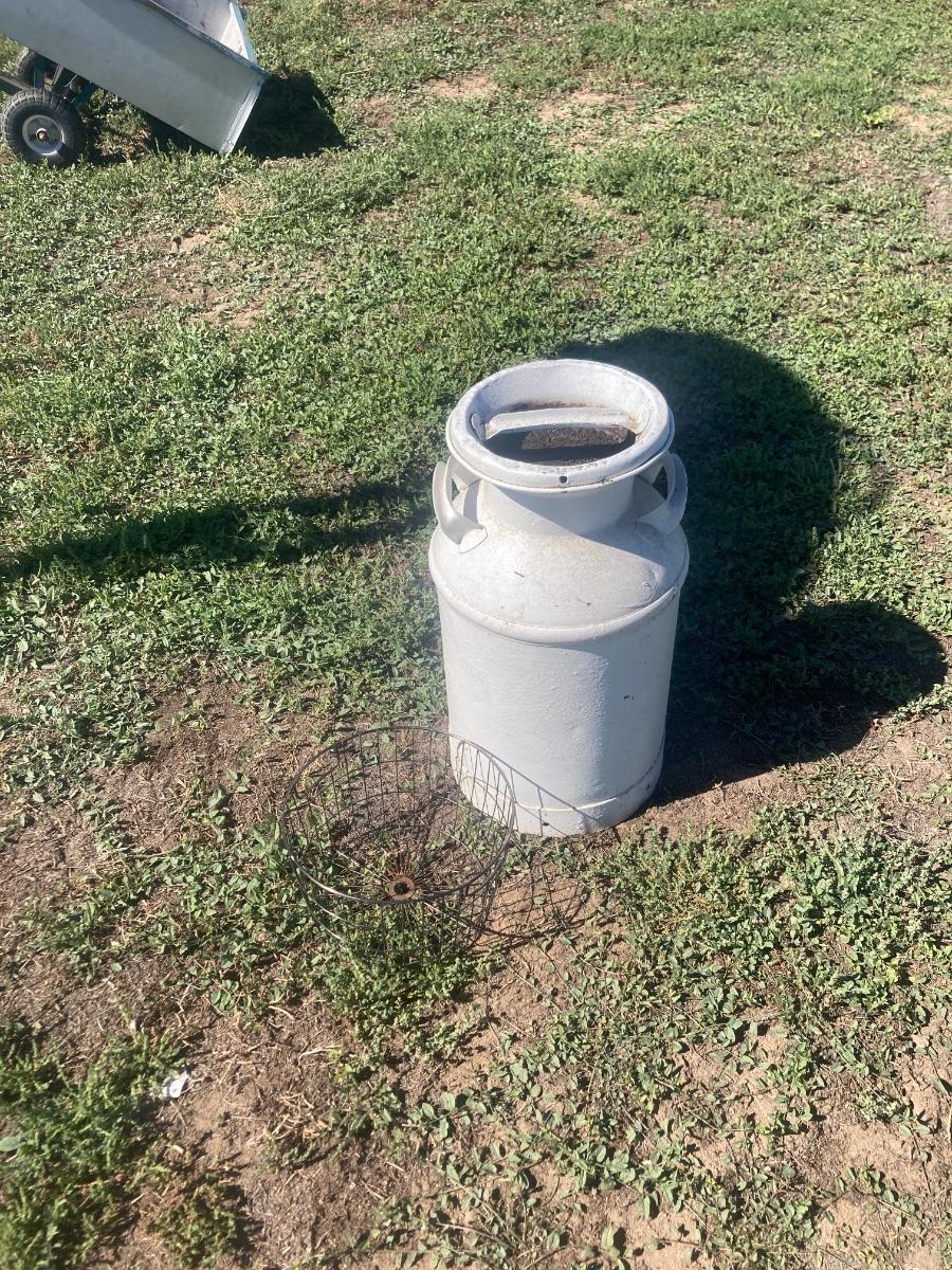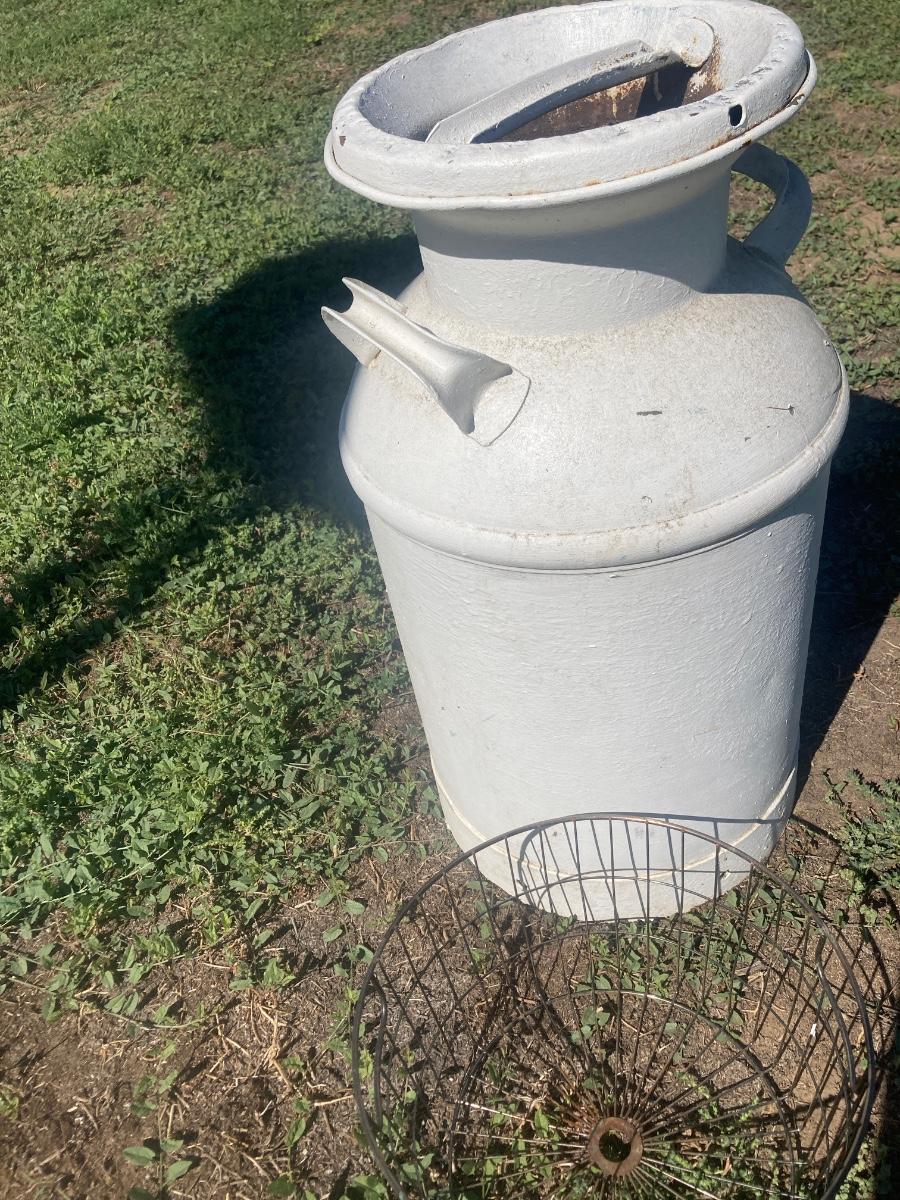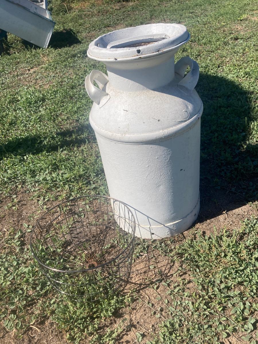 LOT 236 MILK CAN IN GOOD CONDITION  AND WIRE EGG BASKET (NF)