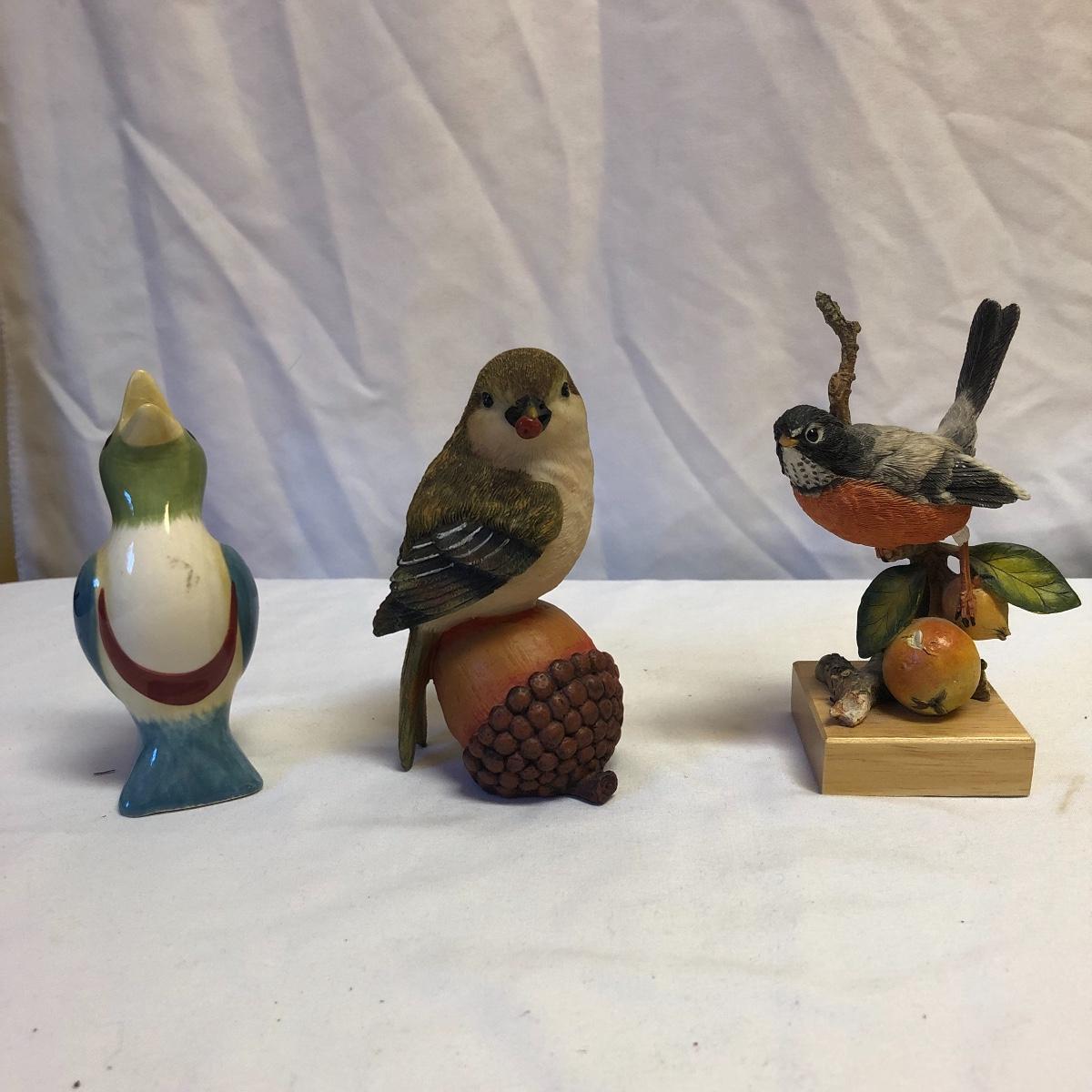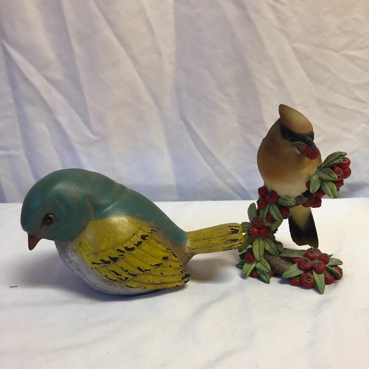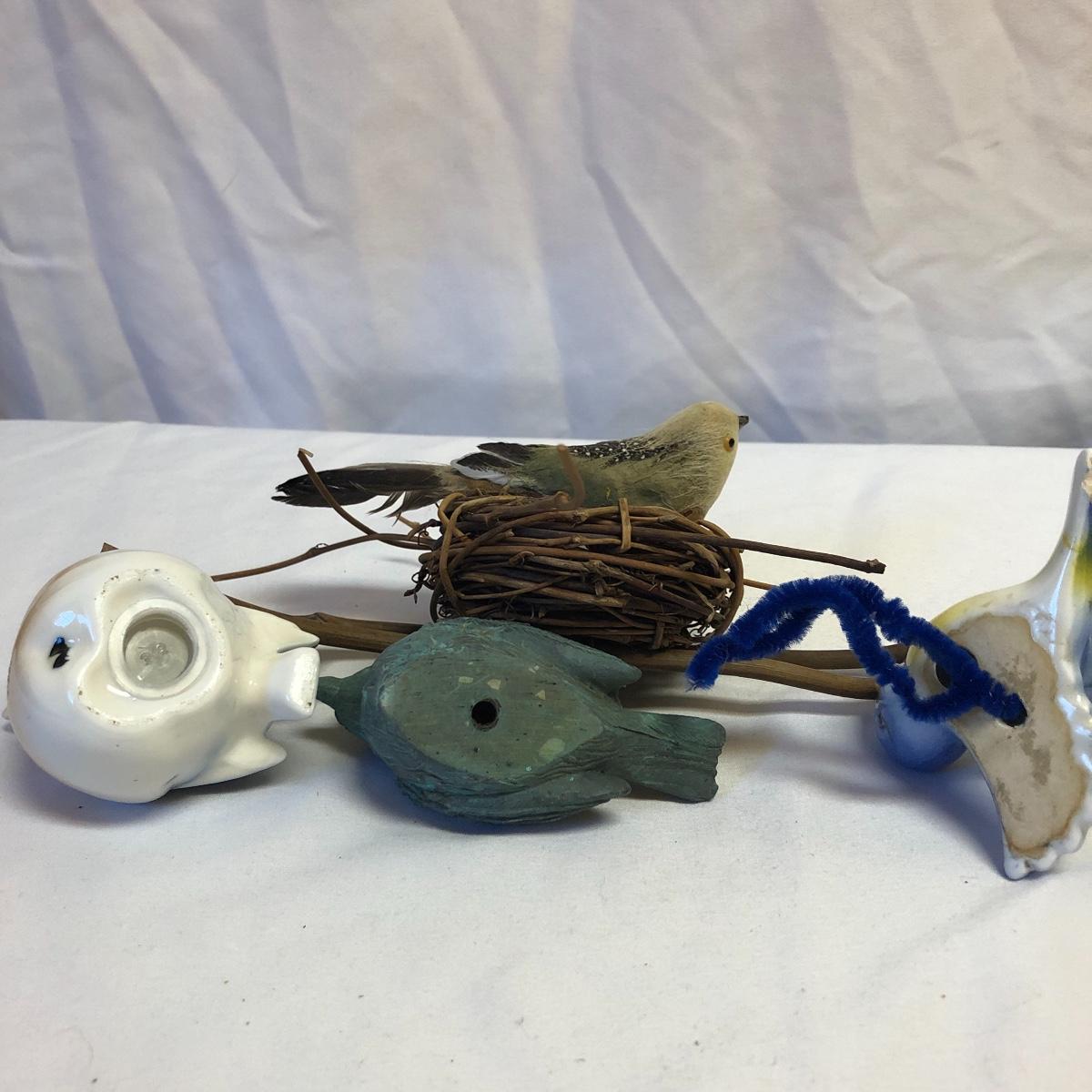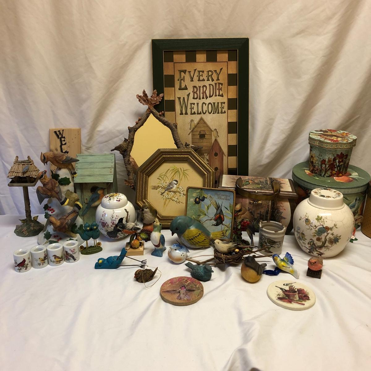 Ornithologists will be flying over to buy this bird lot! This lot includes framed art, cardboard boxes, figurines, ornaments, Ski Country bourbon bottle, two ginger jars, decoupage purse and more. Birds are made from porcelain, resin, wood and other materials. Largest frame measures 12” x 23”.
