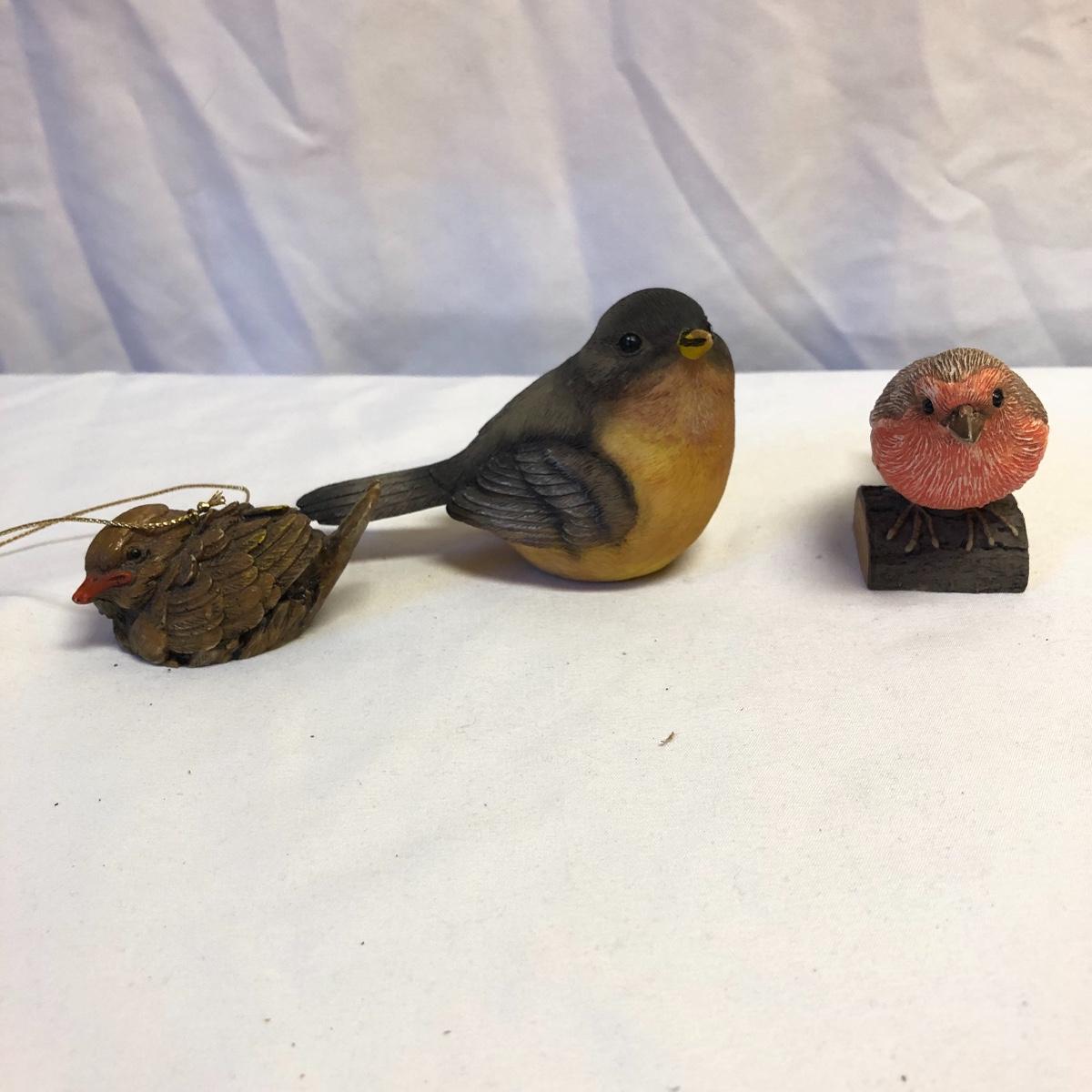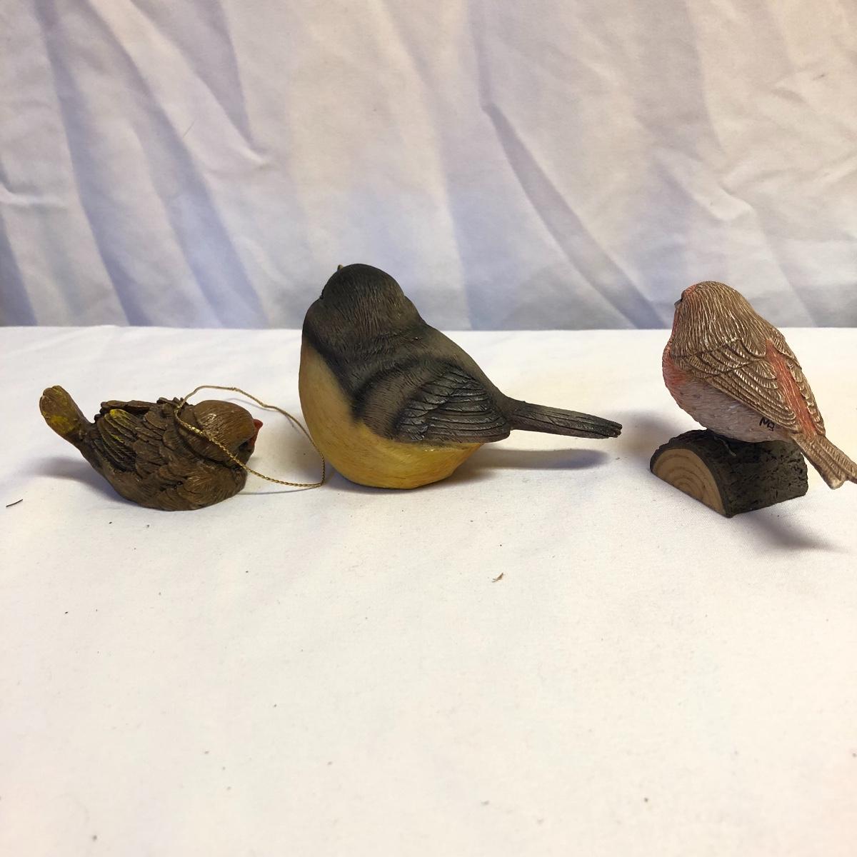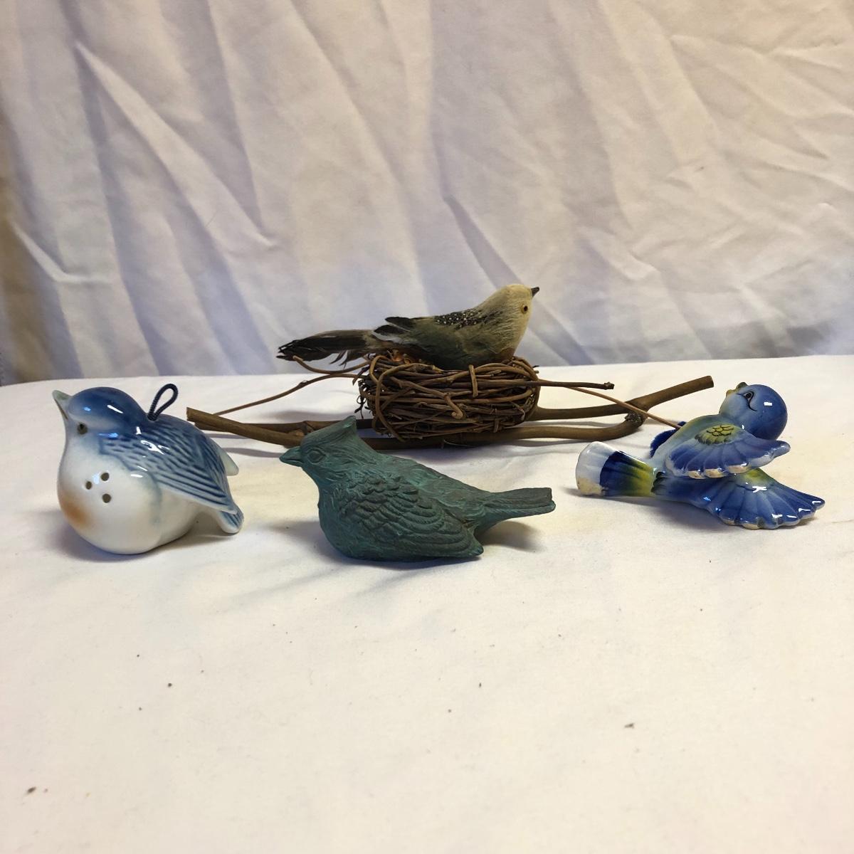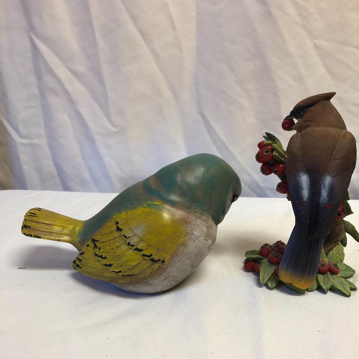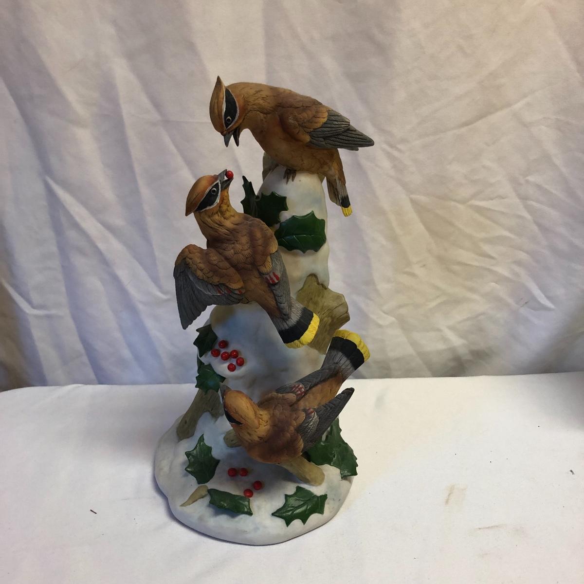 Ornithologists will be flying over to buy this bird lot! This lot includes framed art, cardboard boxes, figurines, ornaments, Ski Country bourbon bottle, two ginger jars, decoupage purse and more. Birds are made from porcelain, resin, wood and other materials. Largest frame measures 12” x 23”.