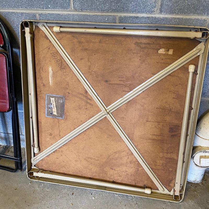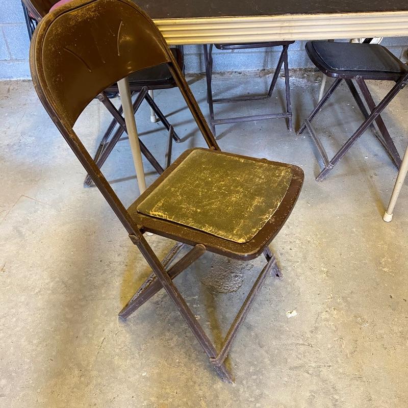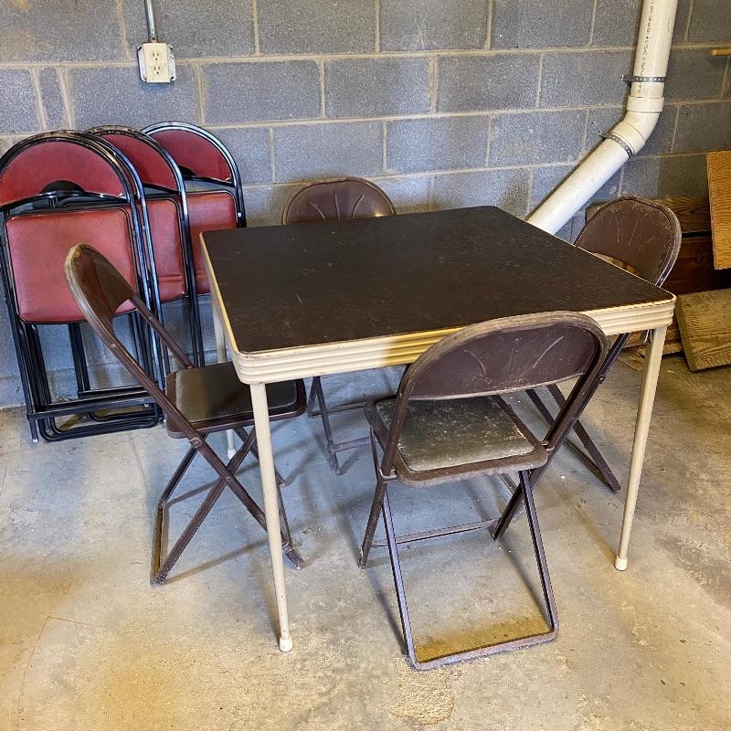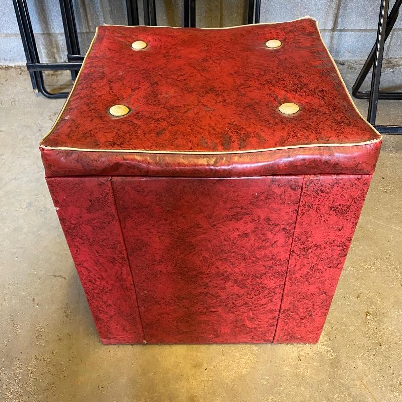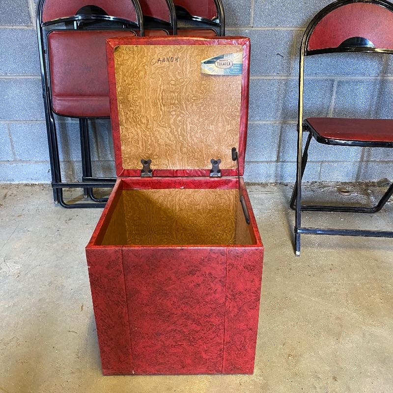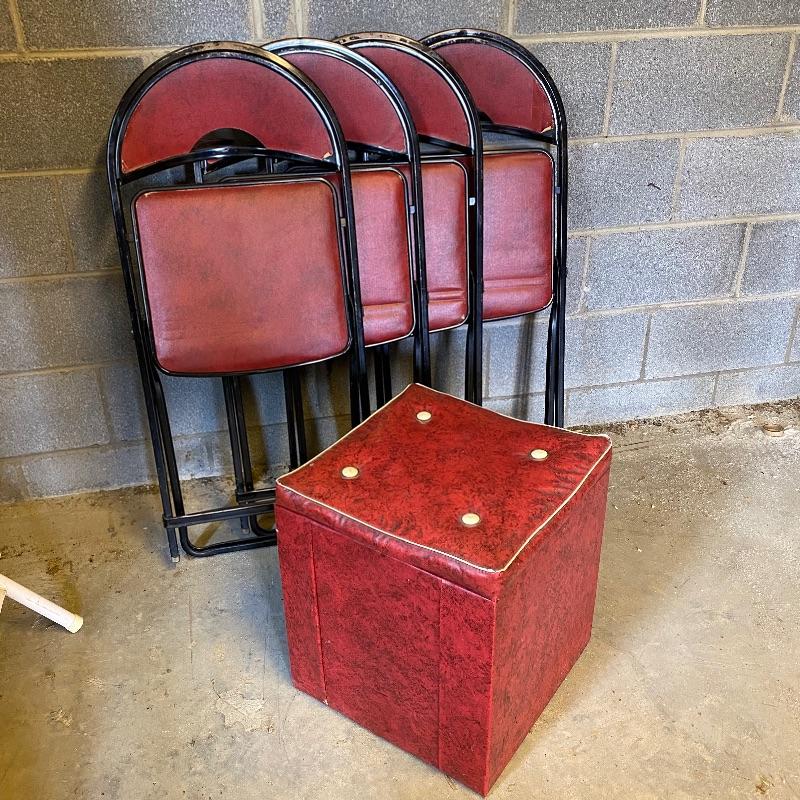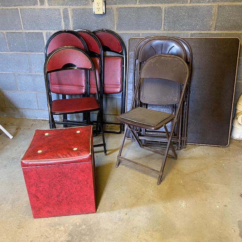 Some handy extra seating here for game night or dinner. There are two sets of four matching chairs. One black metal and red vinyl and the other brown metal with a green seat. The table has a brown vinyl top and folds for storage. Last you’ll find a cute red storage cube with white trim and details. Tag says it’s made with a latex rubberized curled Tampico pad. There is a faux wood interior. Cube measures 14.5” x 14.5” x 16” tall. The brown metal chairs open and close easily but are in rough shape with one missing a seat cushion and all metal worn down. Black ones are also a bit worn but not as bad. Red vinyl is coming off at parts. No shipping.