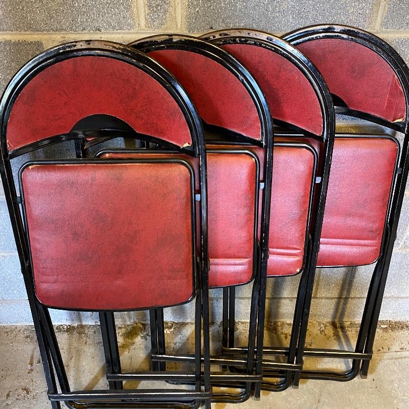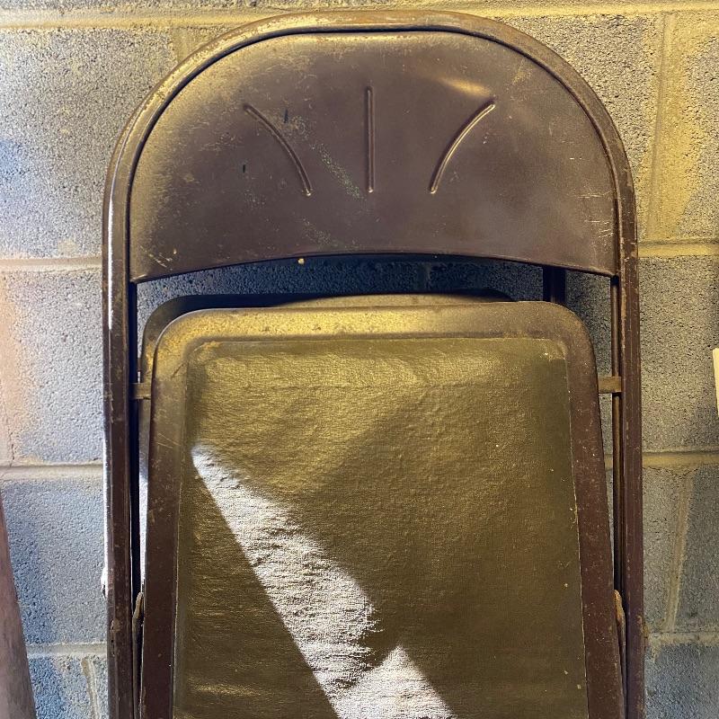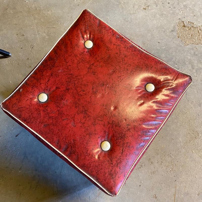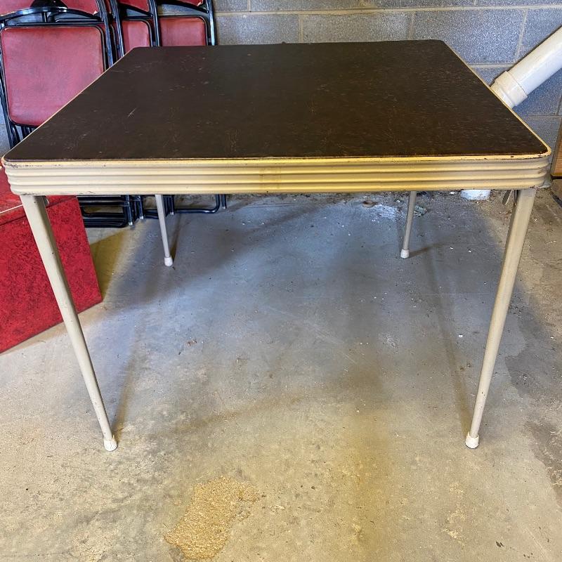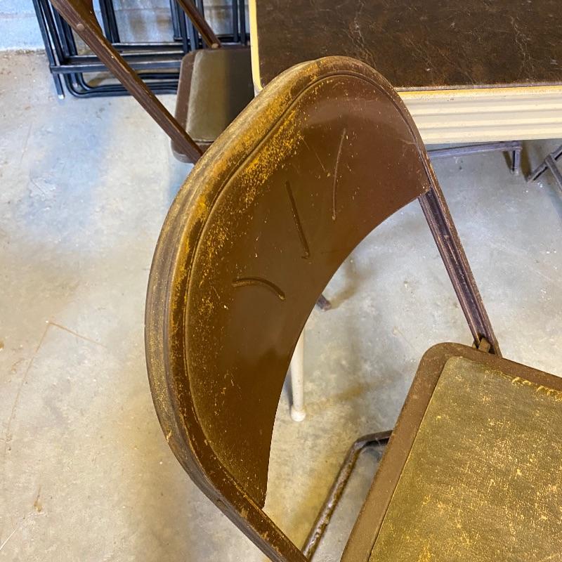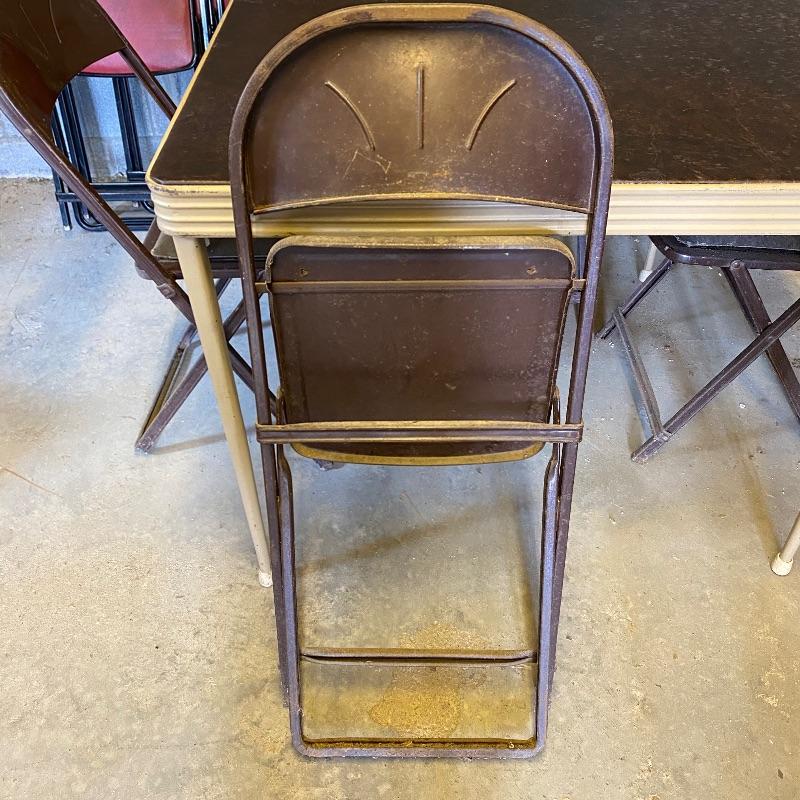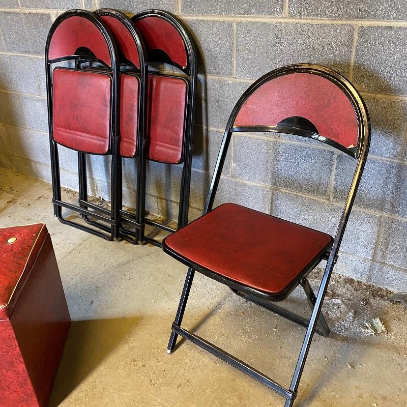 Some handy extra seating here for game night or dinner. There are two sets of four matching chairs. One black metal and red vinyl and the other brown metal with a green seat. The table has a brown vinyl top and folds for storage. Last you’ll find a cute red storage cube with white trim and details. Tag says it’s made with a latex rubberized curled Tampico pad. There is a faux wood interior. Cube measures 14.5” x 14.5” x 16” tall. The brown metal chairs open and close easily but are in rough shape with one missing a seat cushion and all metal worn down. Black ones are also a bit worn but not as bad. Red vinyl is coming off at parts. No shipping.