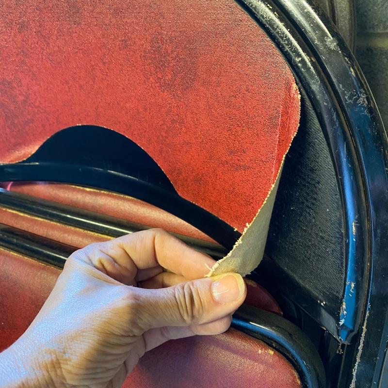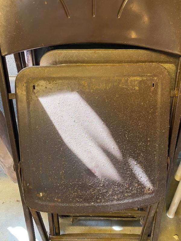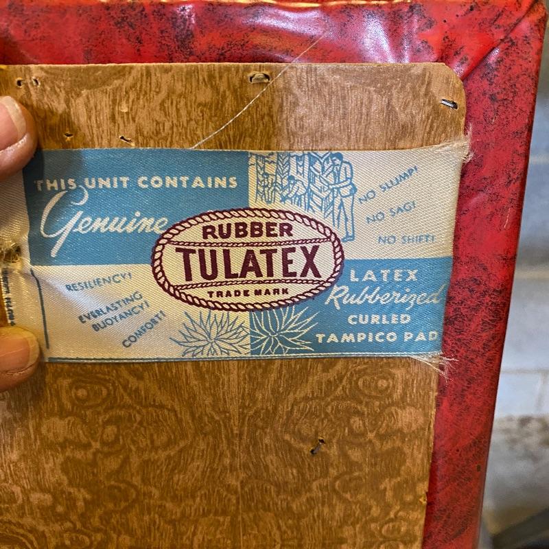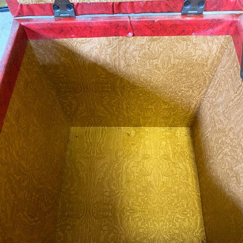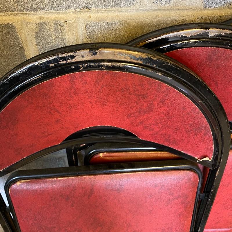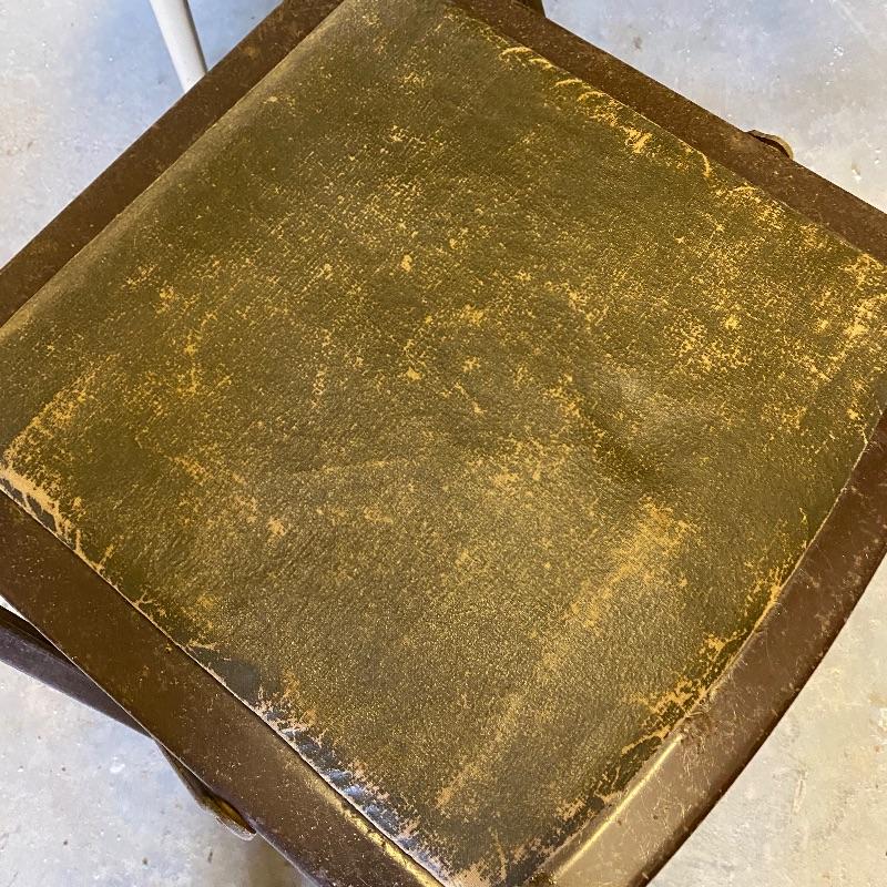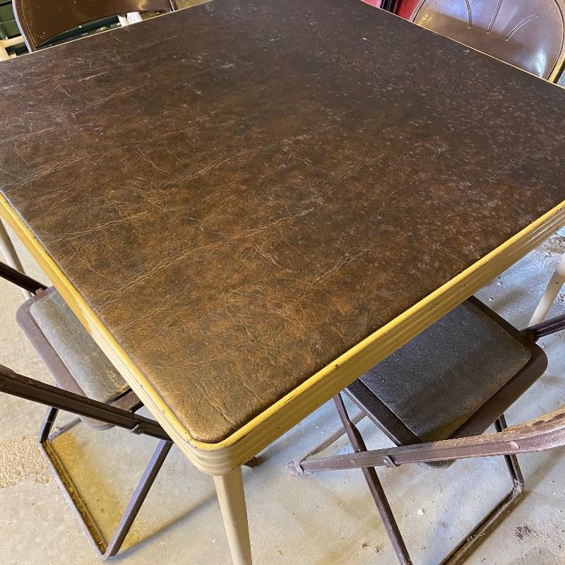 Some handy extra seating here for game night or dinner. There are two sets of four matching chairs. One black metal and red vinyl and the other brown metal with a green seat. The table has a brown vinyl top and folds for storage. Last you’ll find a cute red storage cube with white trim and details. Tag says it’s made with a latex rubberized curled Tampico pad. There is a faux wood interior. Cube measures 14.5” x 14.5” x 16” tall. The brown metal chairs open and close easily but are in rough shape with one missing a seat cushion and all metal worn down. Black ones are also a bit worn but not as bad. Red vinyl is coming off at parts. No shipping.