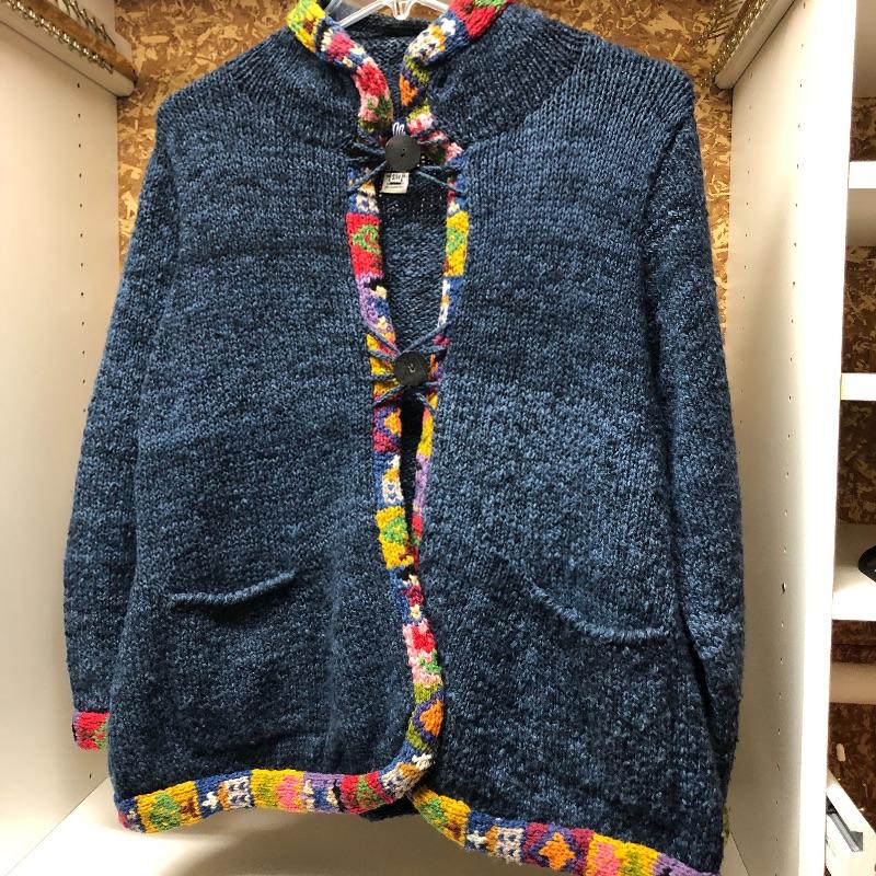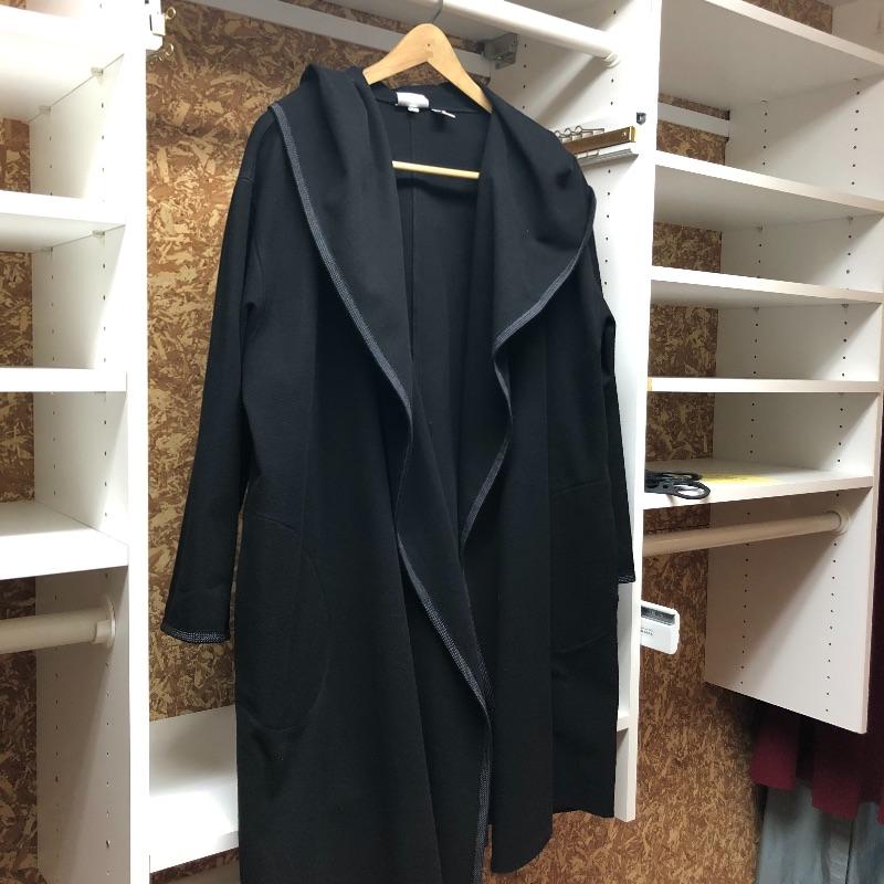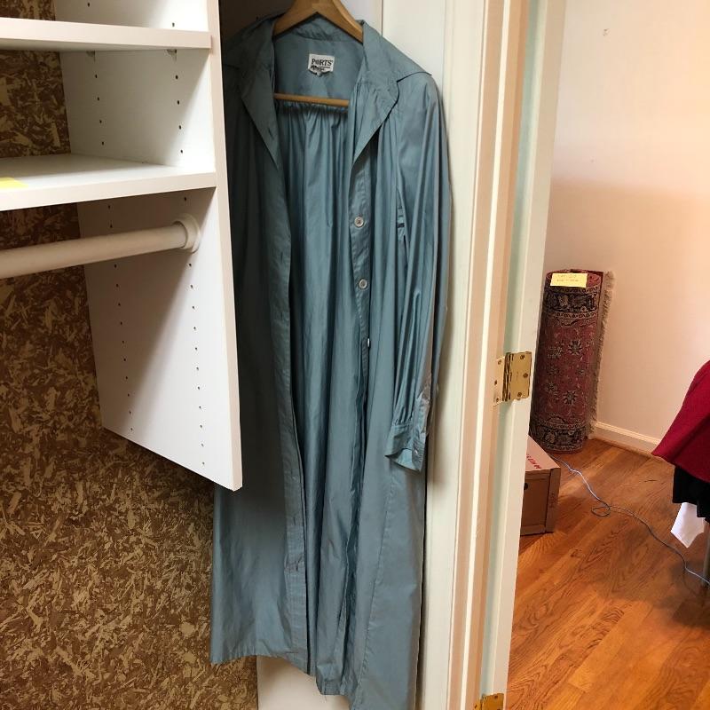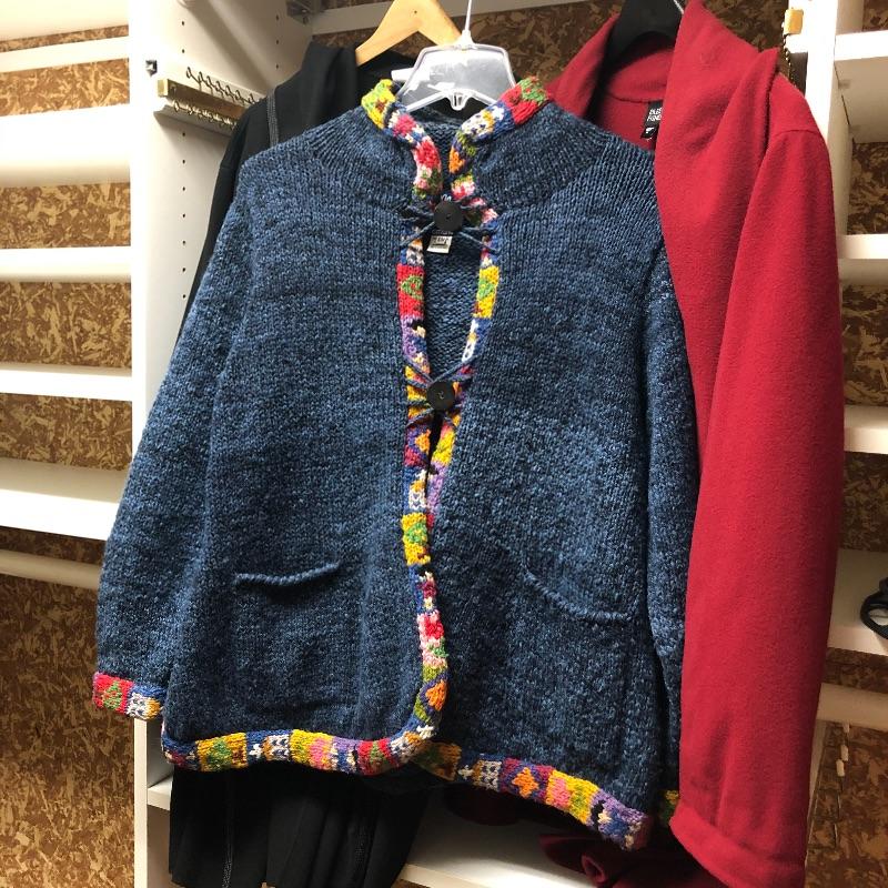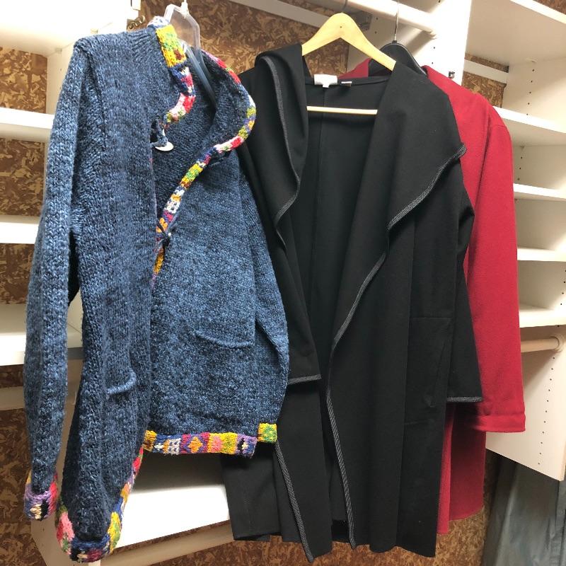 The red Eileen Fischer wool coat is size medium and is virgin wool with 10% cashmere. The black coat is a Chico’s size small but it could easily be considered a medium as it’s an oversized style jacket. Also included is an attractive blue cardigan, a long blue housecoat, a pair of shoe grips and a pair of black rain boots by Trotters in size 9.