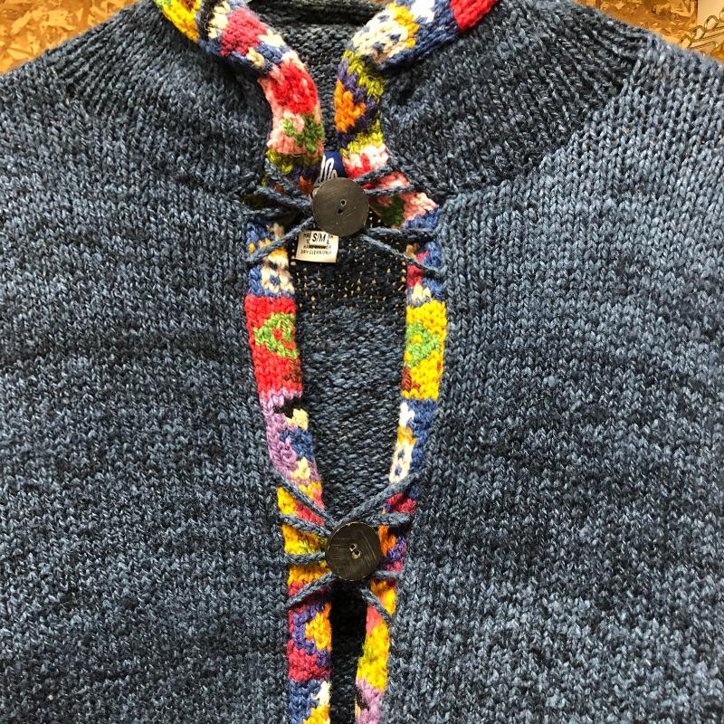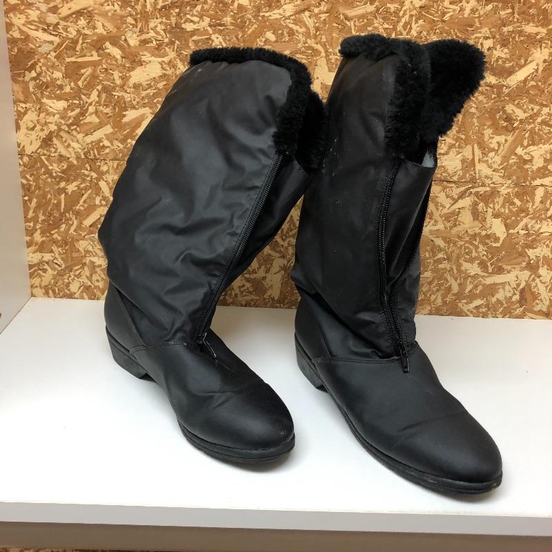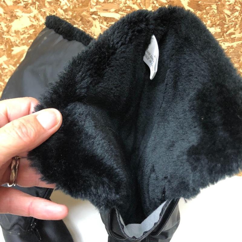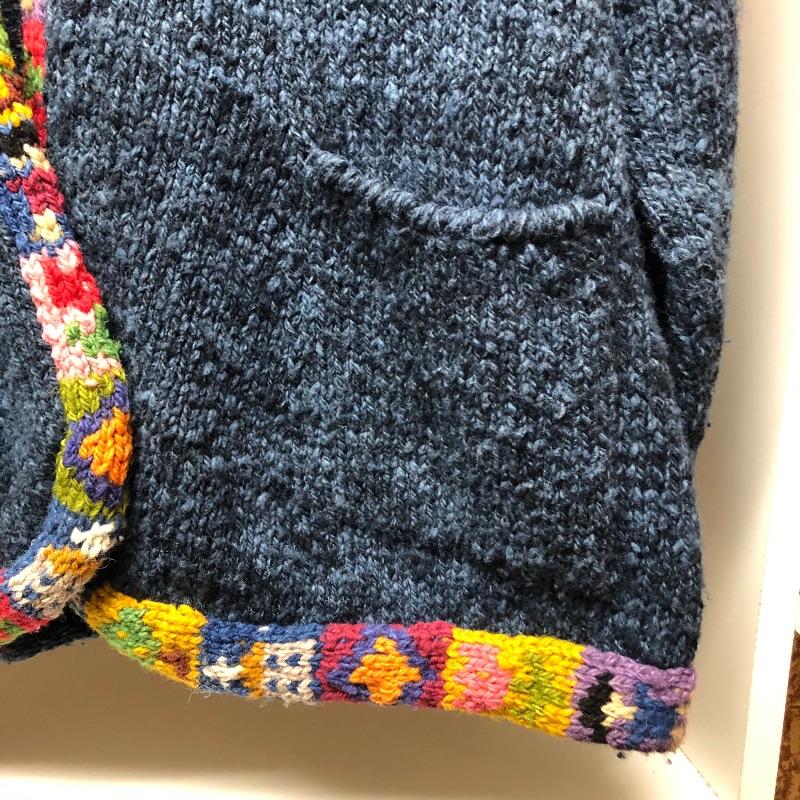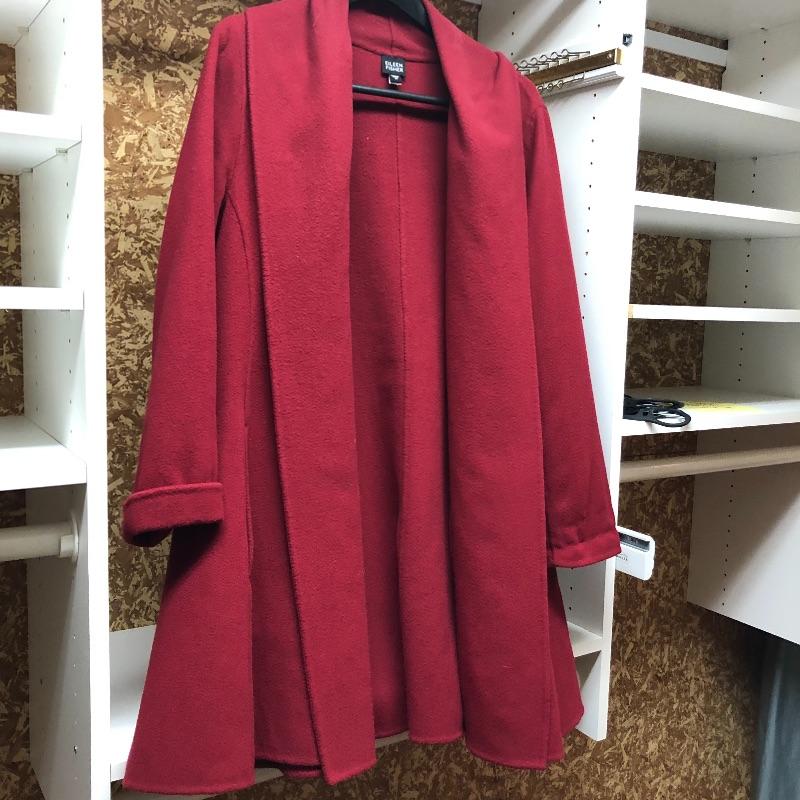 The red Eileen Fischer wool coat is size medium and is virgin wool with 10% cashmere. The black coat is a Chico’s size small but it could easily be considered a medium as it’s an oversized style jacket. Also included is an attractive blue cardigan, a long blue housecoat, a pair of shoe grips and a pair of black rain boots by Trotters in size 9.
