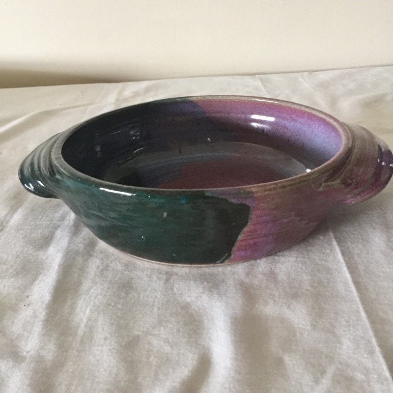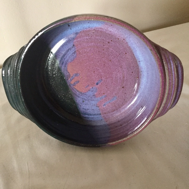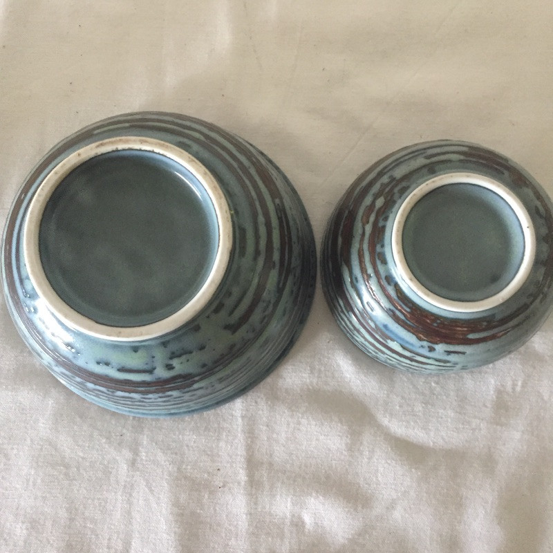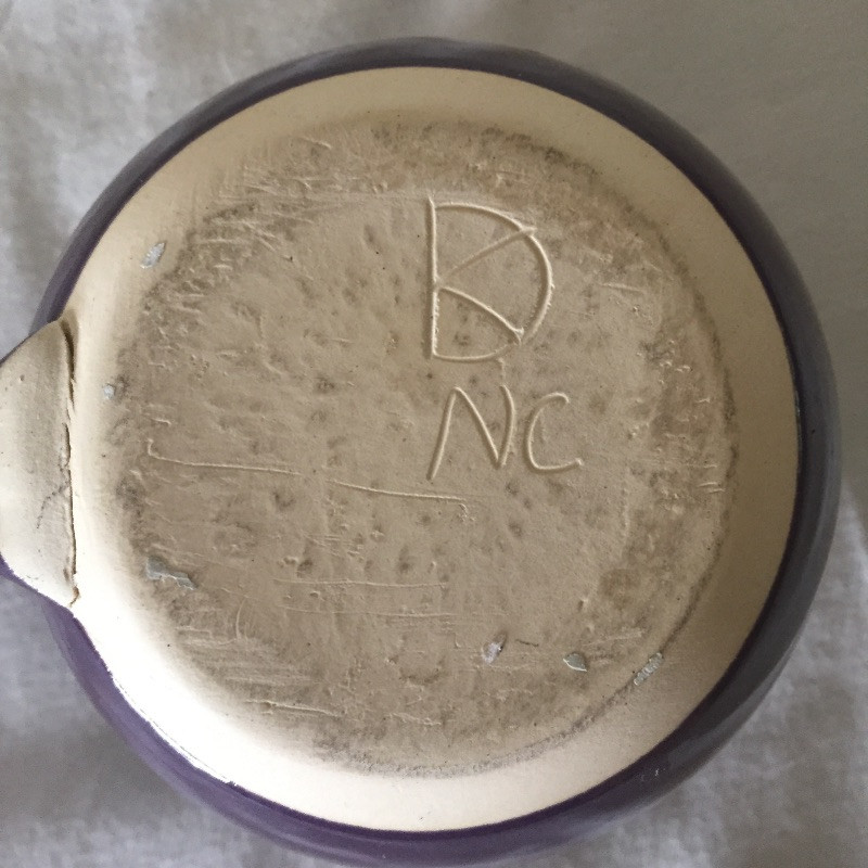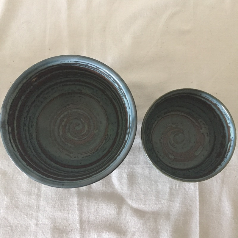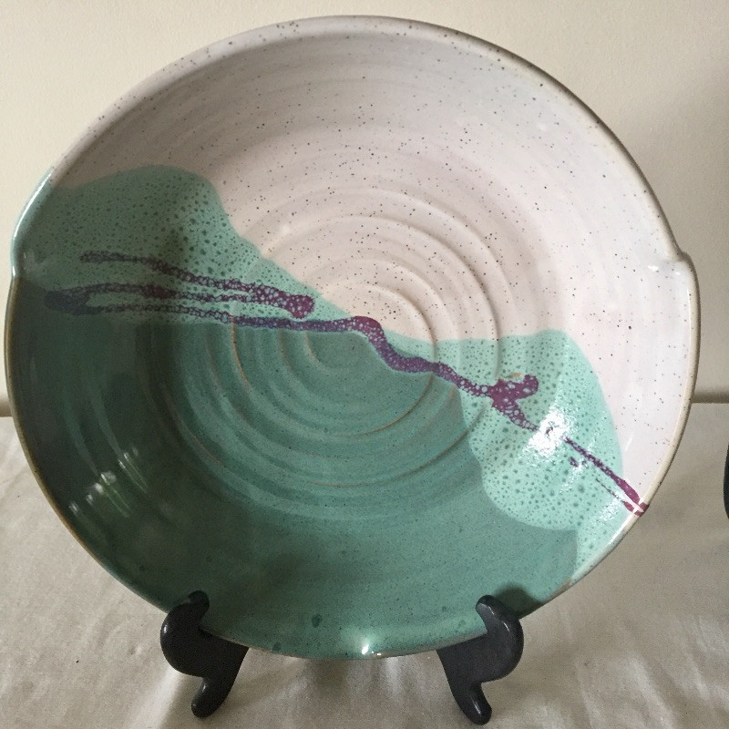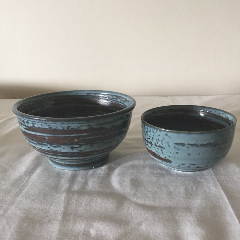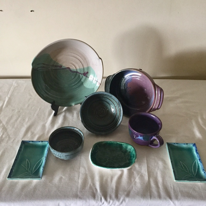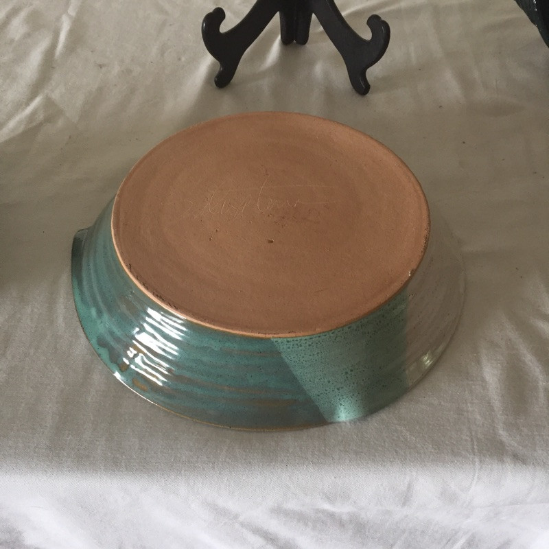 Lots of lovely pottery in a nice variety of shapes and sizes and some are N.C made, eight pieces total. See images for all pieces. The largest bowl is signed and is a two tone turquoise and cream and is 12” across. The two blue and copper bowls are matching.