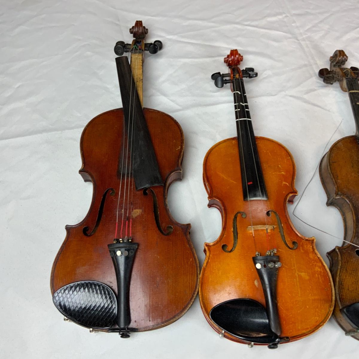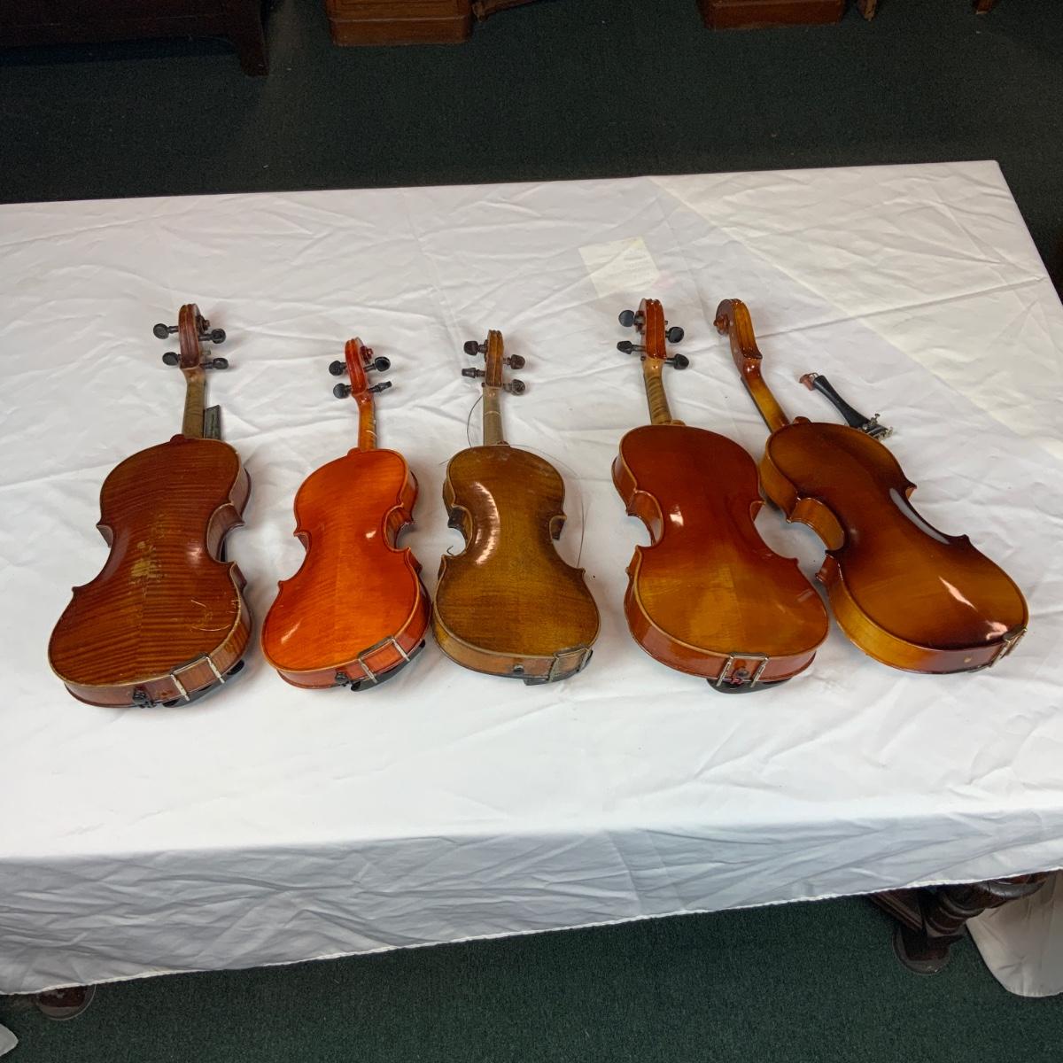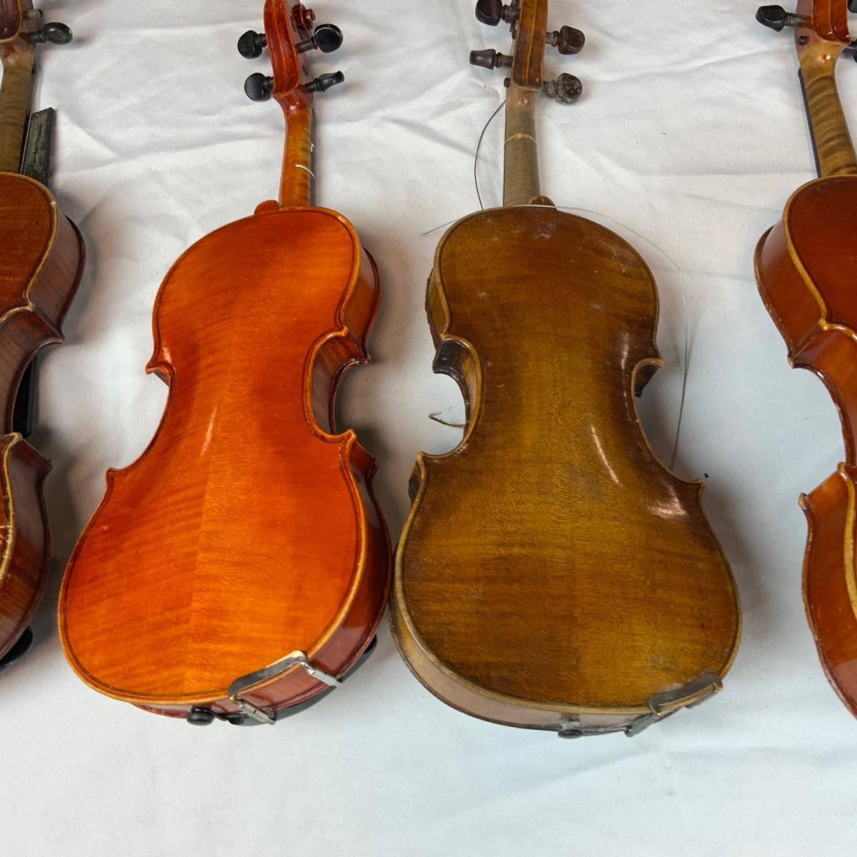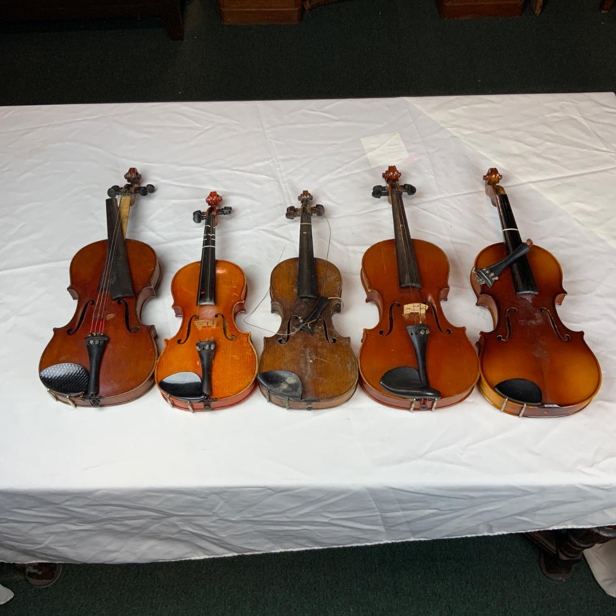 Five Wall-Hanger Violins with Cases. Five nice violins for artwork or Decour purposes. Each of them come with their own case. //::\\ Please see photos for details and condition. No attempt has been made to hide any imperfections. All items listed in this auction are warehouse items, and need to be cleaned. A majority of the items need restoration as well. All items are sold AS IS and WITHOUT GUARANTEE. If you are uncertain about an item, DO NOT BID. Due to the nature of this online auction in-person inspection is HIGHLY recommended. All Sales are FINAL. Pick Up Times are FIRM. Please confirm with your own schedule that you can pick up in the scheduled times listed in the Terms and Conditions. Any questions please message the auctioneer. DO NOT Contact The Harp Gallery.