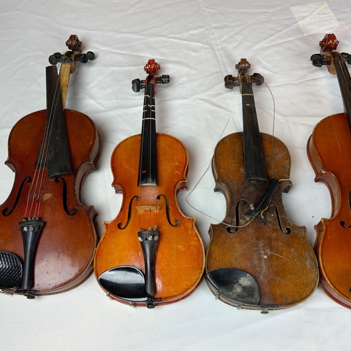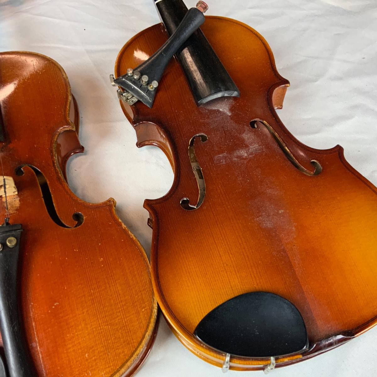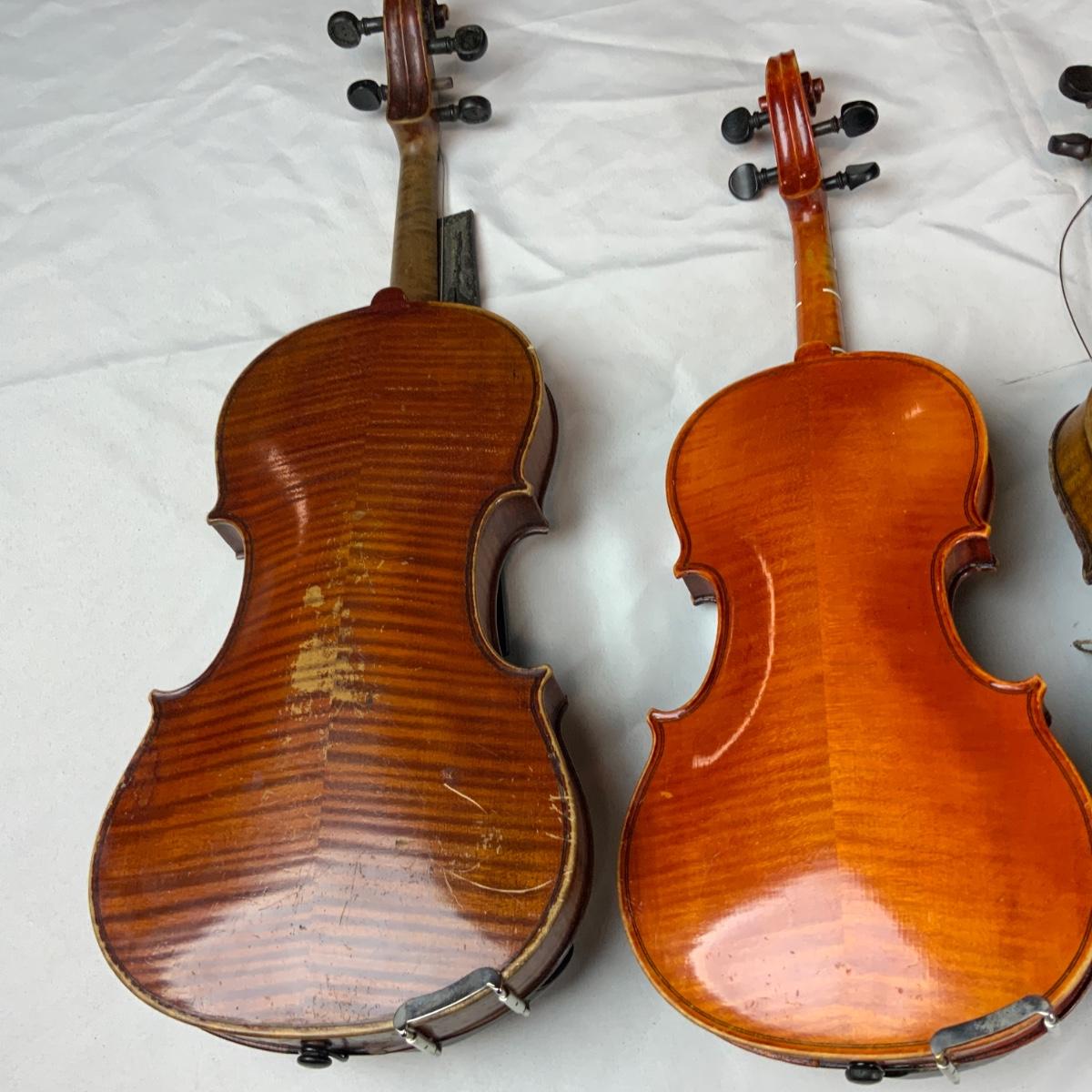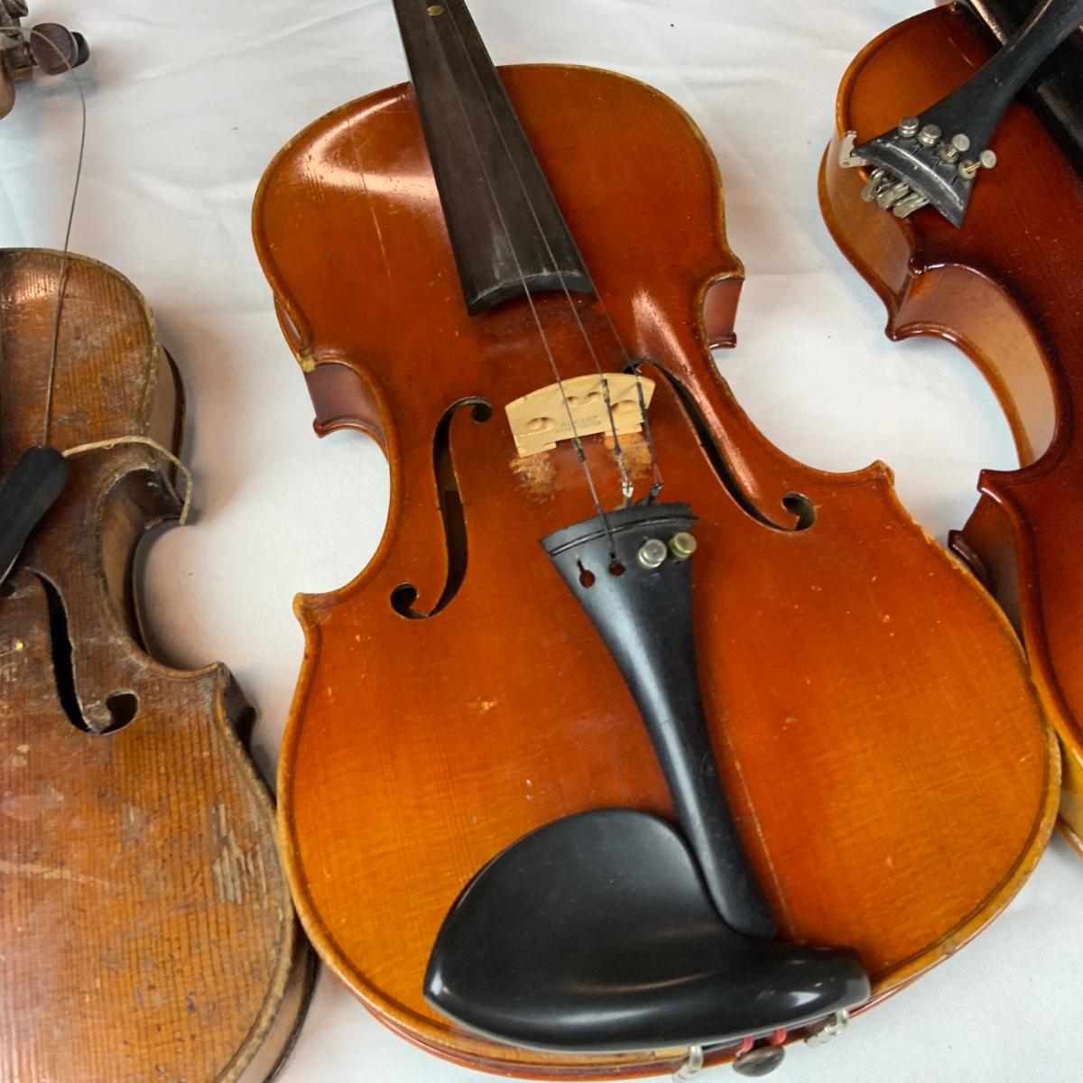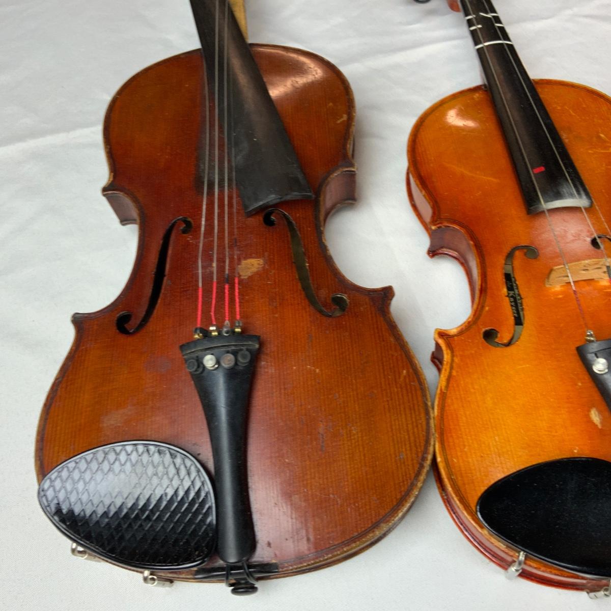 Five Wall-Hanger Violins with Cases. Five nice violins for artwork or Decour purposes. Each of them come with their own case. //::\\ Please see photos for details and condition. No attempt has been made to hide any imperfections. All items listed in this auction are warehouse items, and need to be cleaned. A majority of the items need restoration as well. All items are sold AS IS and WITHOUT GUARANTEE. If you are uncertain about an item, DO NOT BID. Due to the nature of this online auction in-person inspection is HIGHLY recommended. All Sales are FINAL. Pick Up Times are FIRM. Please confirm with your own schedule that you can pick up in the scheduled times listed in the Terms and Conditions. Any questions please message the auctioneer. DO NOT Contact The Harp Gallery.
