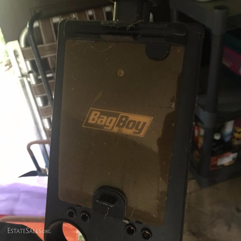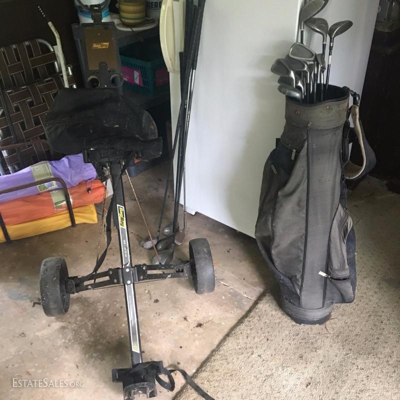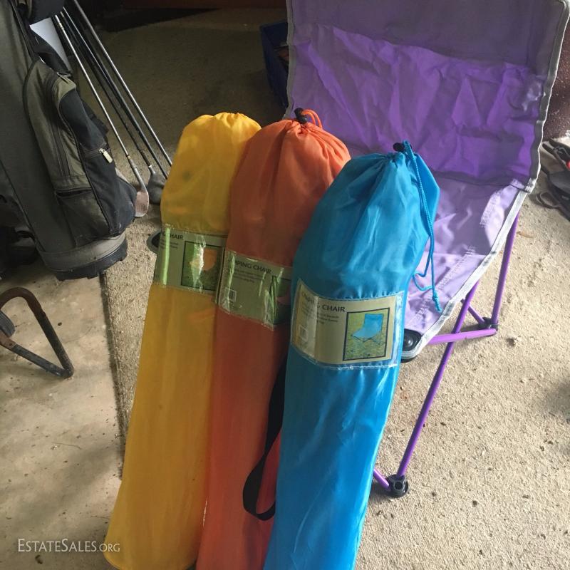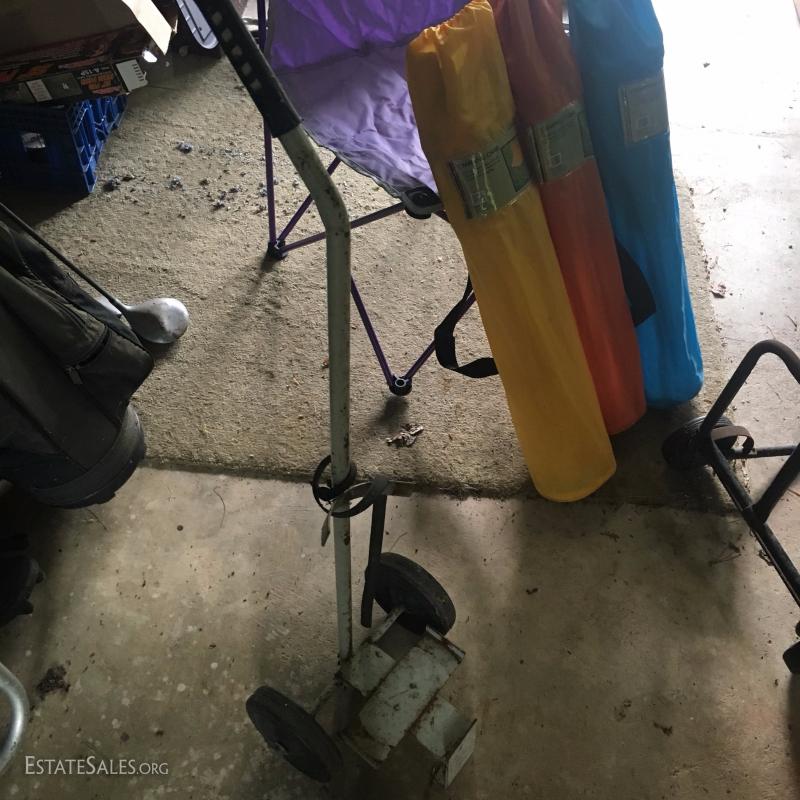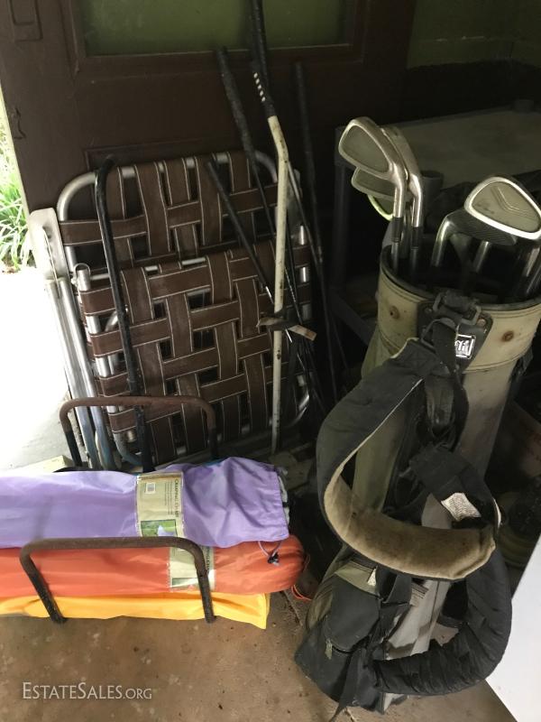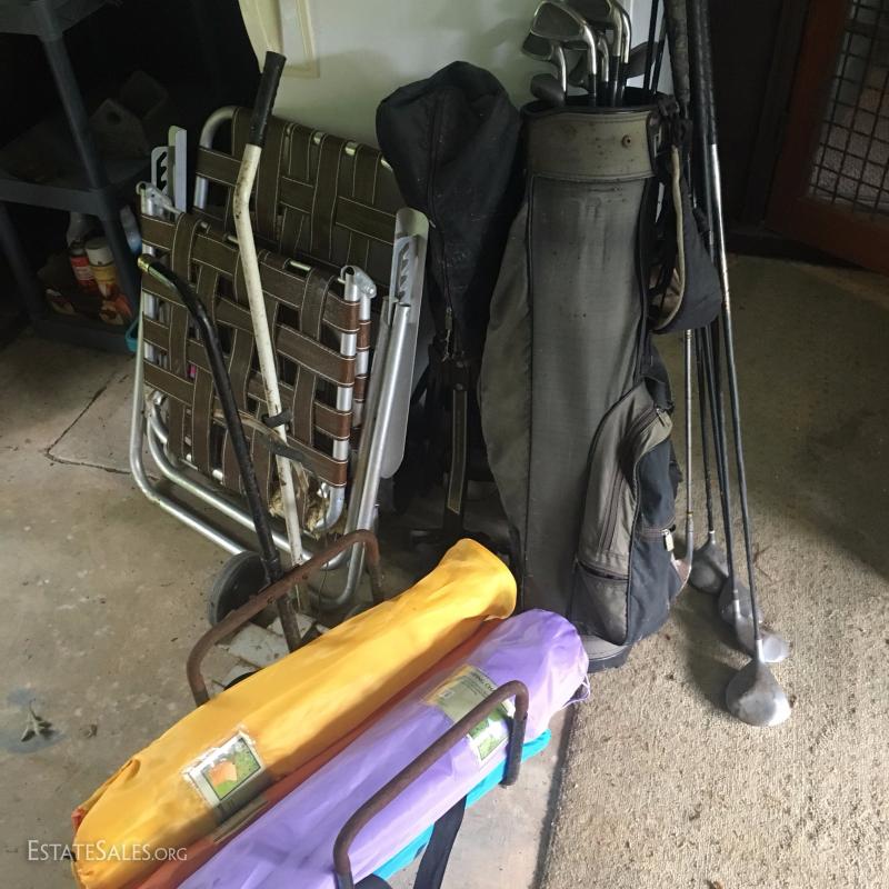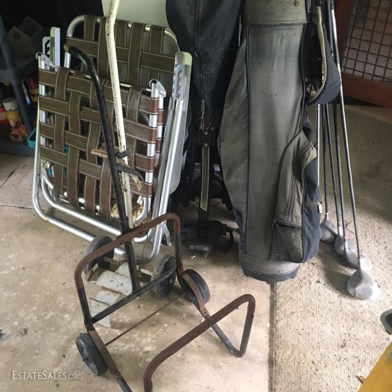 Folding chairs. Vintage golf clubs and Maxfli bag. Golf rolling carts.