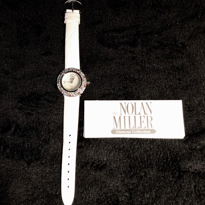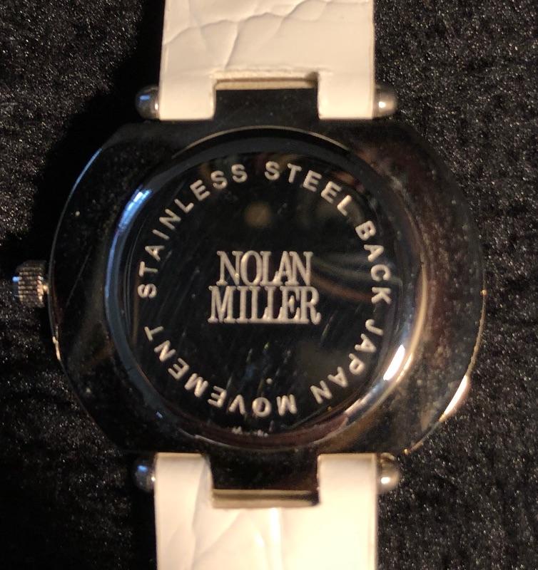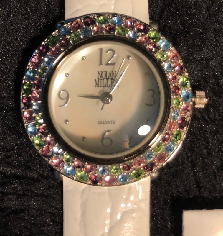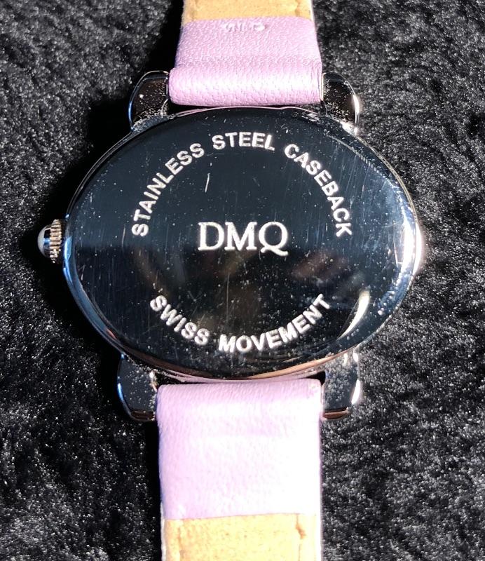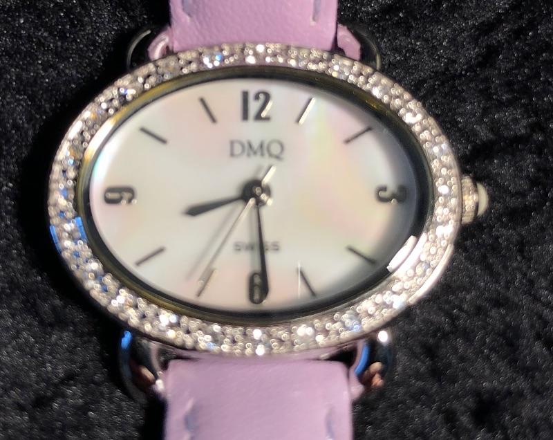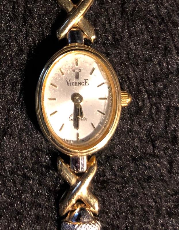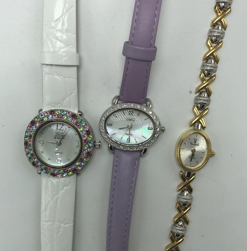 Some beautiful timepieces here that include a Nolan Miller watch with box and accessories, A gold colored chain Vicence watch marked Milor on the back of the watch face and marked 585 Italy on the clasp. And lastly a purple leather strapped DMQ watch. See images for markings and more information.