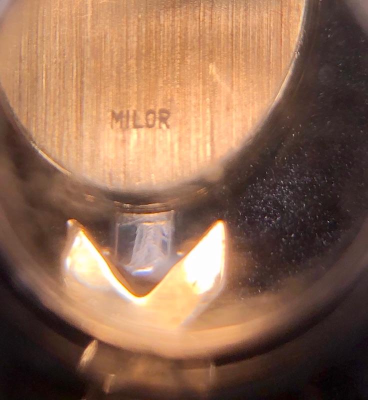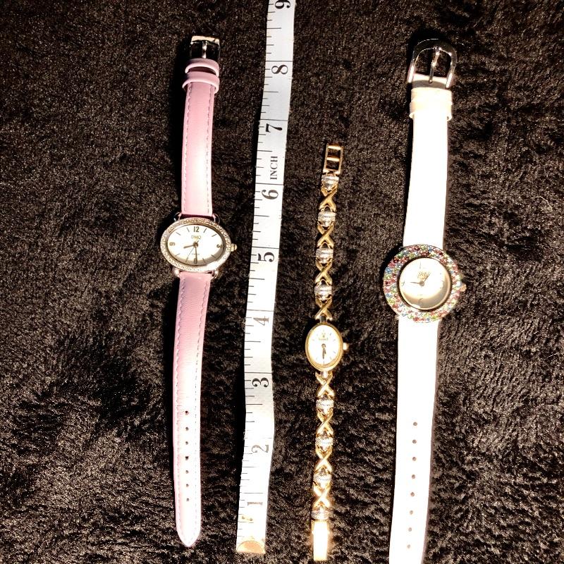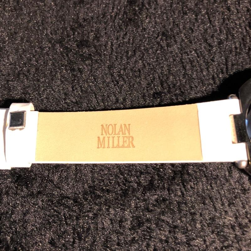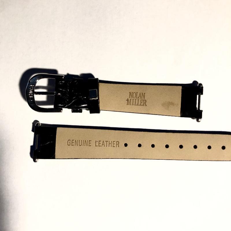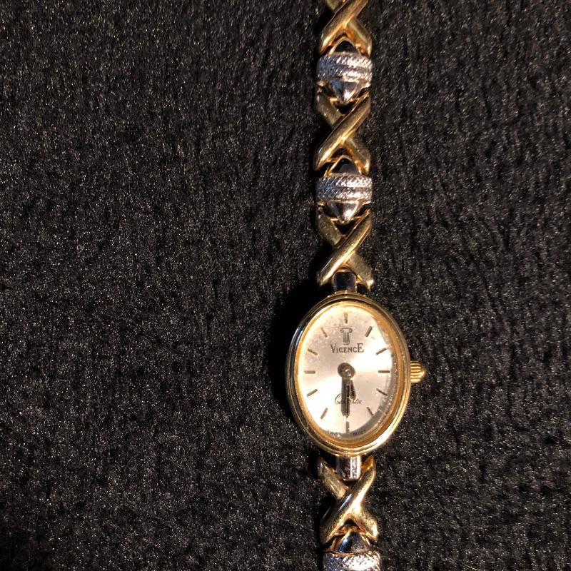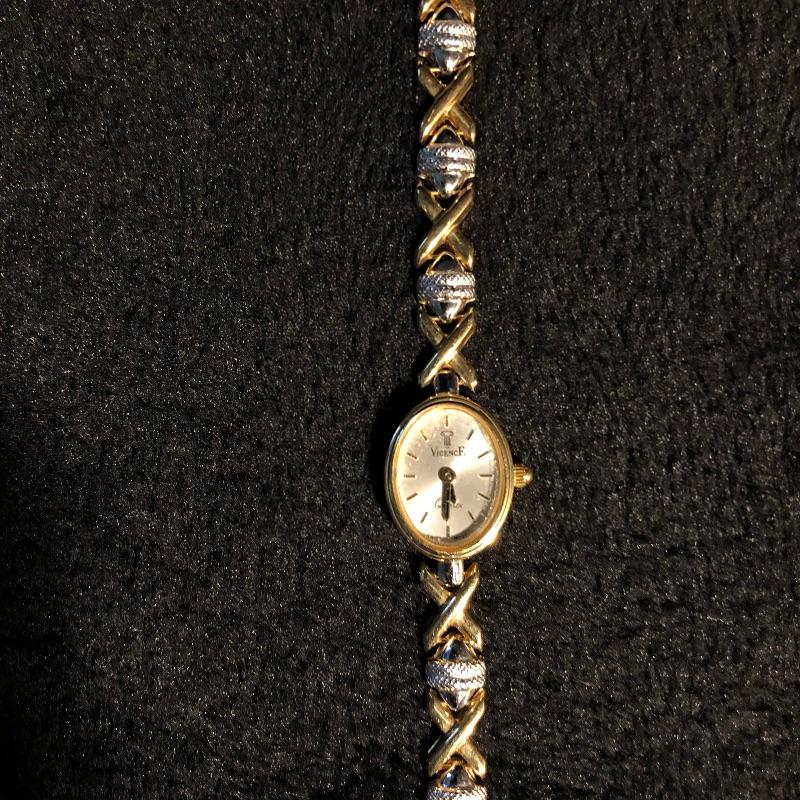 Some beautiful timepieces here that include a Nolan Miller watch with box and accessories, A gold colored chain Vicence watch marked Milor on the back of the watch face and marked 585 Italy on the clasp. And lastly a purple leather strapped DMQ watch. See images for markings and more information.