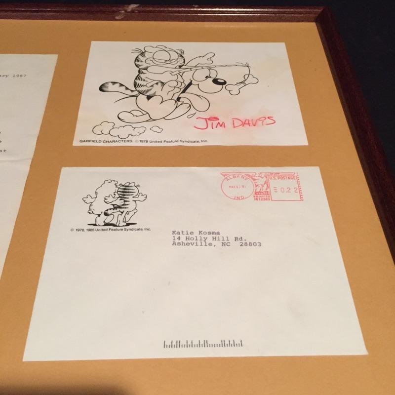 This vintage garfield puppet is 11” high and is in good condition. The framed letter is from Garfield cartoonist Jim Davis . It is written on a fun letterhead that is has a "bite" out of it. Frame measures 16” x 13”. Shipping available.