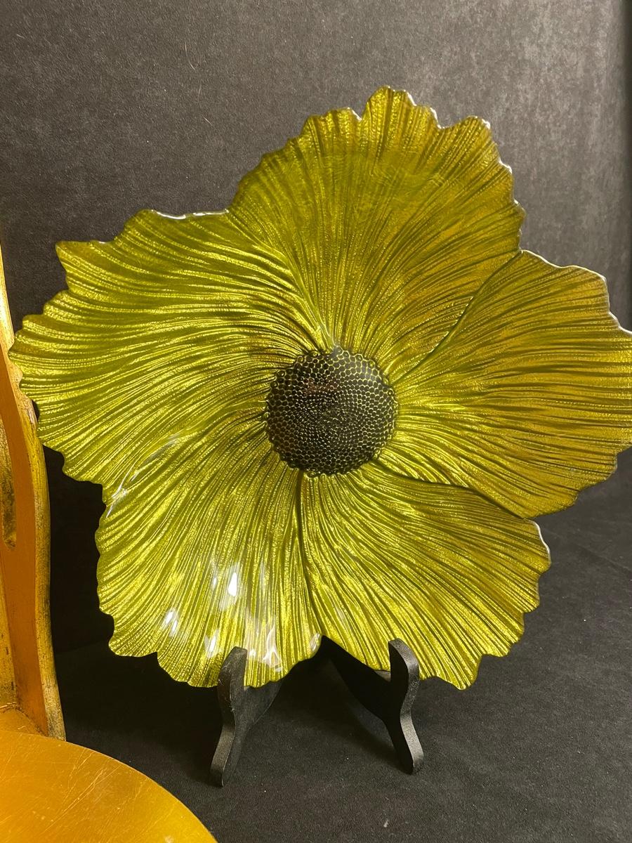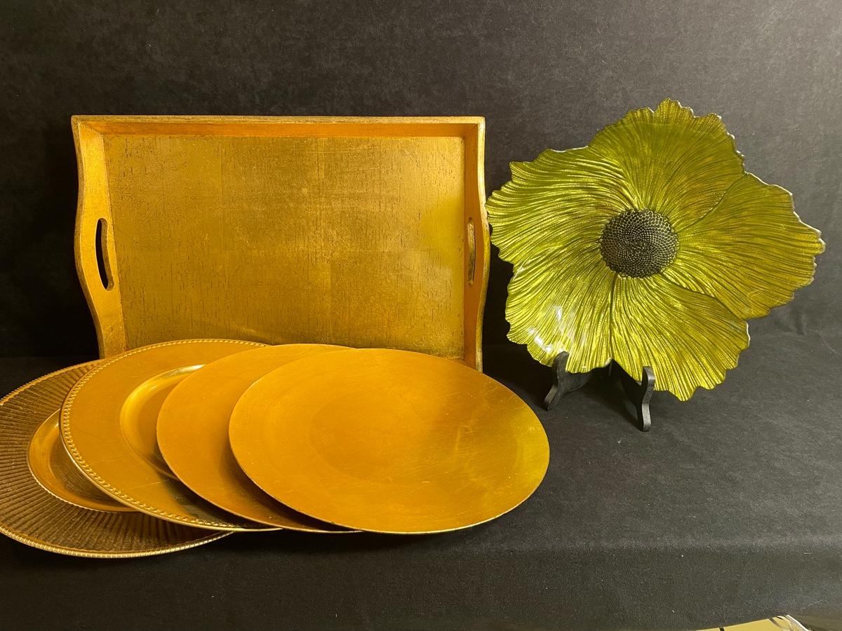 Gold Leaf serving tray, assorted gold charges and a decorative glass bowl with flower motif