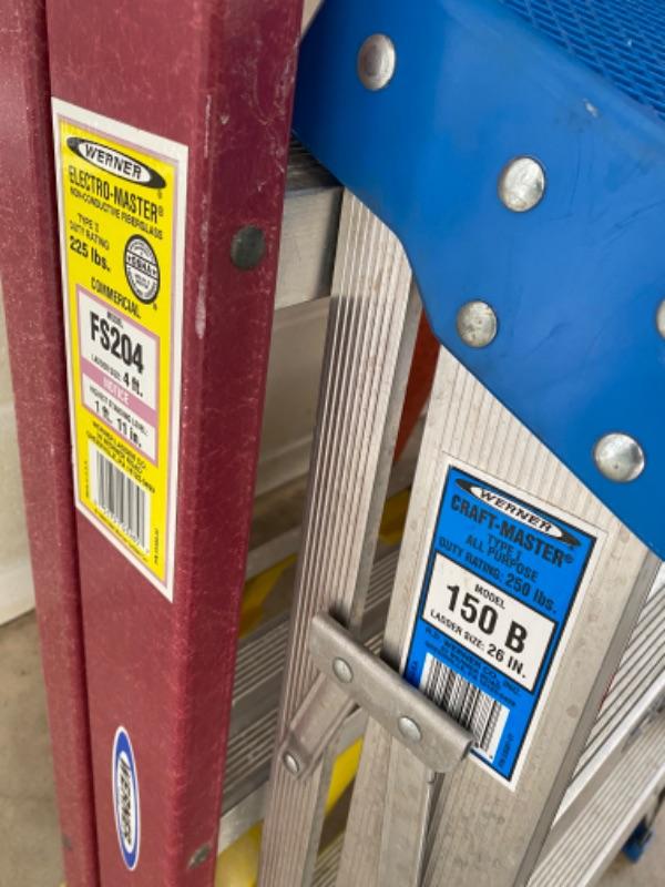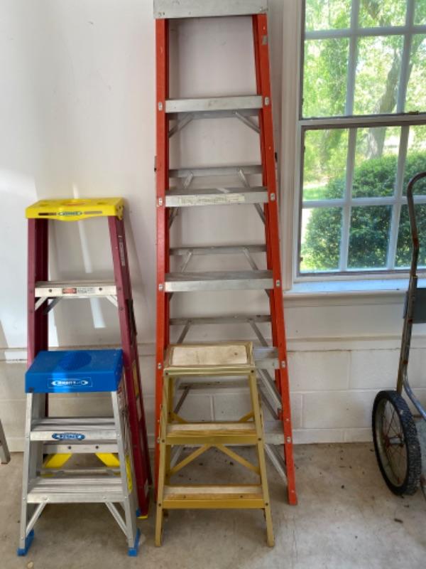 Lot of ladders, fiberglass 4’ , 26” Werner aluminum, sears craftsman 8’ and two small step ladders