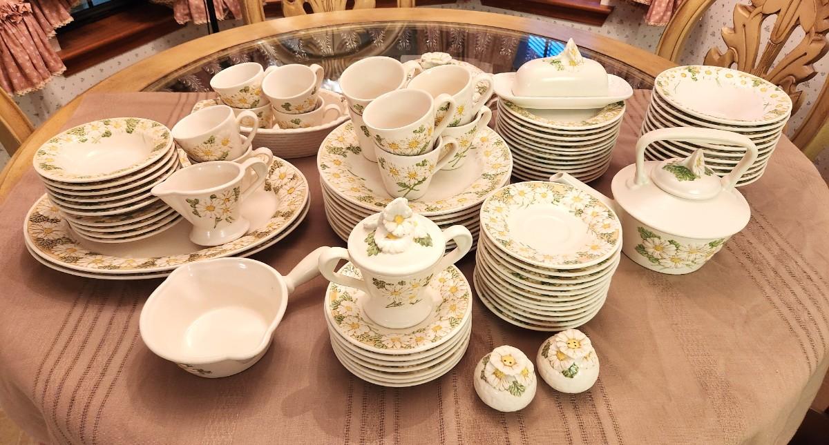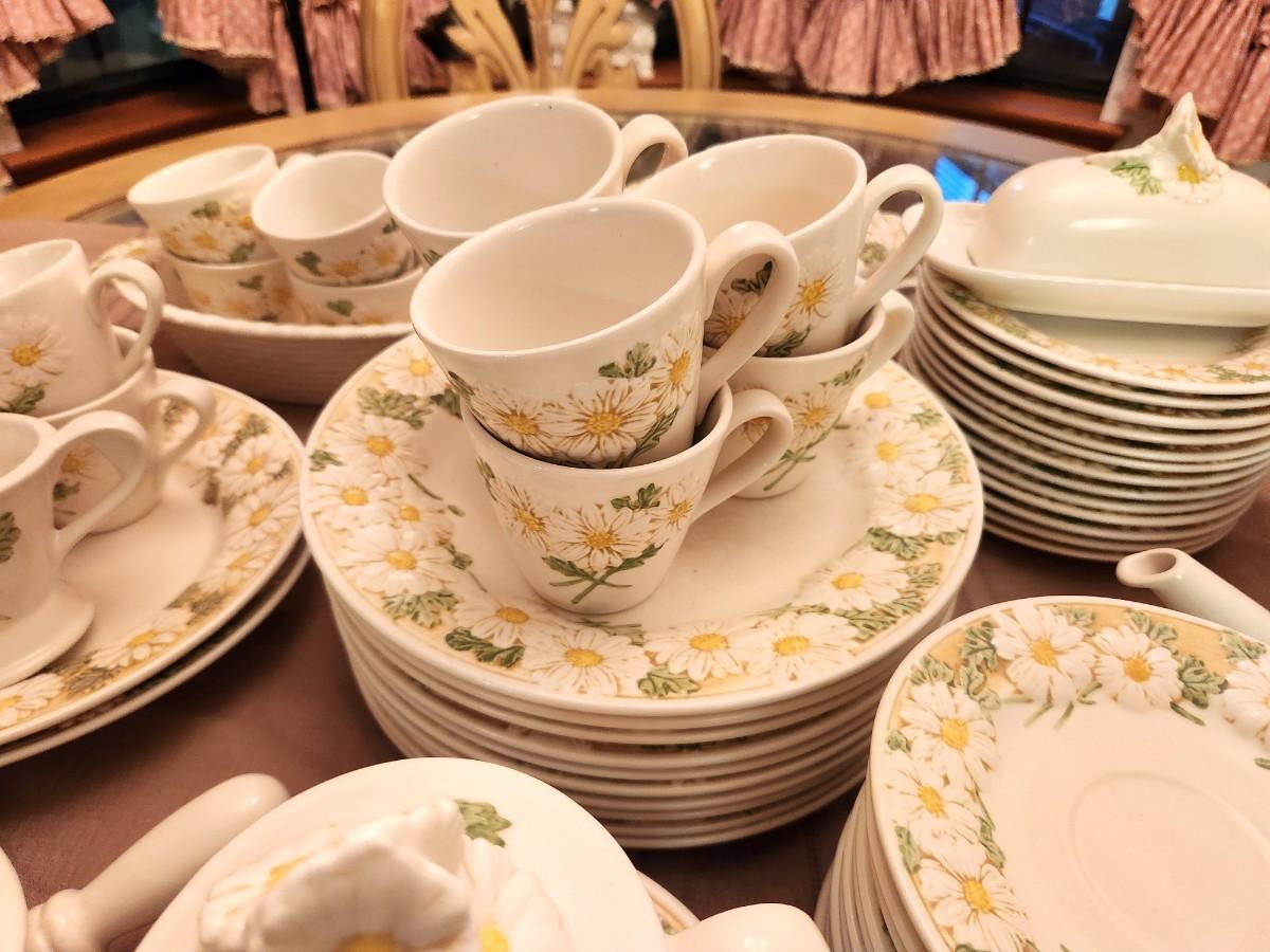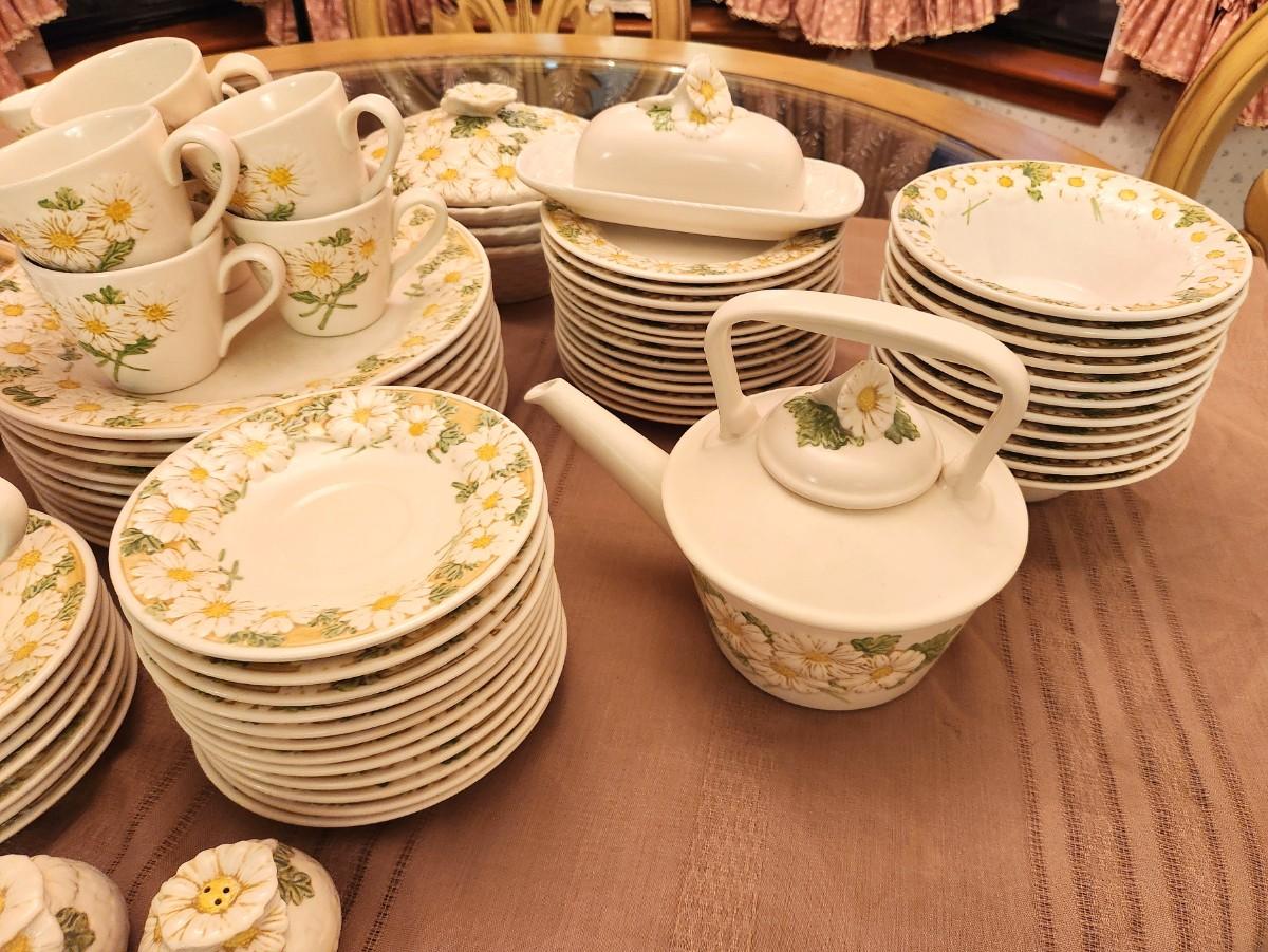 Mid Century METLOX tableware - pattern is called "Poppy Trail" , but seems to have daisies on it! One of life's great mysteries! This pattern was made from 1964-1983, so it was retired 40 years ago! You get all you see here: Teapot, 8 Cups/12 saucers, Covered Butter dish, 11 soup bowls, 13 salad plates, 11 bread/butter plates, 1 covered veg, 10 dinner plates, 2 platters, 2 open veg bowls, sauce/gravy boat, sugar bowl. All in good condition. WHEW! Good reseller lot if you have the fortitude to part it out.