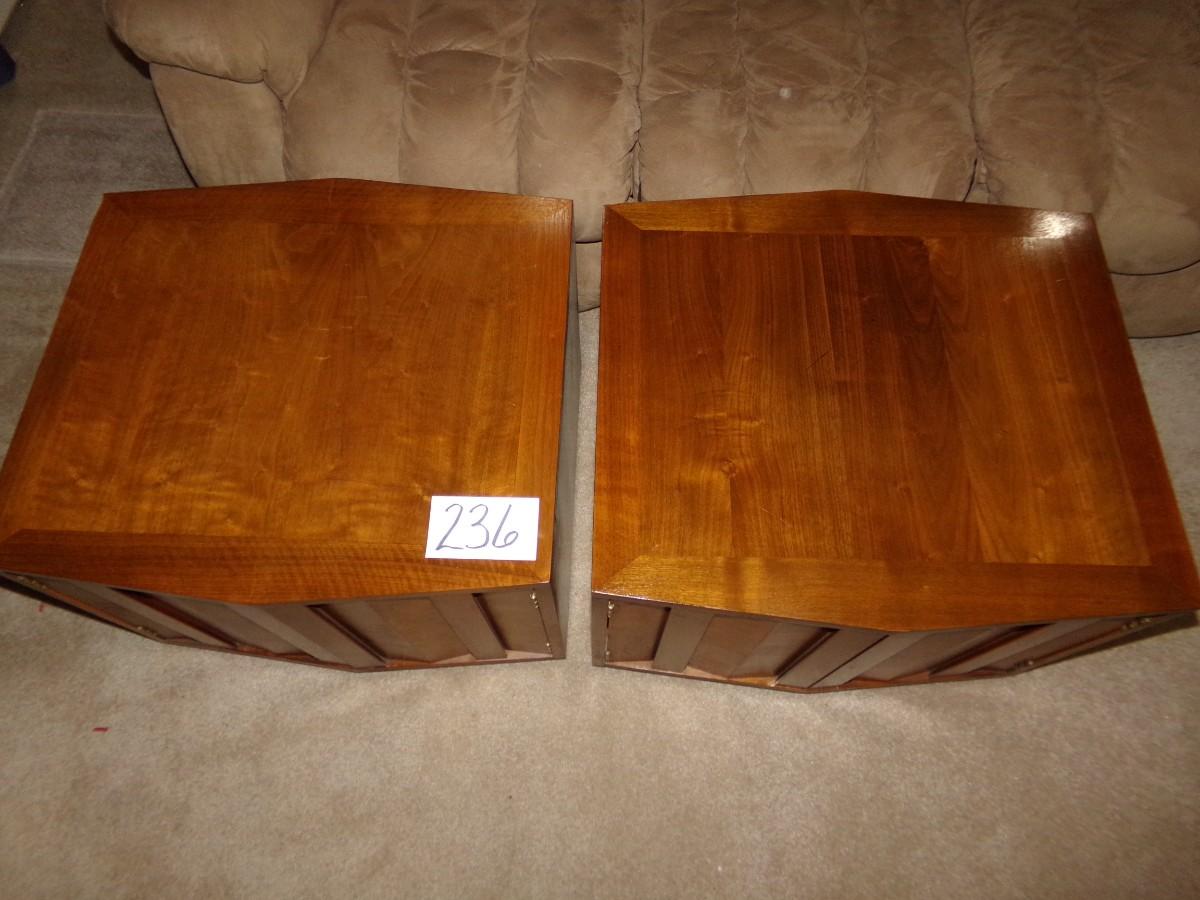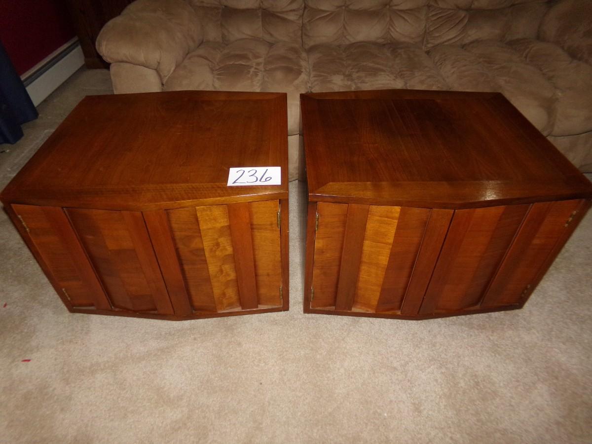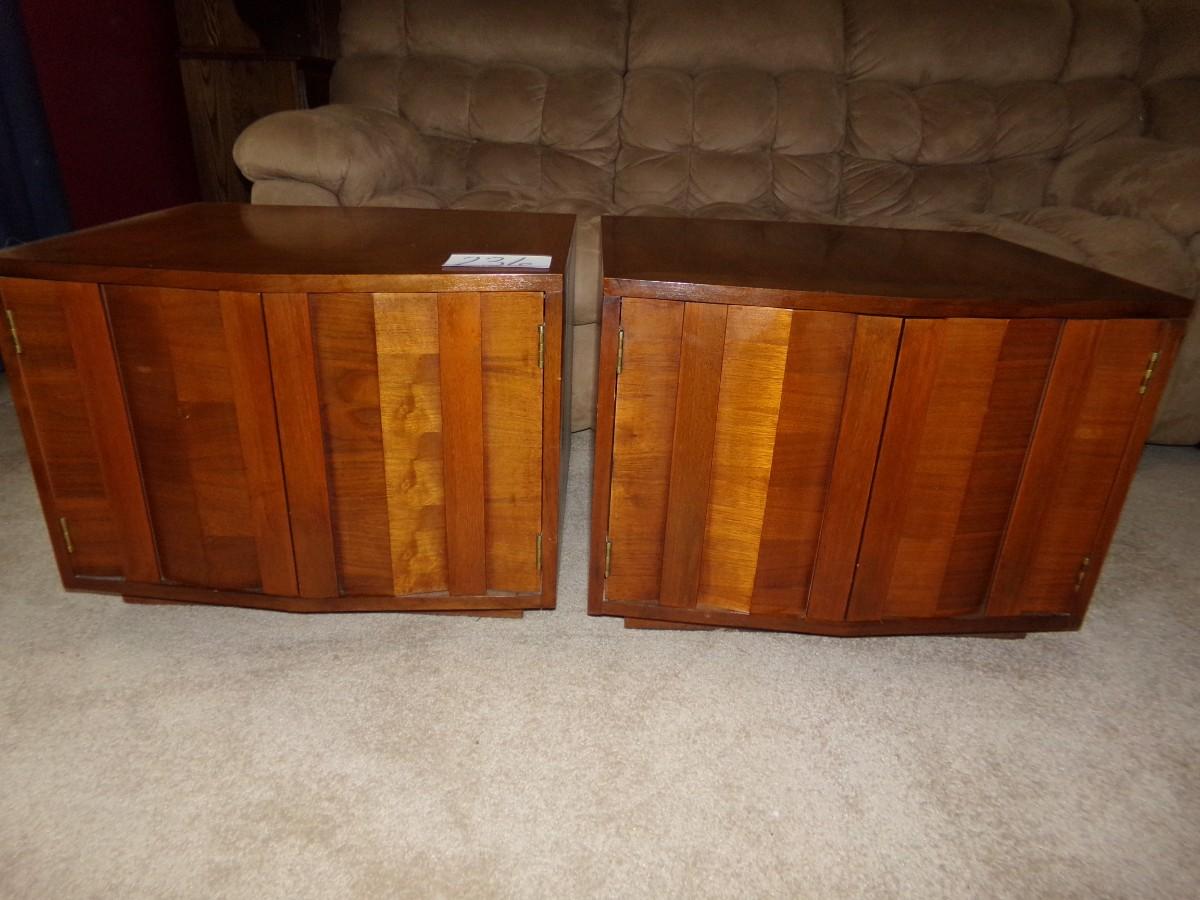 2 BEAUTIFUL SOLID WOOD, MATCHING END TABLES WITH A STORAGE CABINET. MEASURES 20 X 27 X 25.