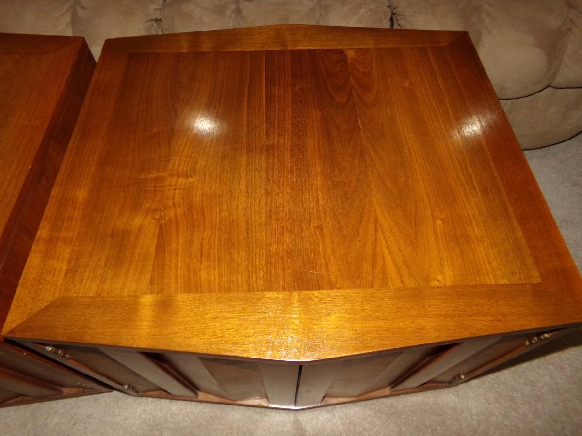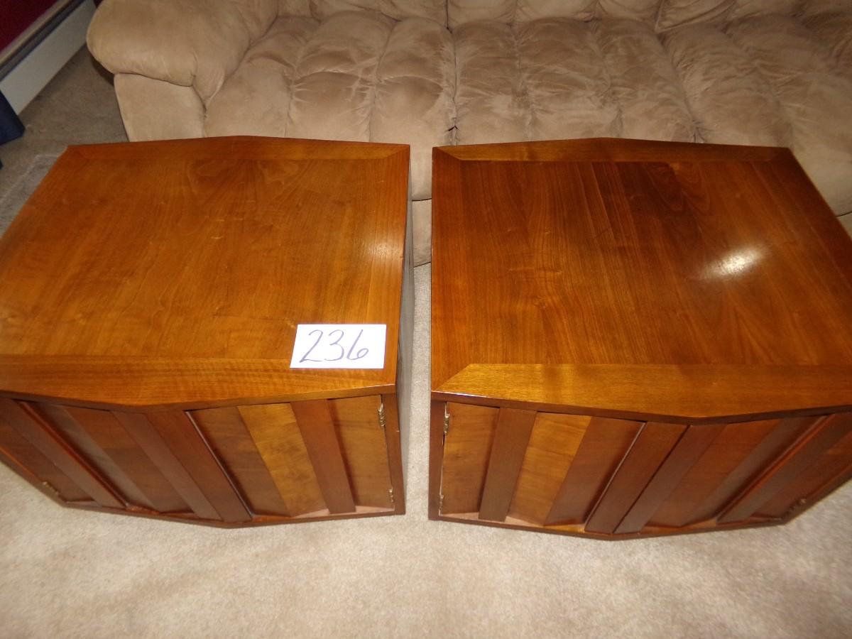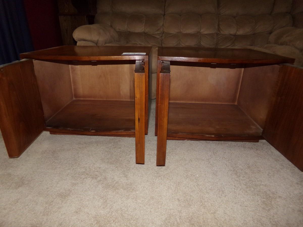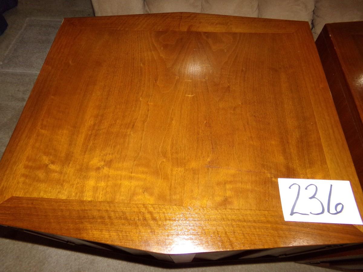 2 BEAUTIFUL SOLID WOOD, MATCHING END TABLES WITH A STORAGE CABINET. MEASURES 20 X 27 X 25.