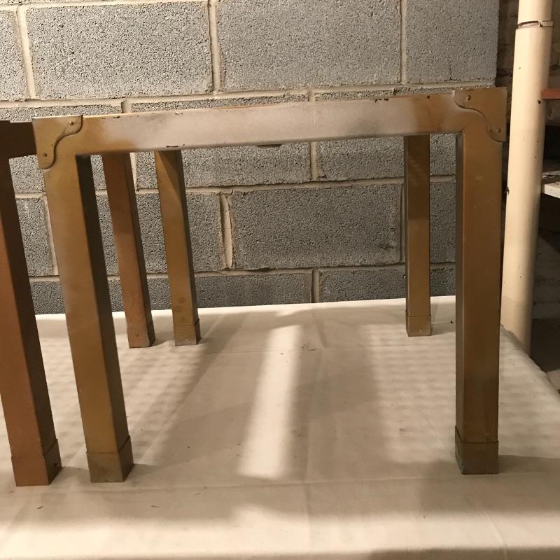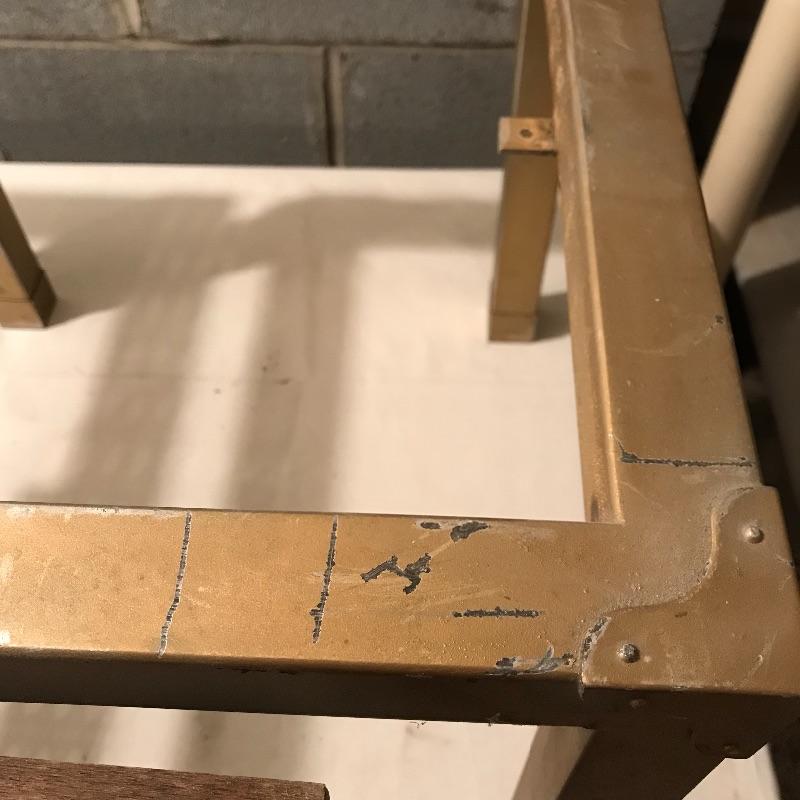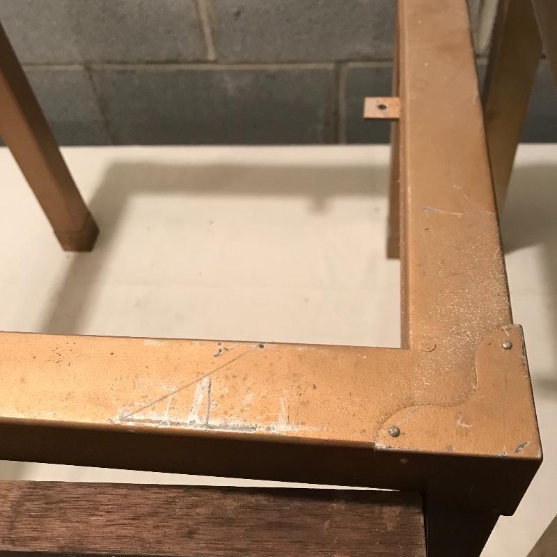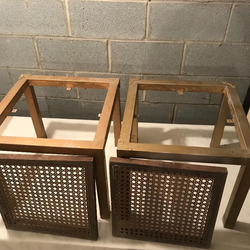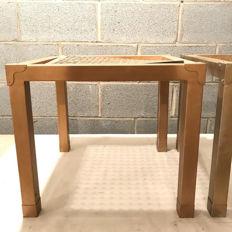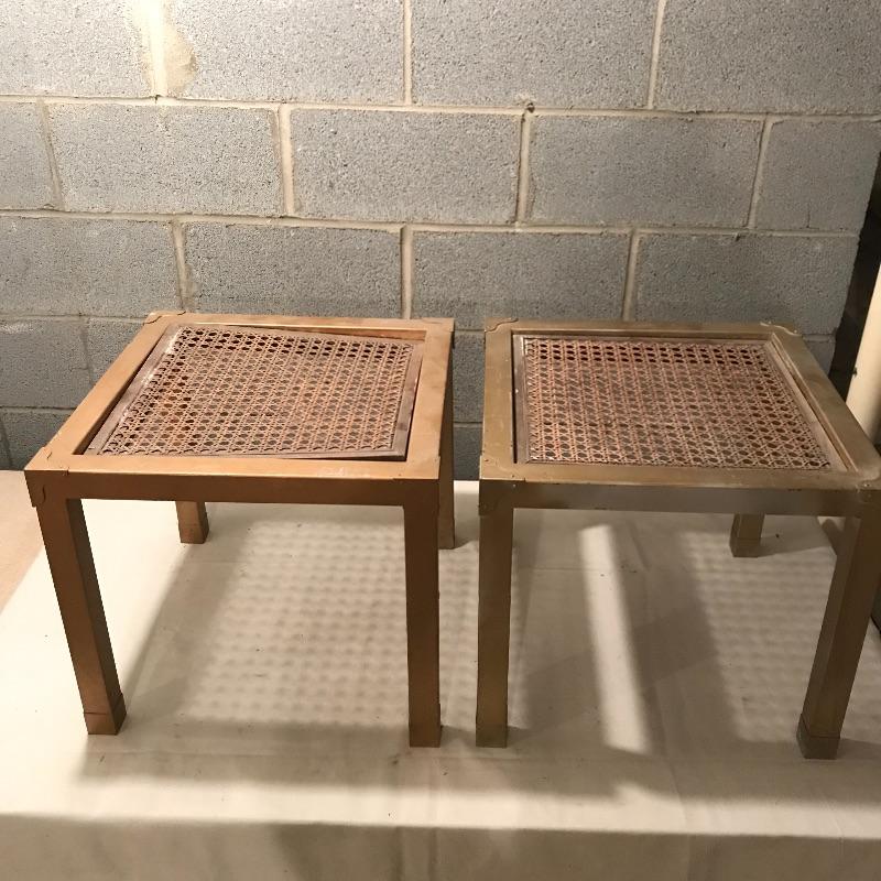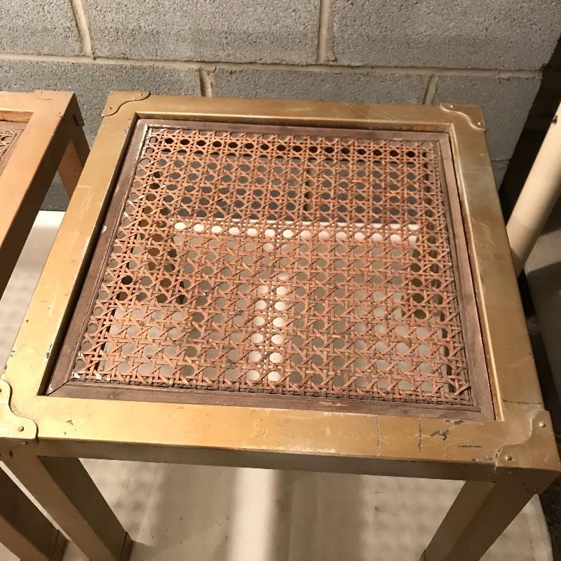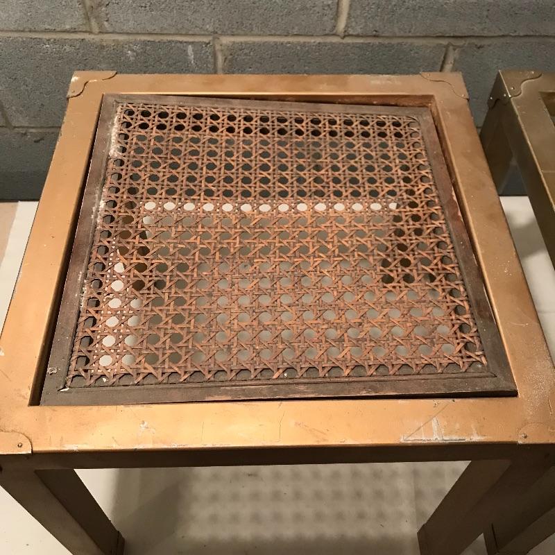 Oh the possibilities! Two awesome square metal side tables both with removable cane and wood tops. One cane top appears to be bowed and both tables need some cleaning. Although the tables appear identical, the right is more copper colored while the left is more brass toned. Both tables measure approximately 18” x 18” x 16”. No shipping.