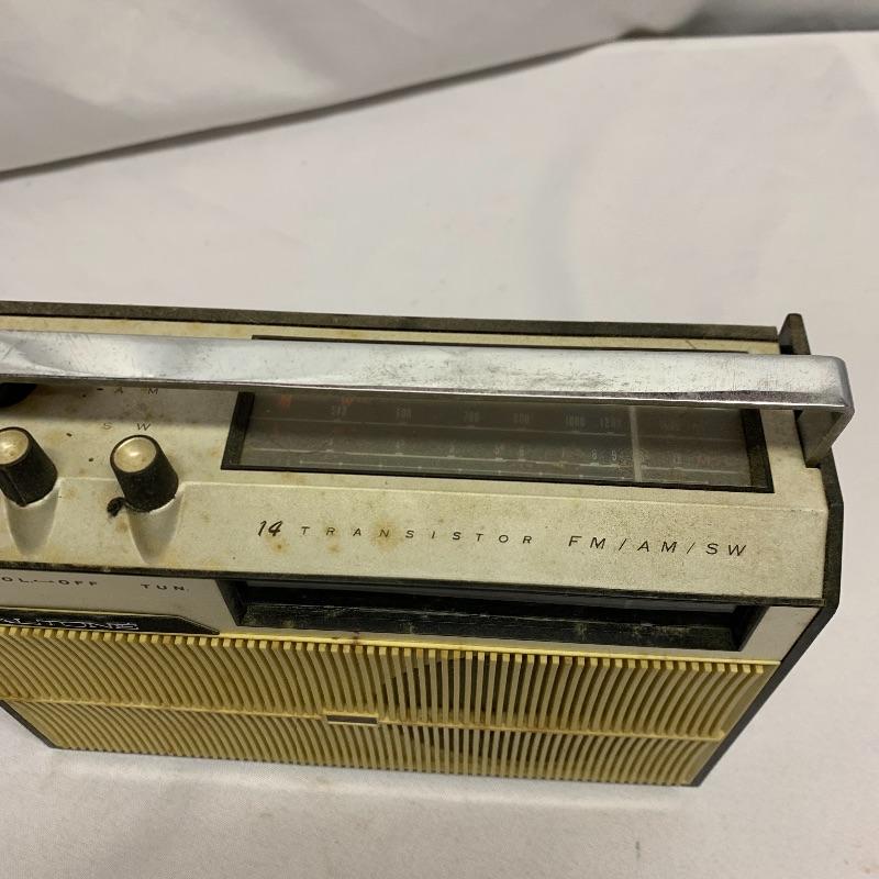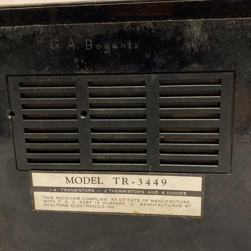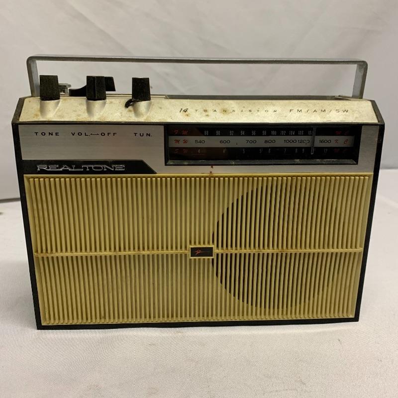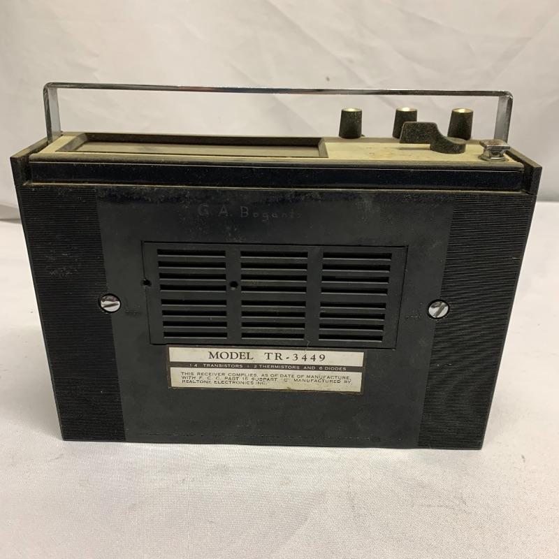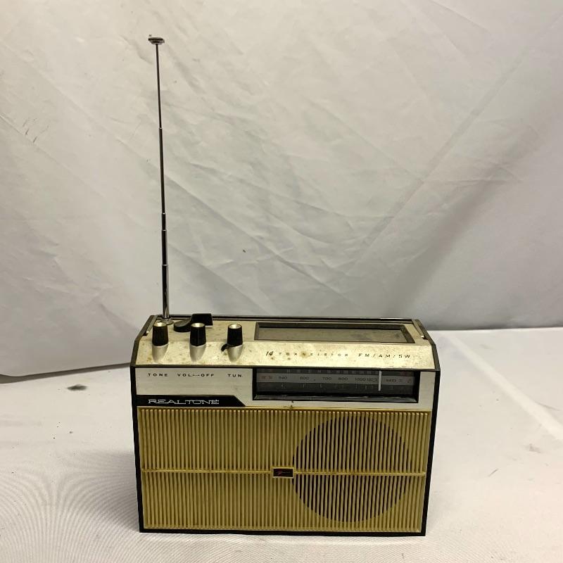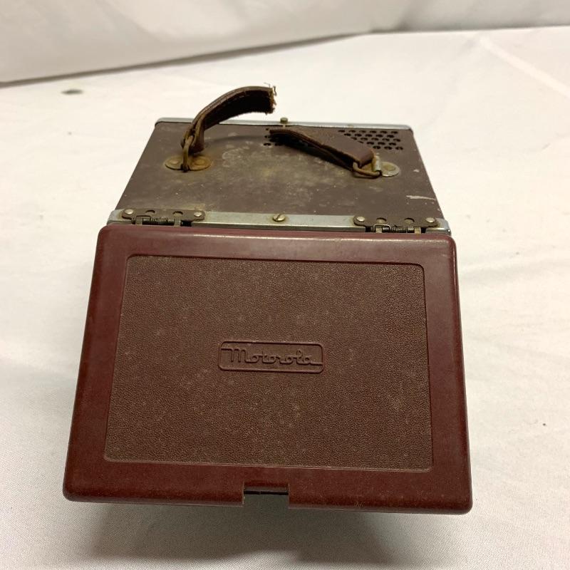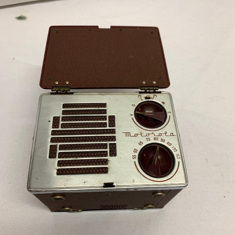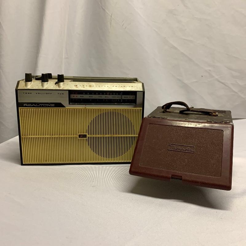 This lot includes a Motorola Model 5A5 AC-DC small portable radio. Has a loose lid and broken handle. Has dials for tuning and volume. Buyer should check integrity of electrical cord before attempting to plug in. Also included is a Realtone FM/AM/SW portable radio, Model TR-3449. It has an antenna, 14 transistors, two thermistors, and six diodes.