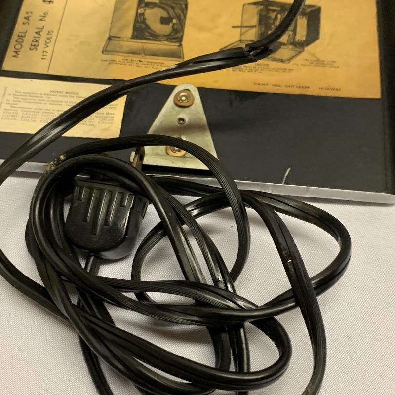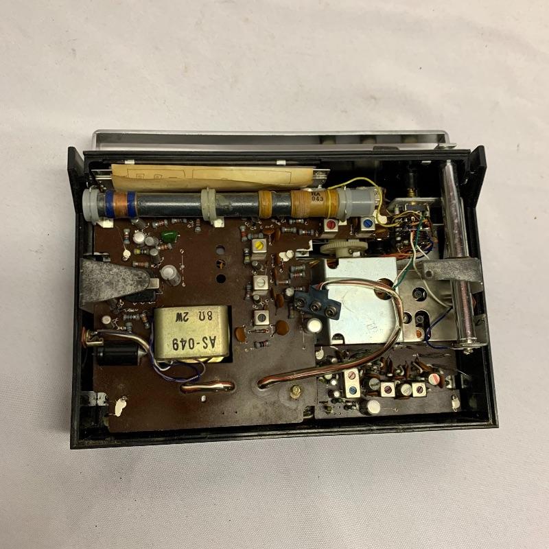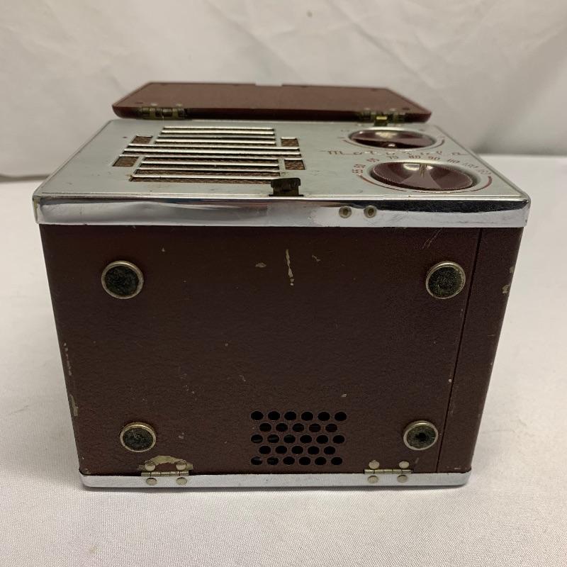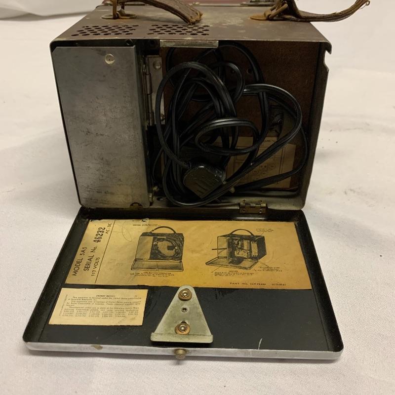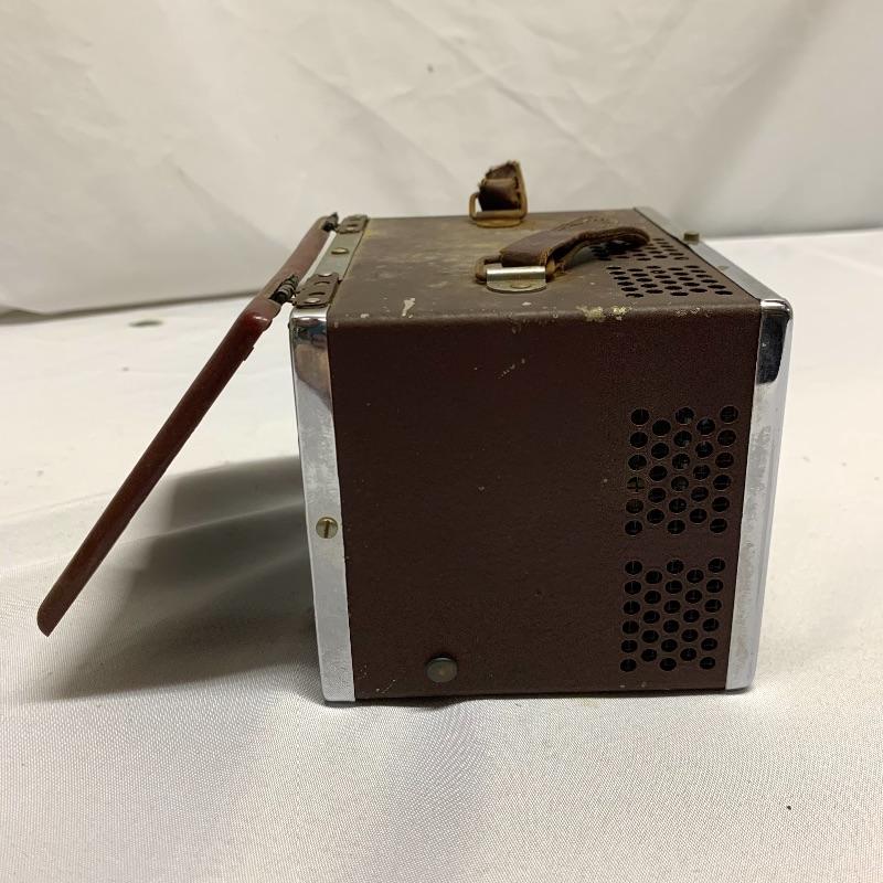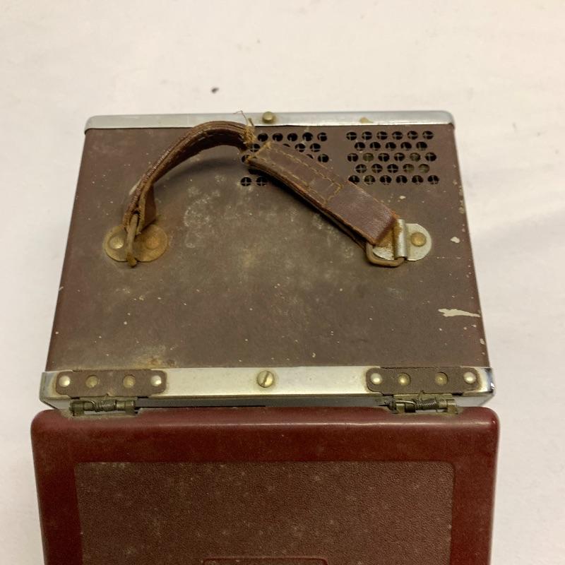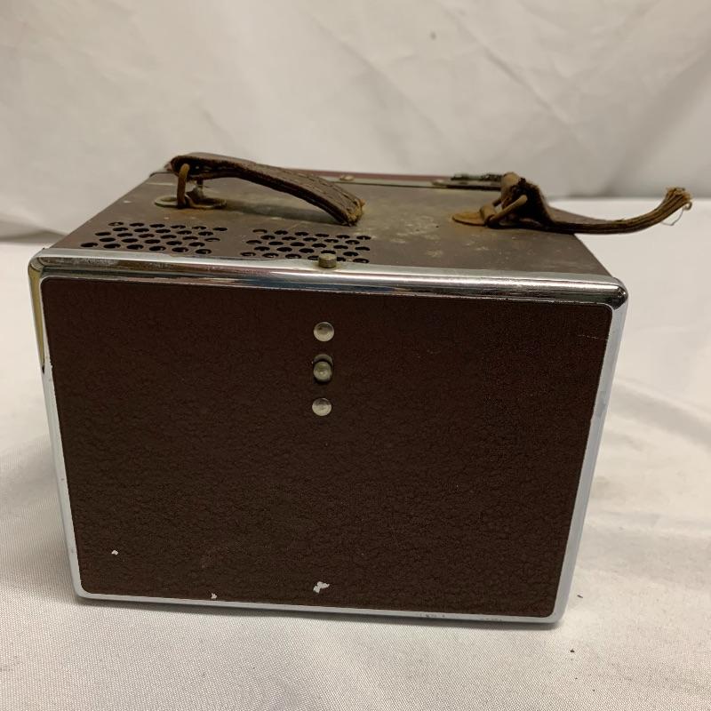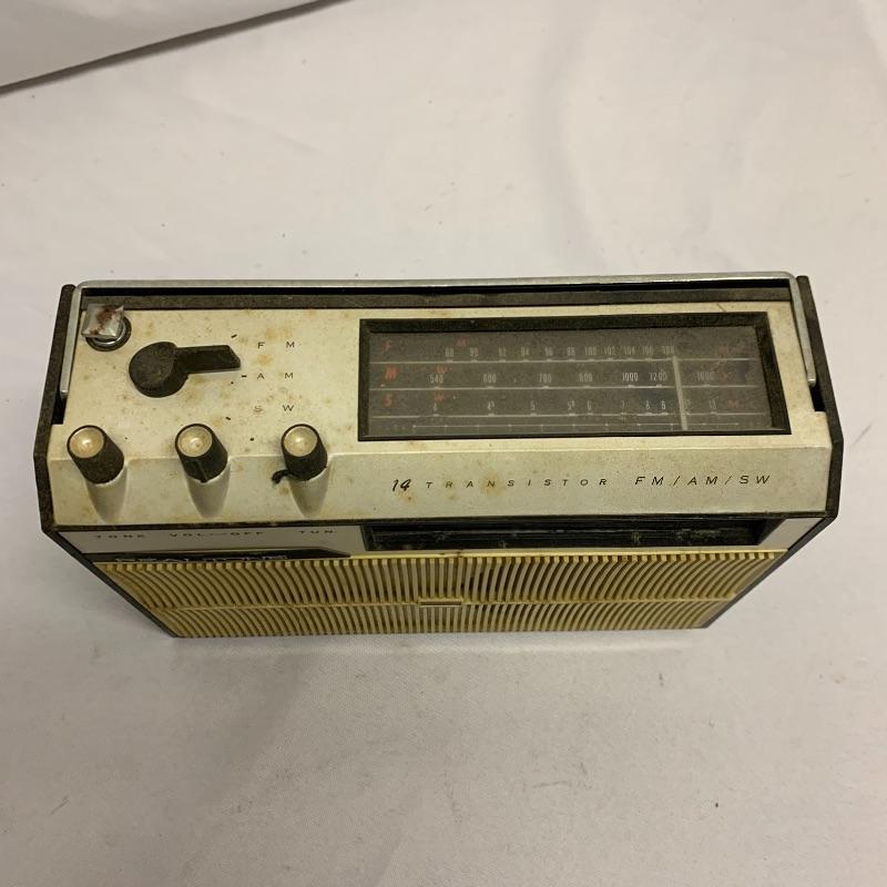 This lot includes a Motorola Model 5A5 AC-DC small portable radio. Has a loose lid and broken handle. Has dials for tuning and volume. Buyer should check integrity of electrical cord before attempting to plug in. Also included is a Realtone FM/AM/SW portable radio, Model TR-3449. It has an antenna, 14 transistors, two thermistors, and six diodes.