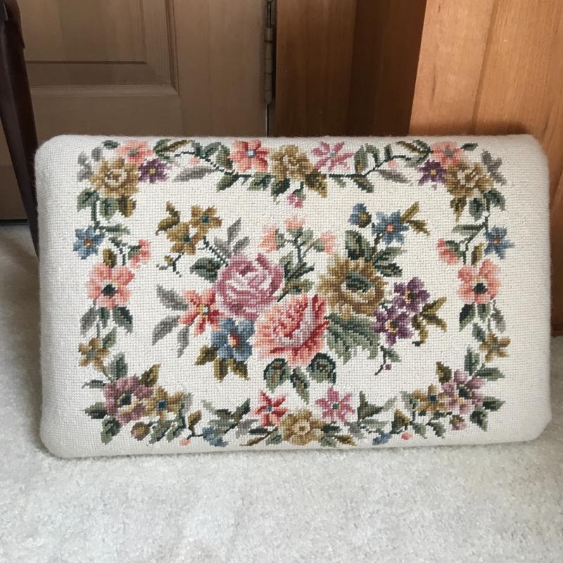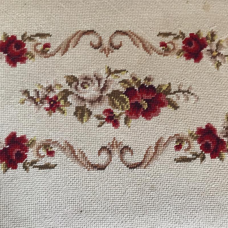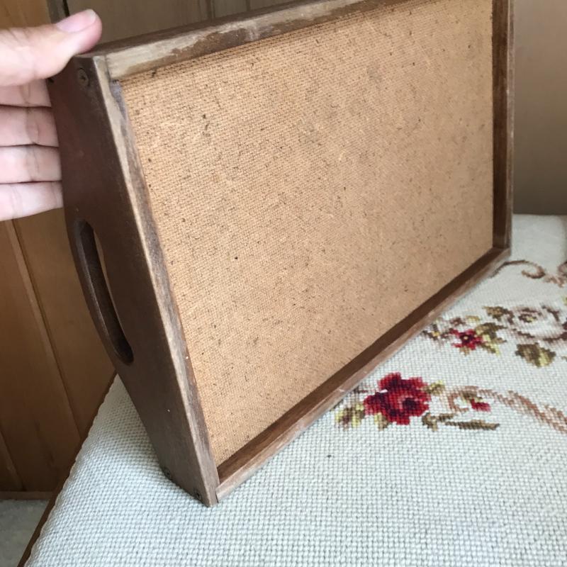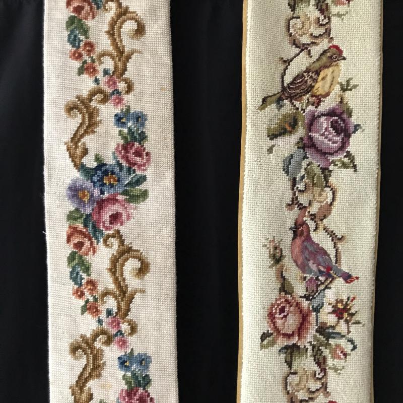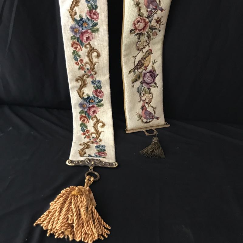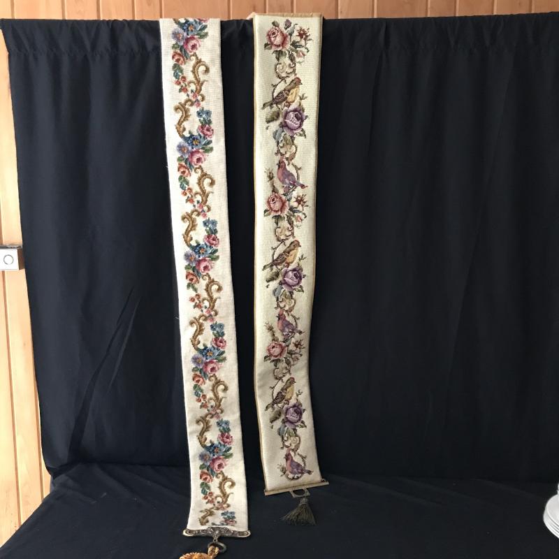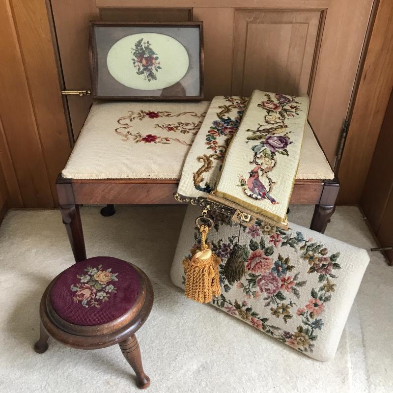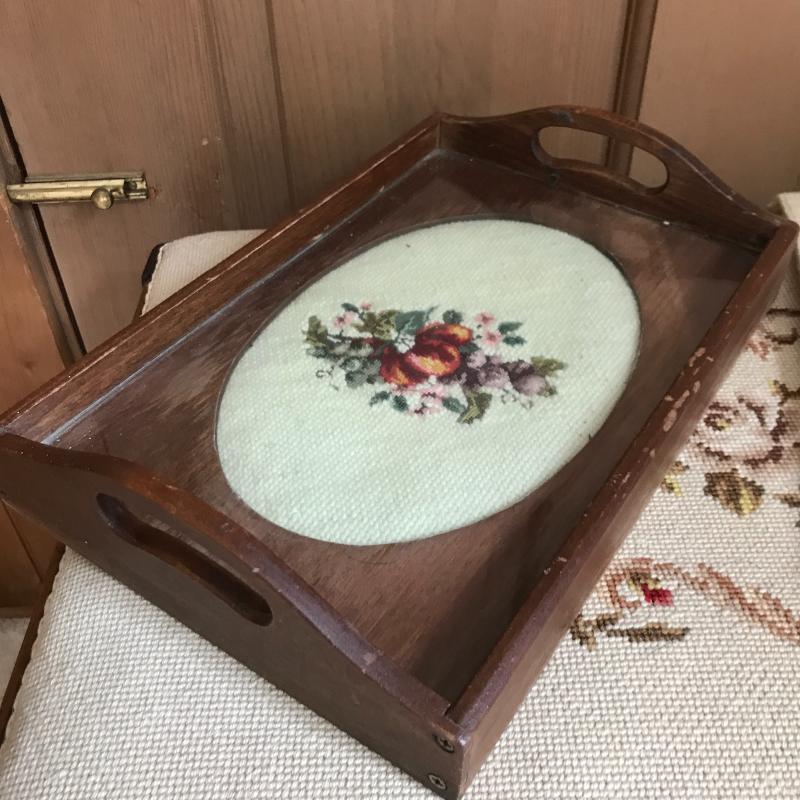 Bombay Company, tray with glass covered needlepoint inlay (12.5” x 8.5”) and two wall hangings. No shipping.
