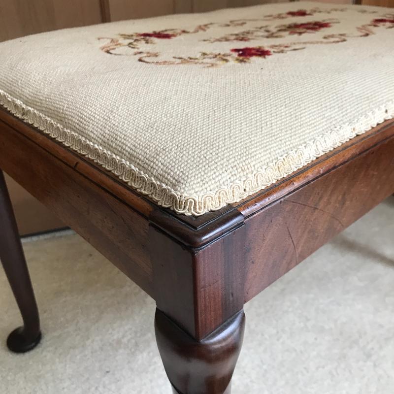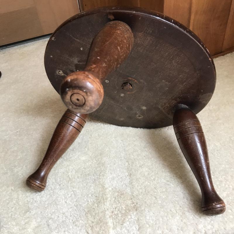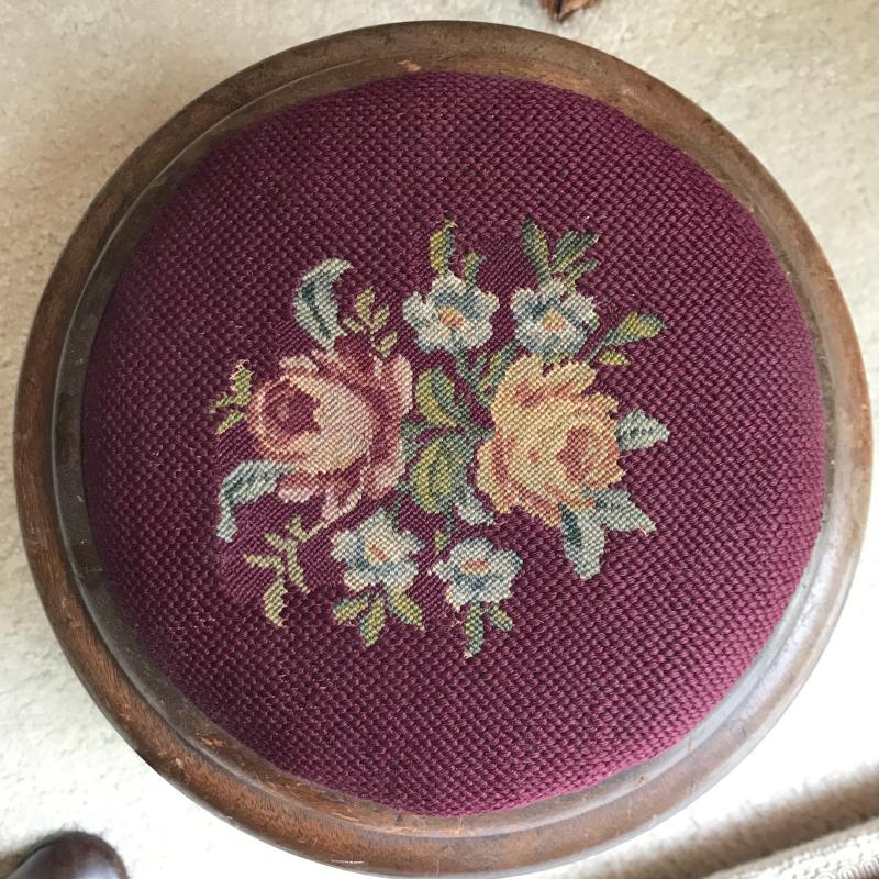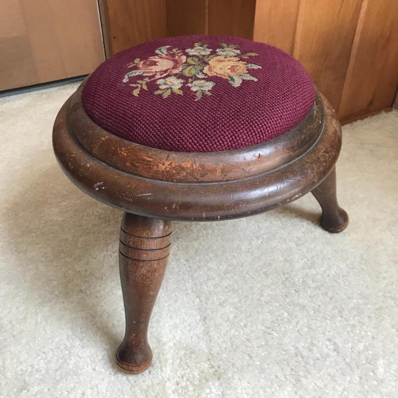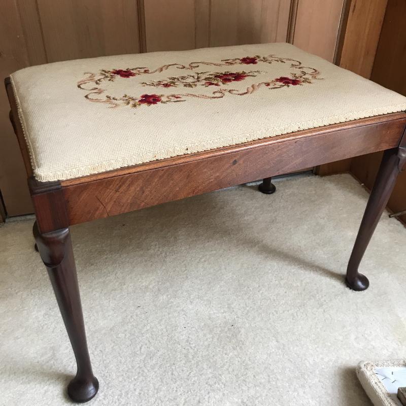 Larger Bench measures 26.5” x 17.5” x 18”h. Three legged footstool measures 11”d x 9”h. Lot also includes extra bench top from