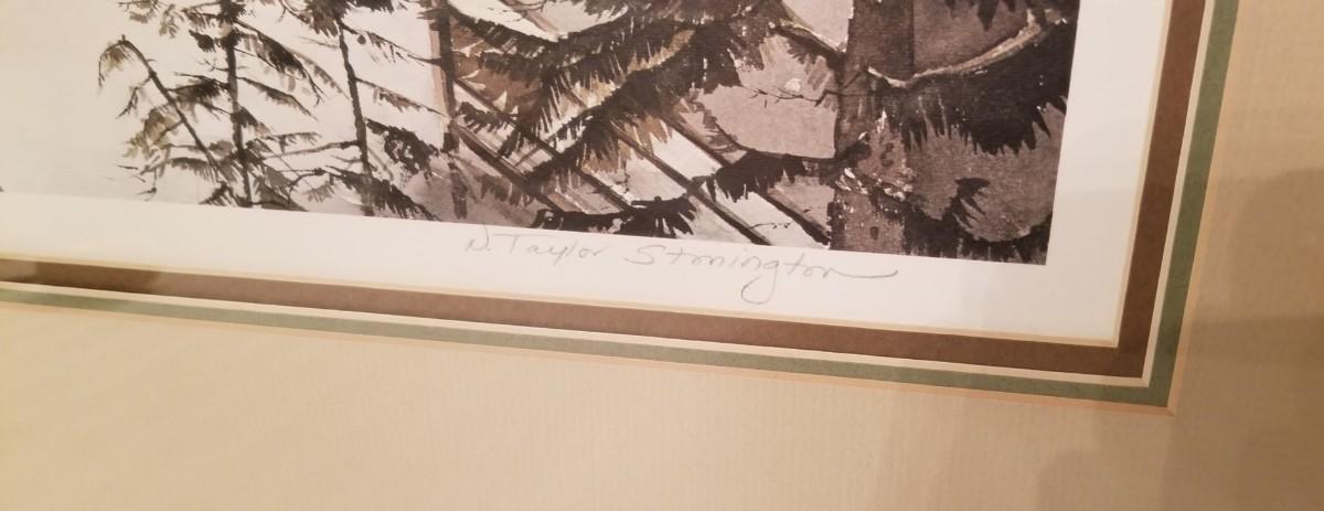 Large ltd edition, signed/numbered print by artist N. Taylor Stonington, done in 1975. 444/450, pencil signed. Entitled "Creek Street". Triple matted, 26.75" x 32.5".