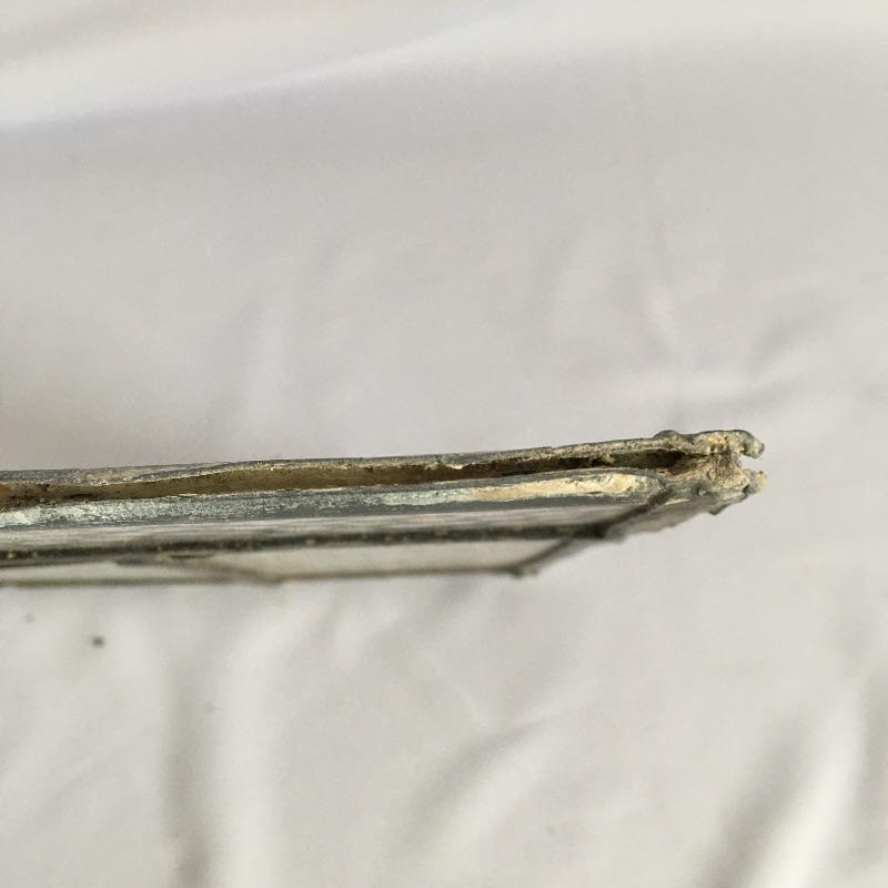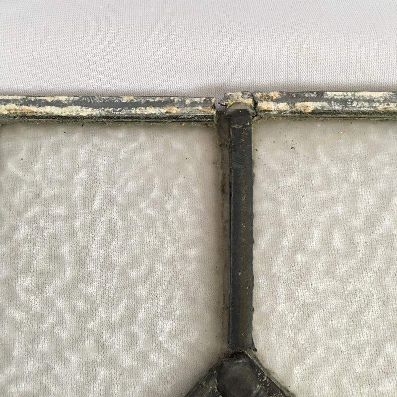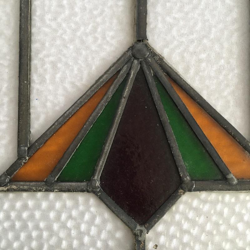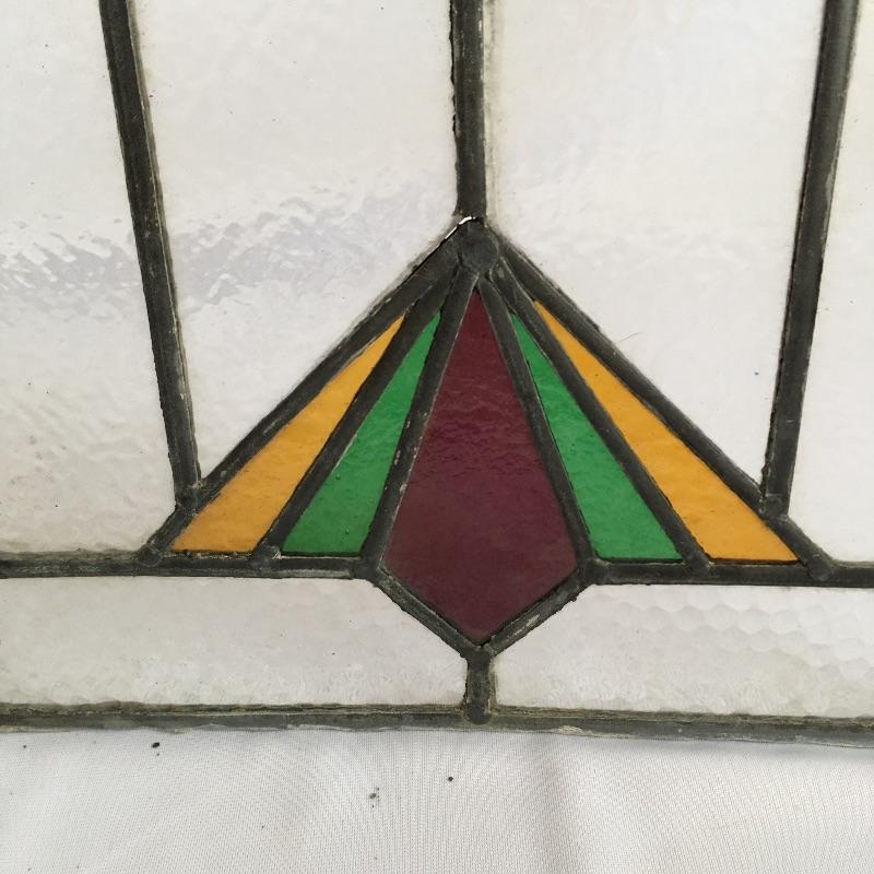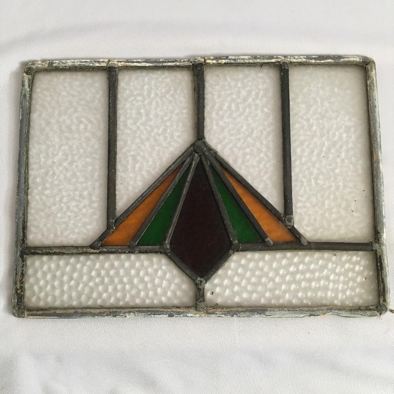 Lovely piece of stained and leaded glass. Leading on top of glass is broken, see pictures. Piece measures 11.25” x 15.5”.