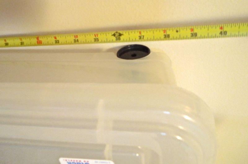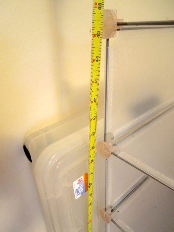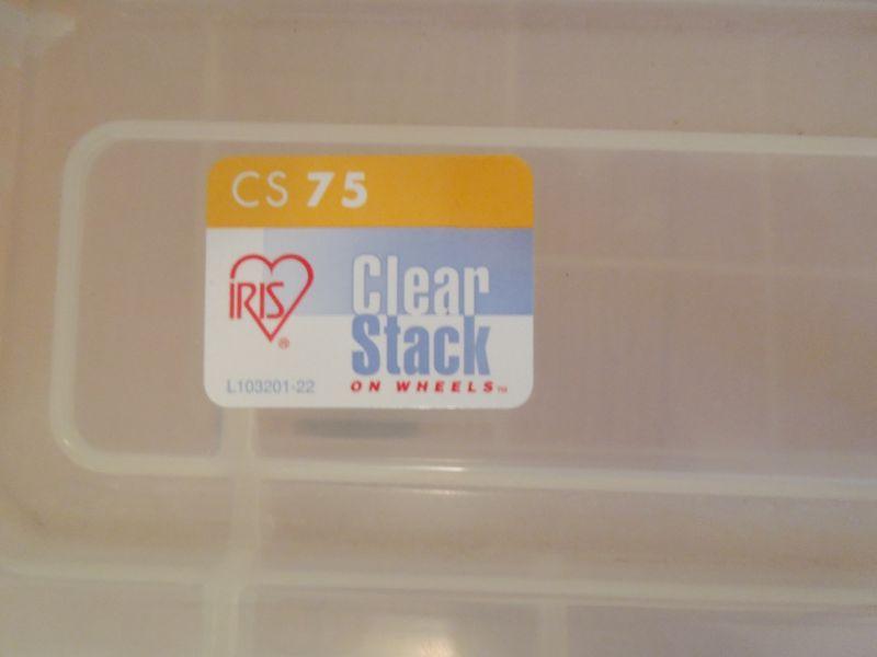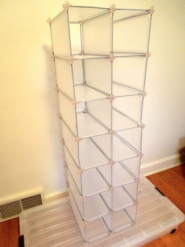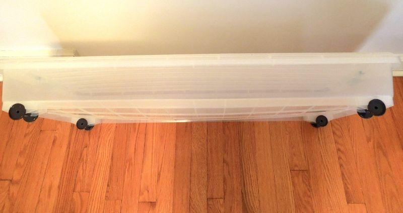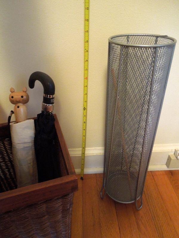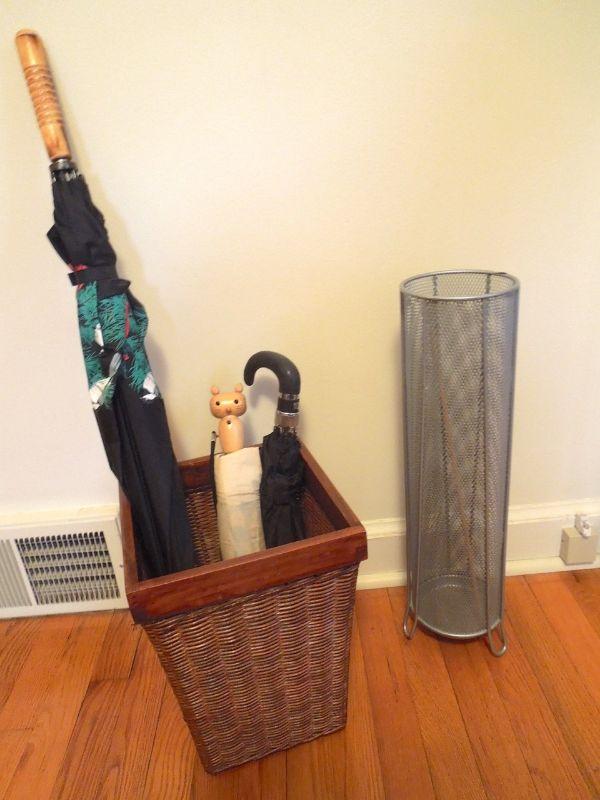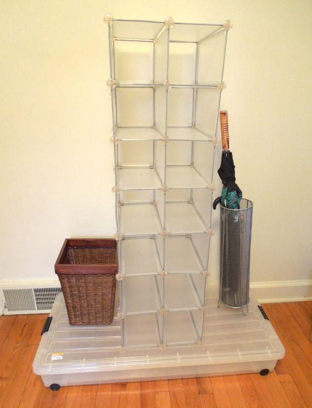 A stacking interlocking nylon shoe rack that can be used horizontally or vertically. A rolling 40" long lidded Clear Stack underbed plastic storage container, a metal mesh umbrella holder with three umbrellas and a wicker square waste basket.