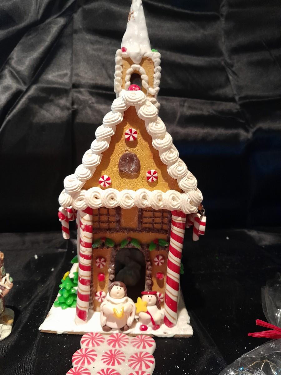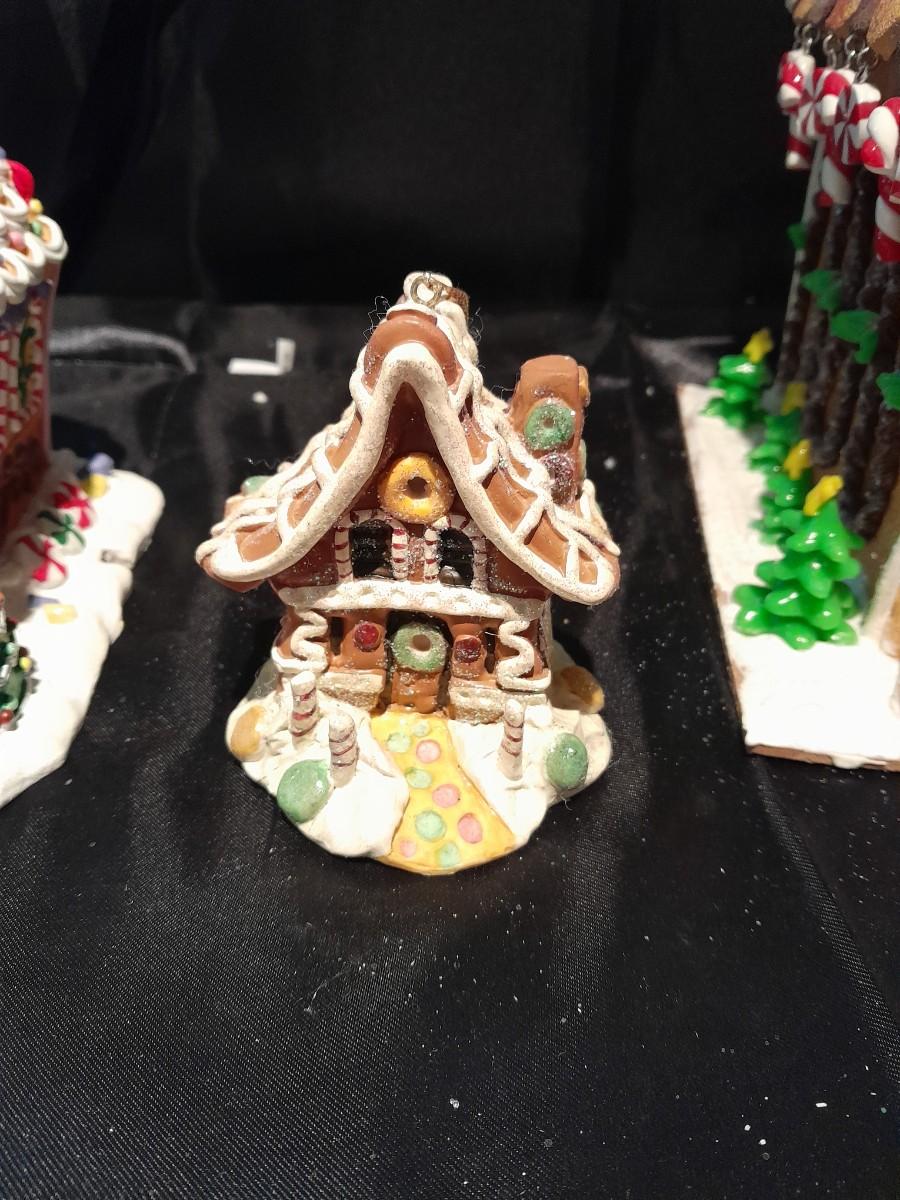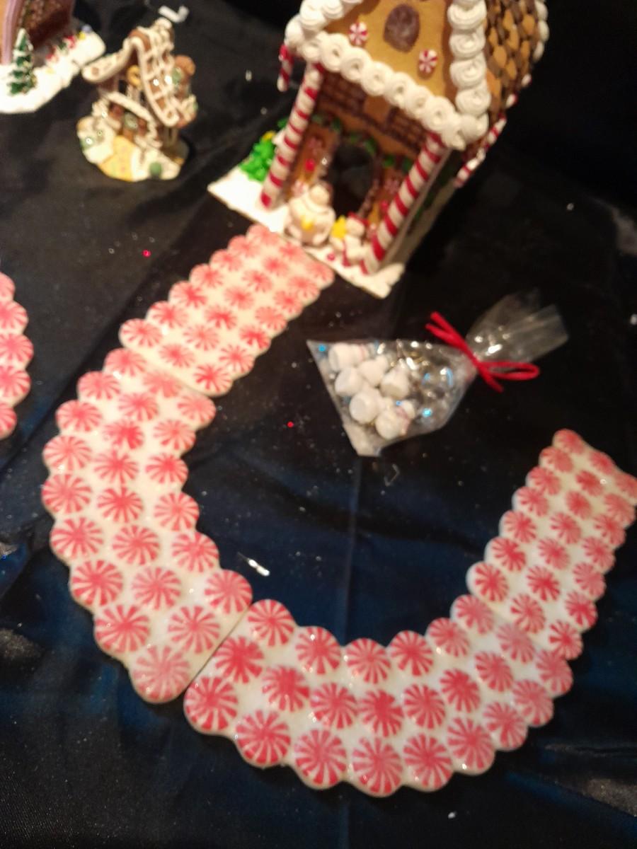 THREE SMALL GINGERBREAD HOUSES WITH PEPPERMINT WALKWAY