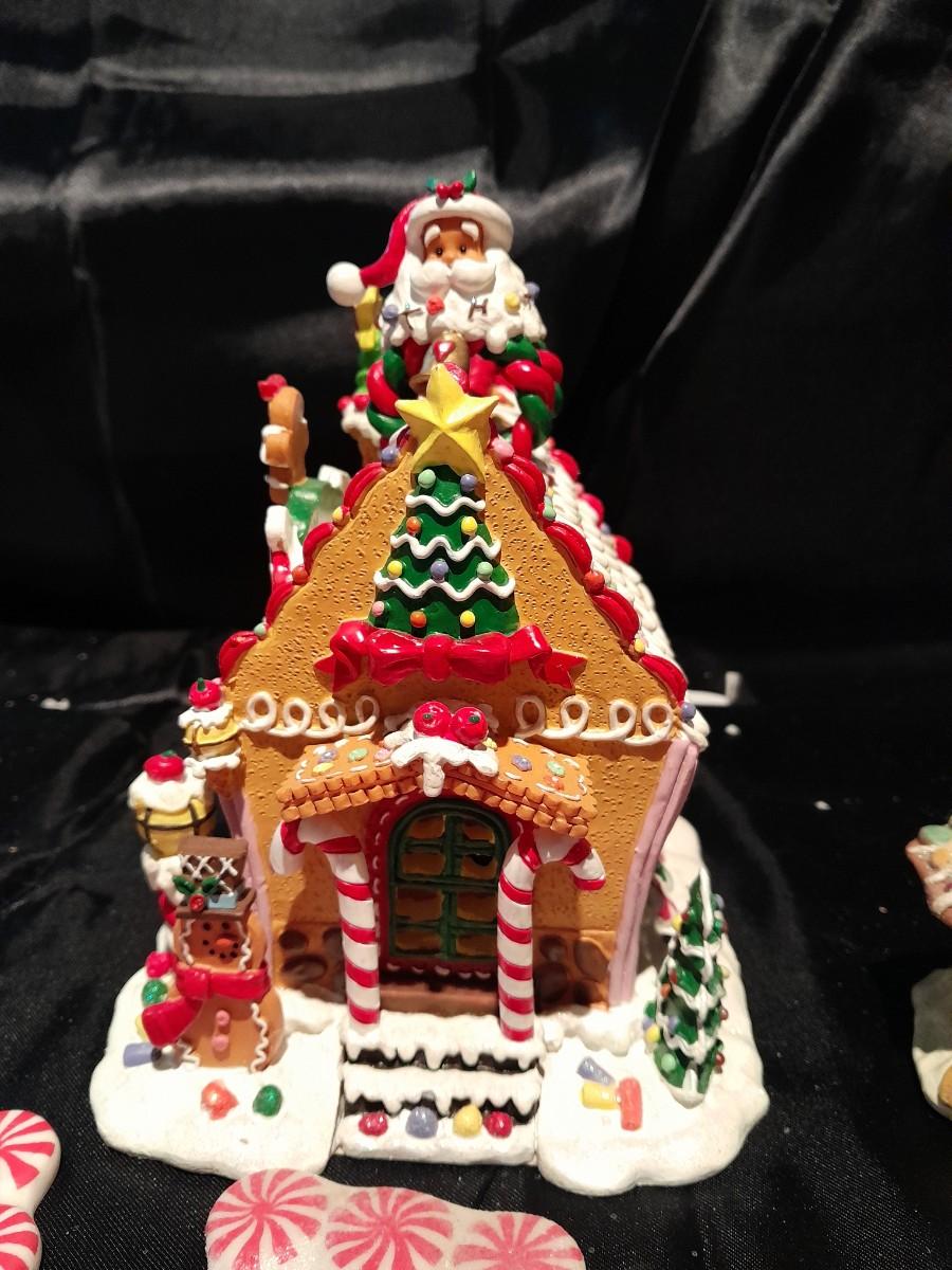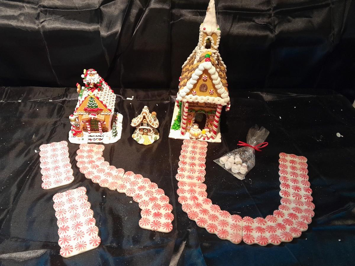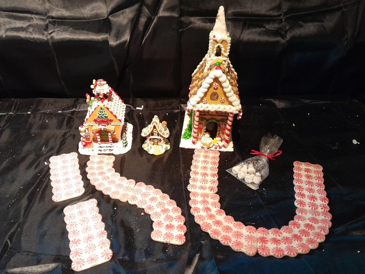 LOT 236 THREE SMALL GINGERBREAD HOUSES WITH PEPPERMINT WALKWAY
