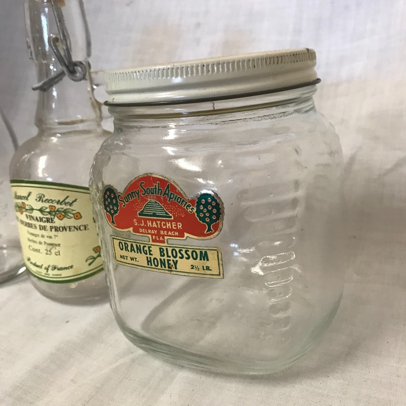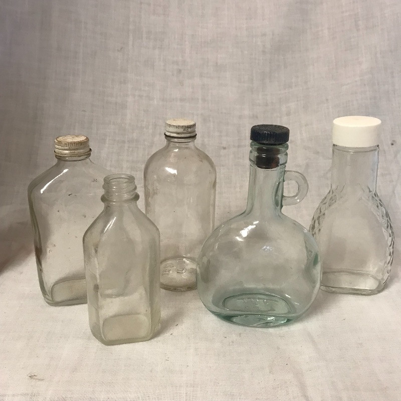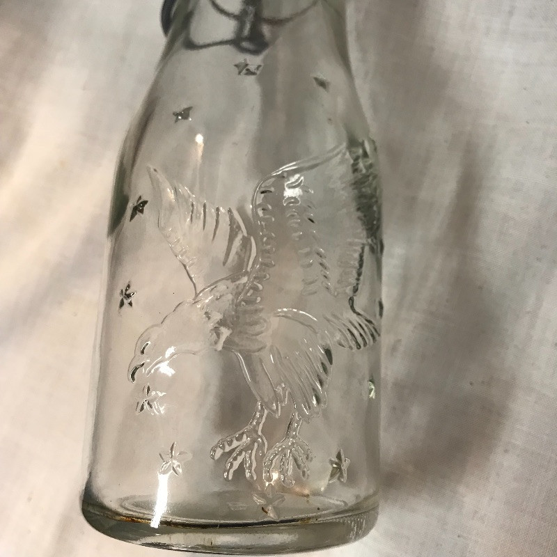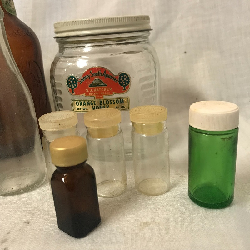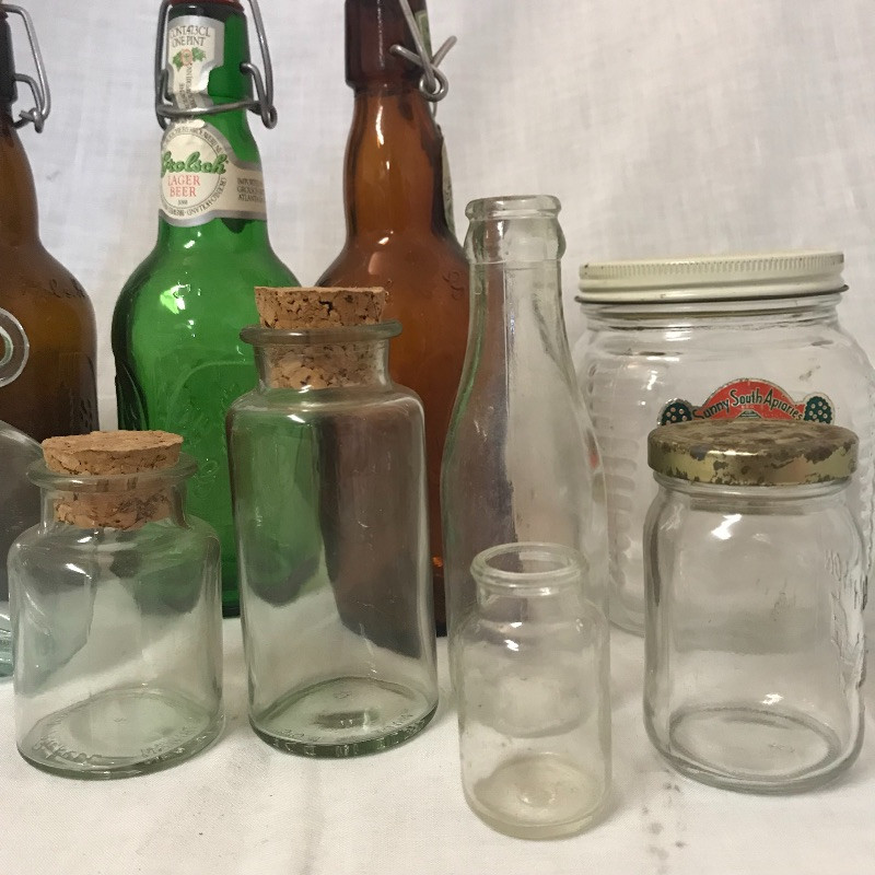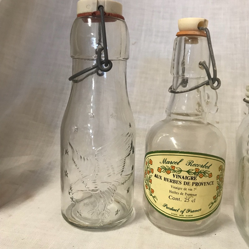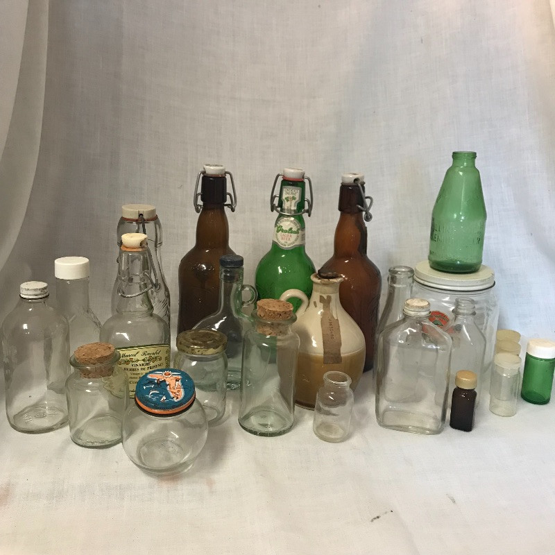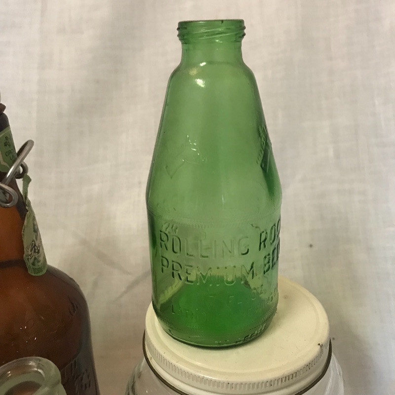 Fun collection of vintage and newer glass bottles. Many are colored glass with cork and metal lids. Check out the old green Rolling Rock bottle or the 1898 American Eagle, see images.