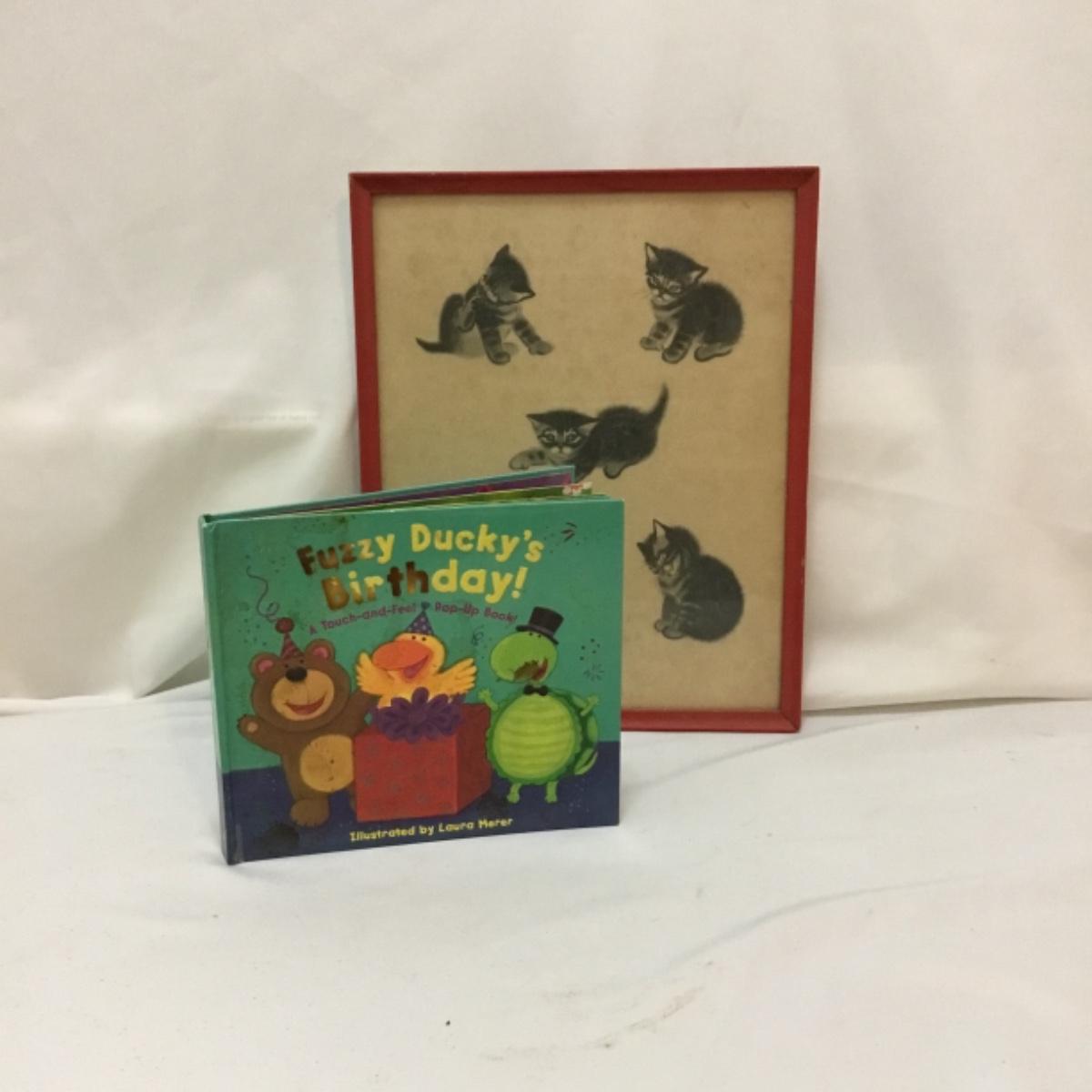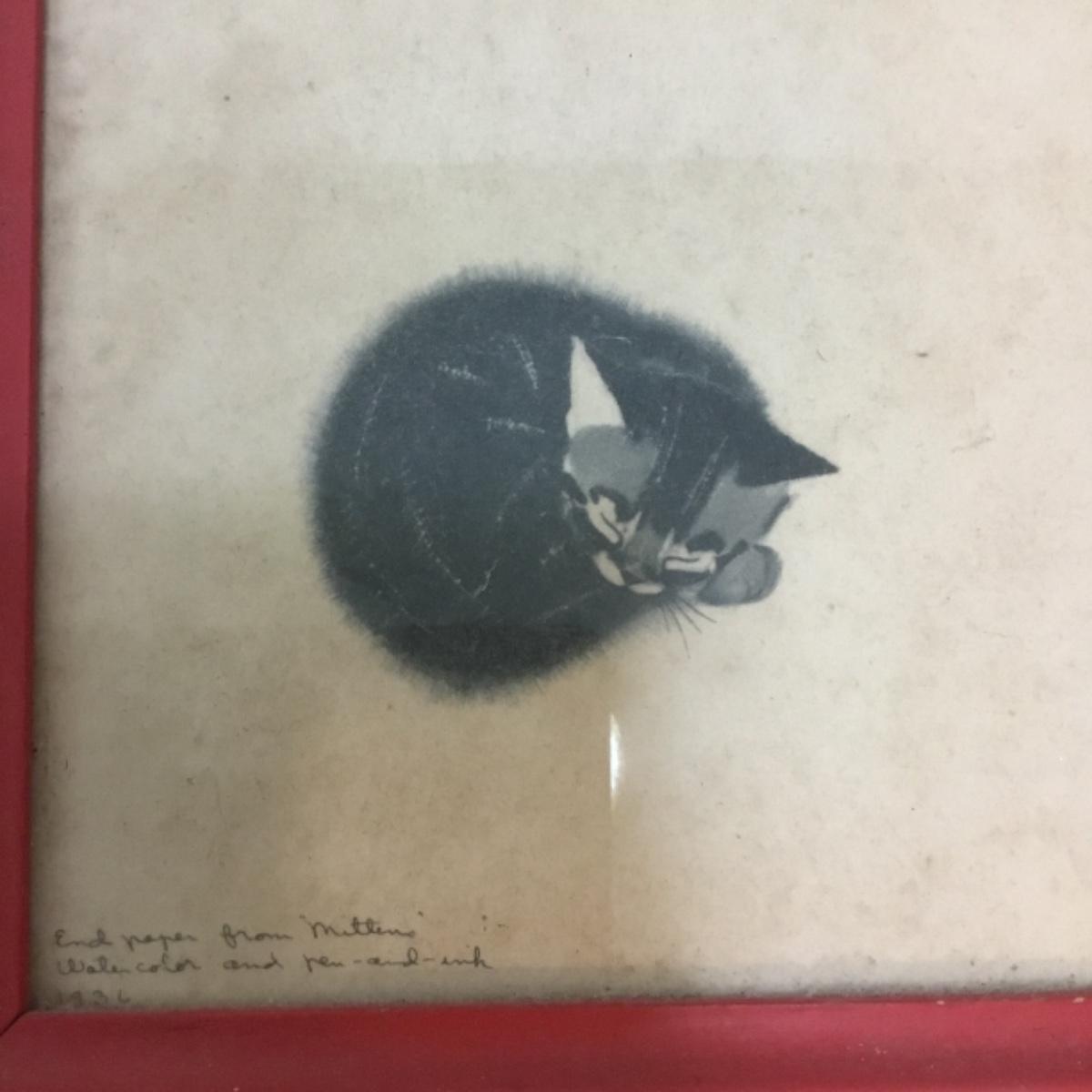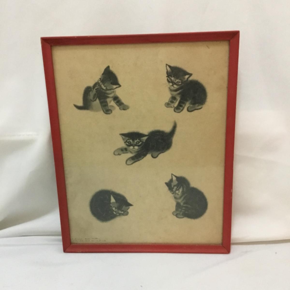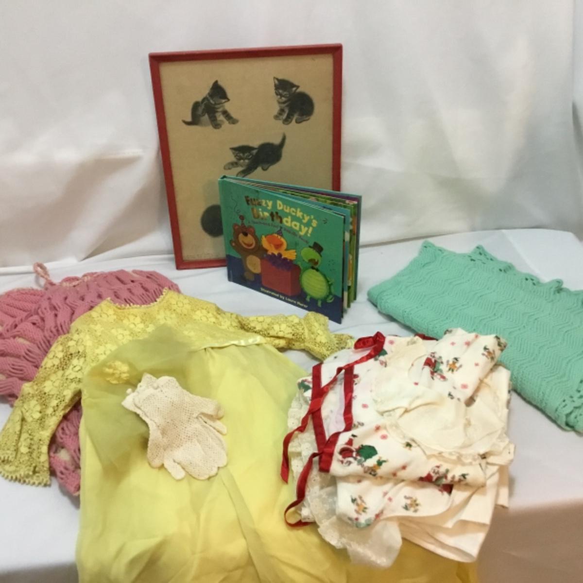 Whether you're going to restore and give to the next bundle of joy in your life or use as decor in a shop or house, we've given you all things that make you go 'Awww'! Lot includes infant sized garments. Notice the vintage style! A knitted baby blanket, dresses, shoes and lace gloves could also be used for dressing up dolls. See photos for details. Signed and framed vintage kitten art measures 11.5” x 14.5”. Shipping available.