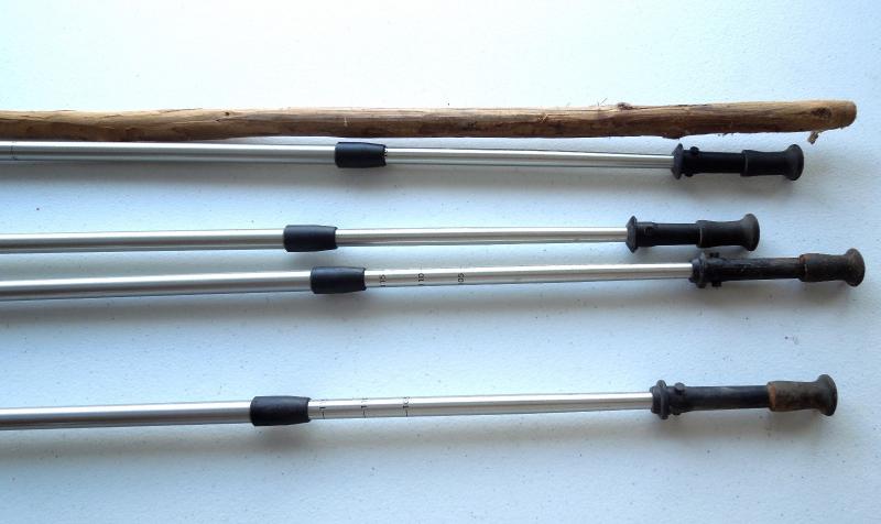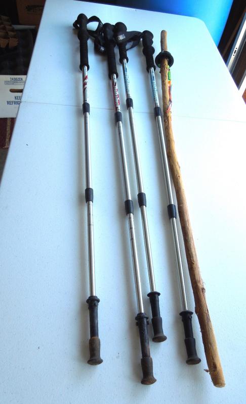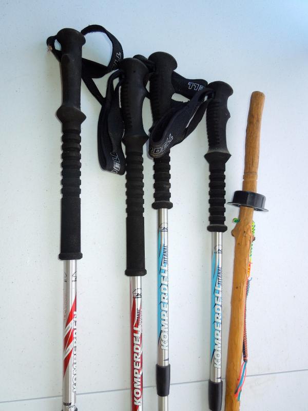 Two pair of Komperdell Titanal adjustable walking poles with comfort grips and a stripped wood walking stick.