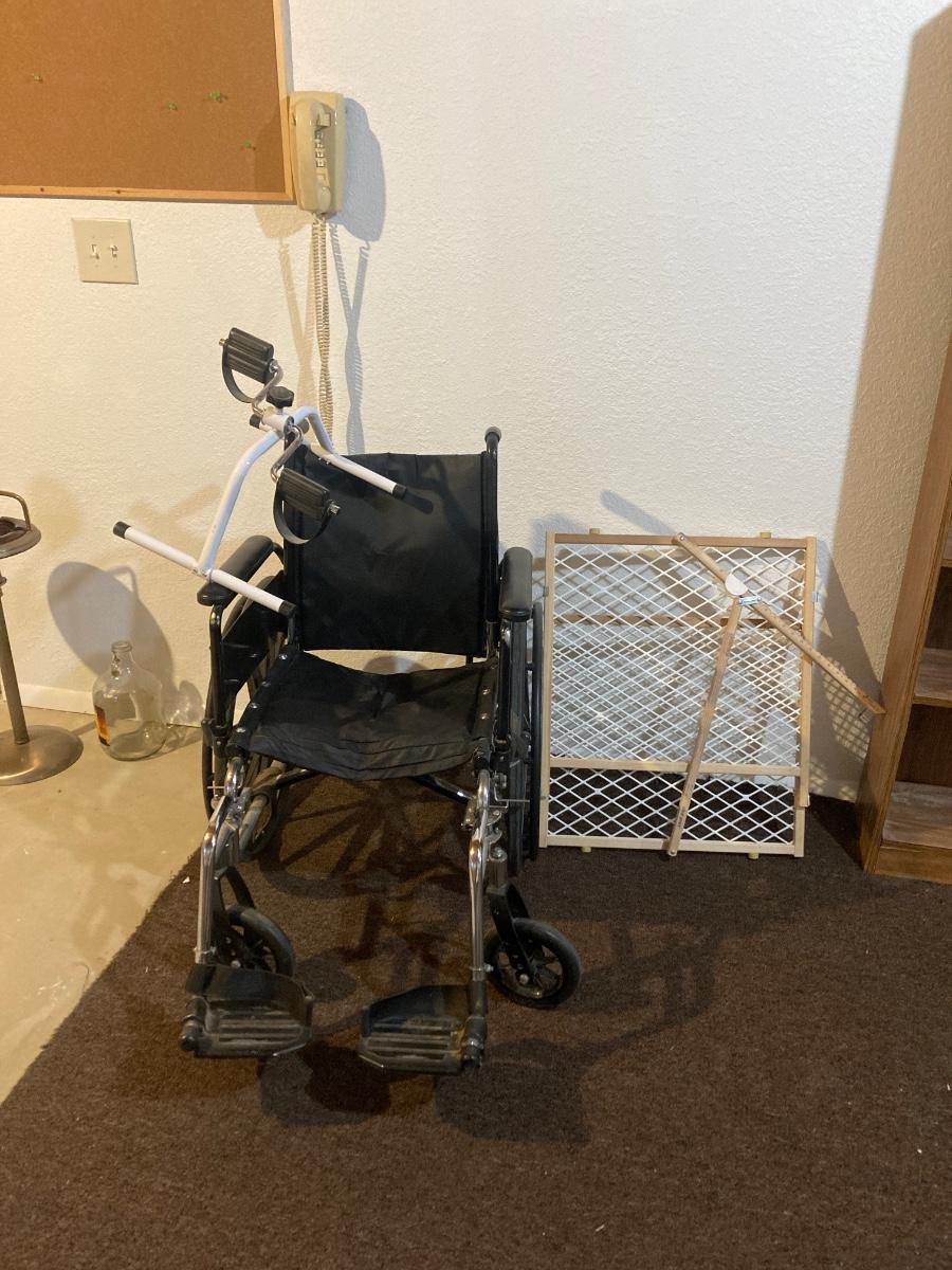 LOT 236 WHEEL CHAIR, GATE, TOUCH TONE WALL PHONE, AND EXERCISE PEDDLER