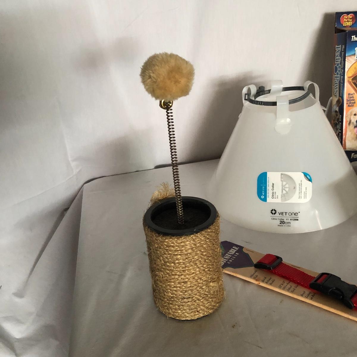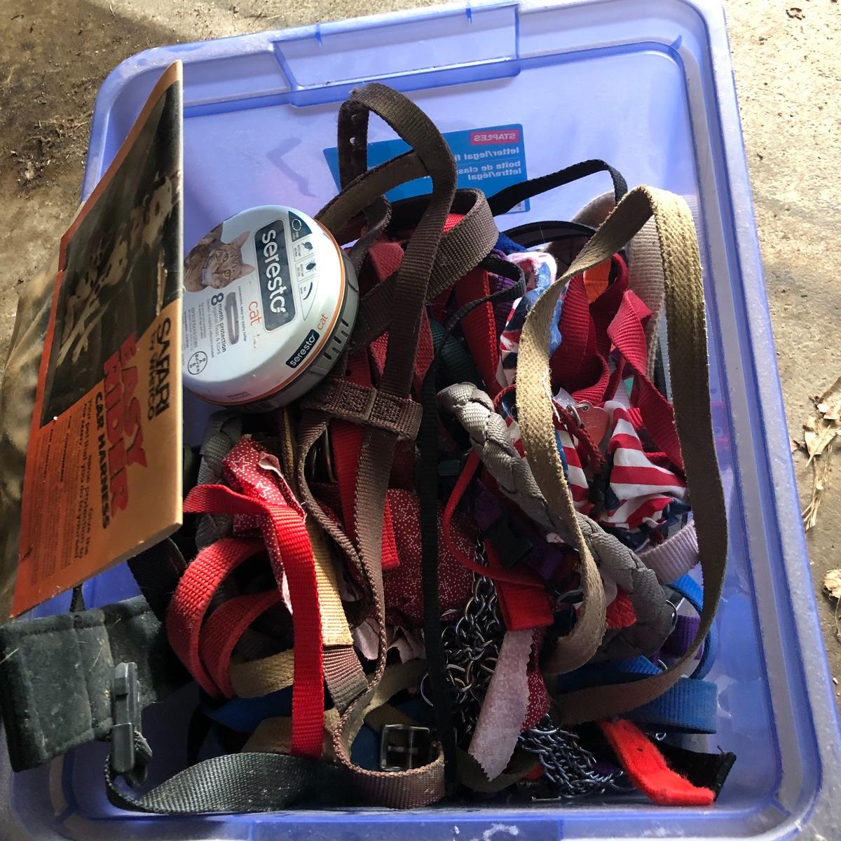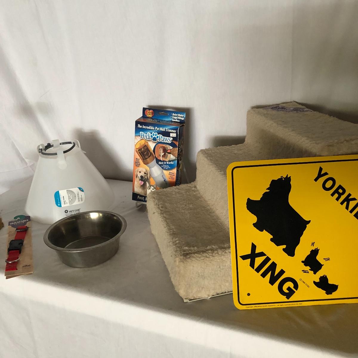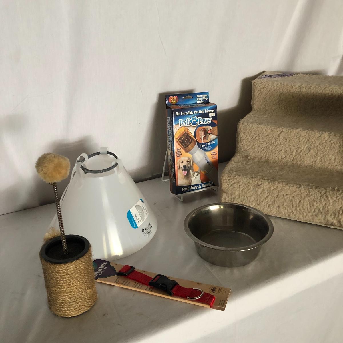 You will have all of the pet supplies needed with this lot! It contains pet steps, a pet cone, dog nail trimmers, cat toys, a dog bath tub, seven PVC and canvas dog beds, four animal gates, a litter box, a pet carrier, two pooper scoopers, a bin of collars and leashes and more! Local pick up only.