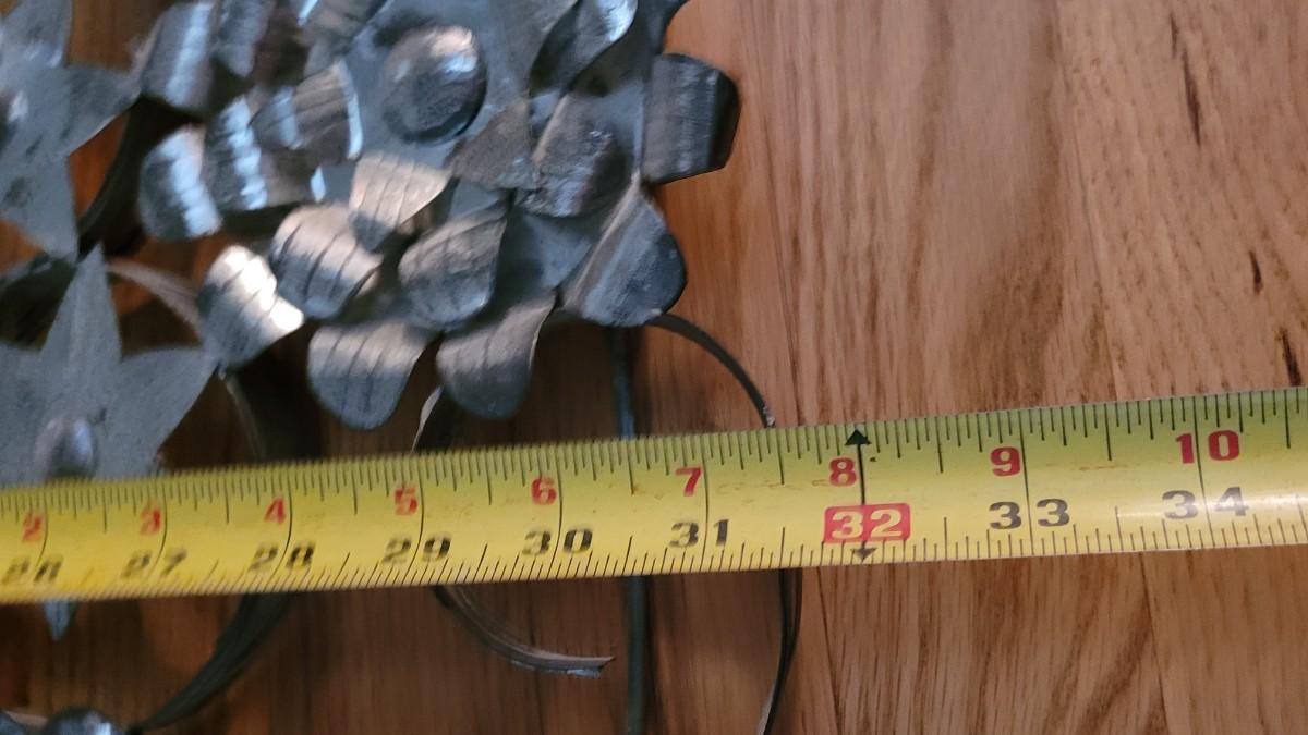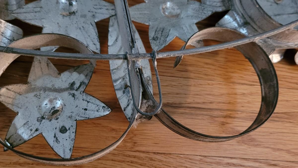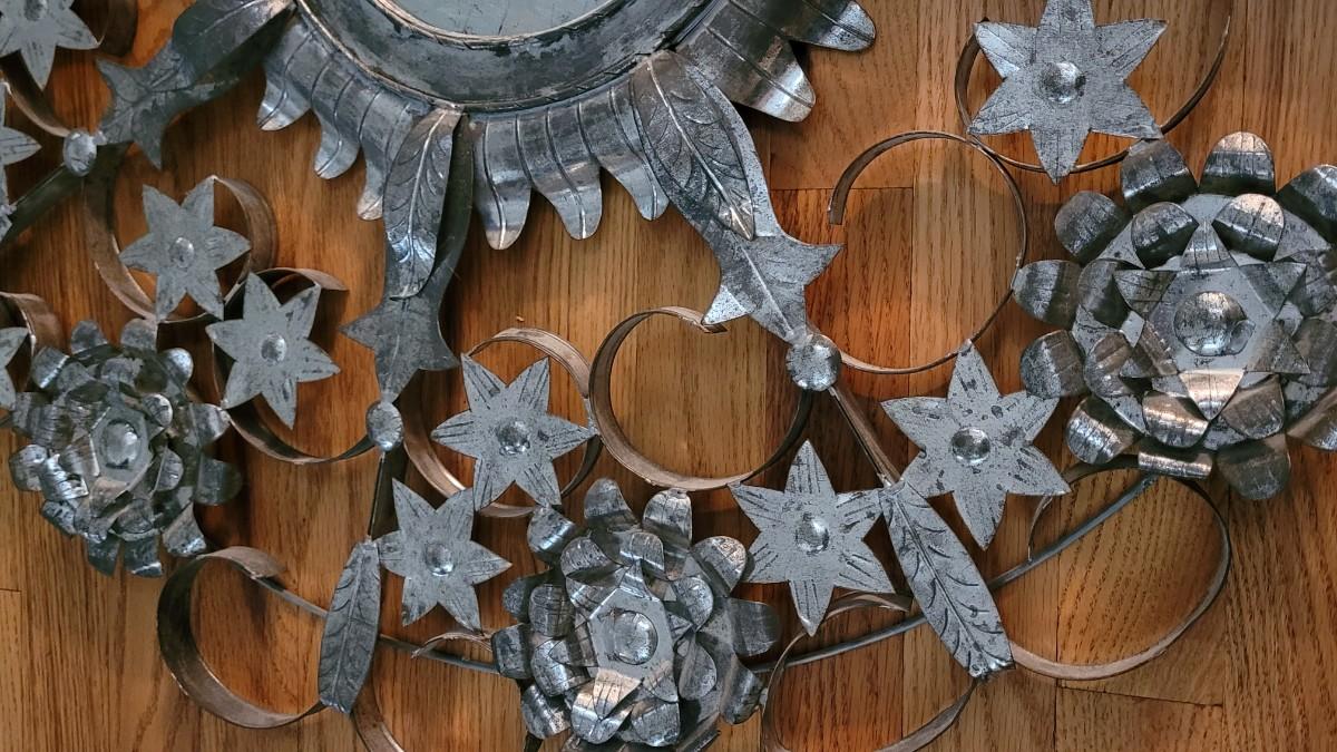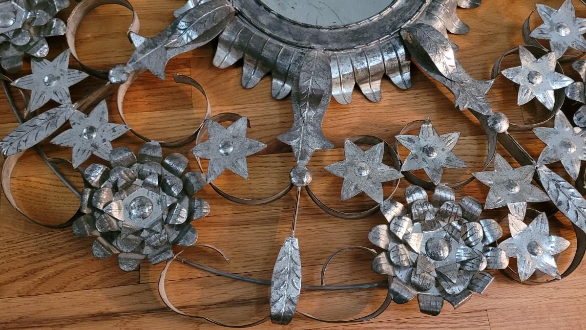 Vintage 1950's Mexican Tin Folk Art with Floral Design. Minor Repair Needed- Has a wire in the back that needs to be reattached and a piece of the floral motif that needs to be reattached- both shown in photos.