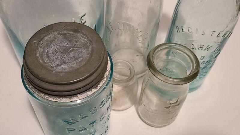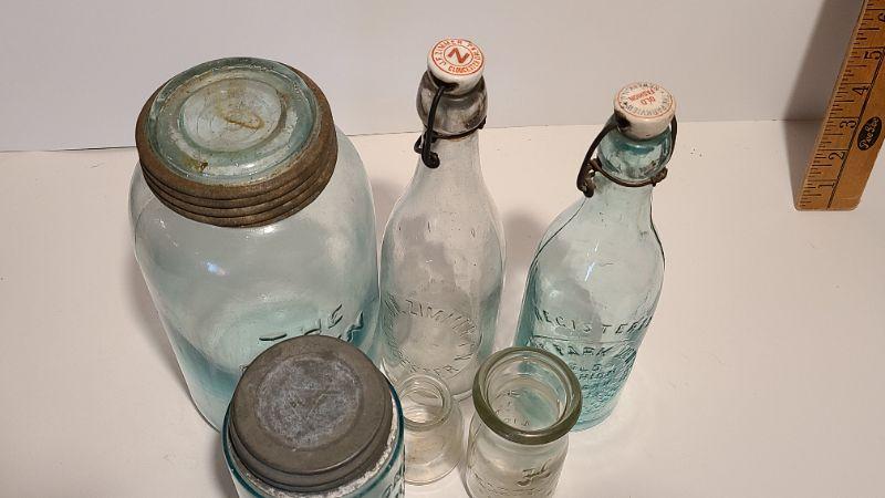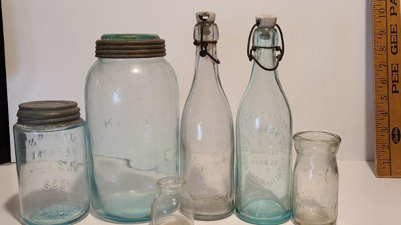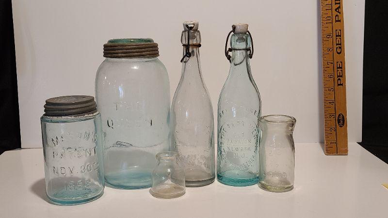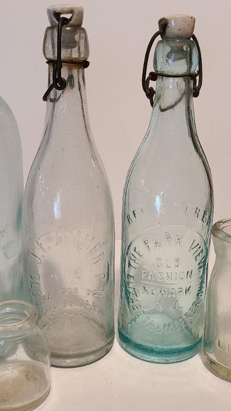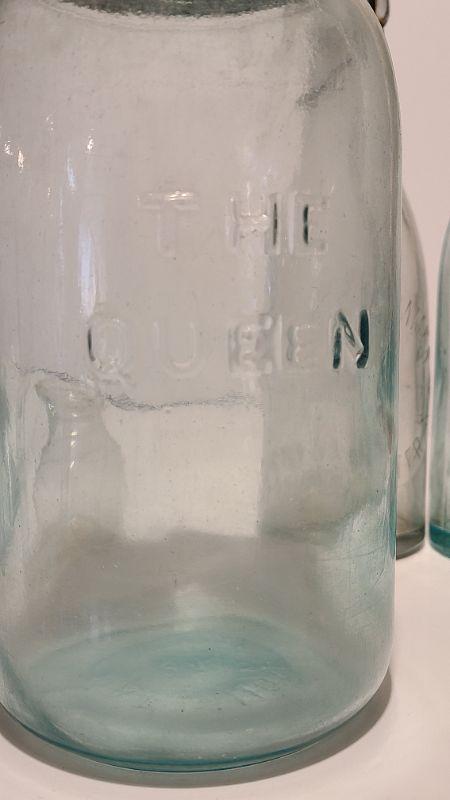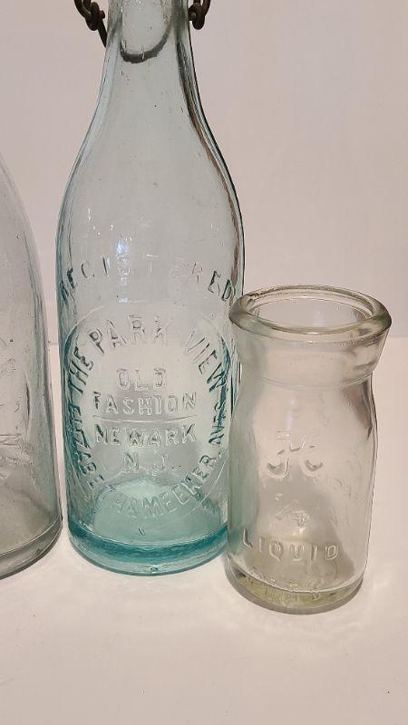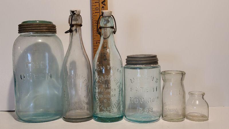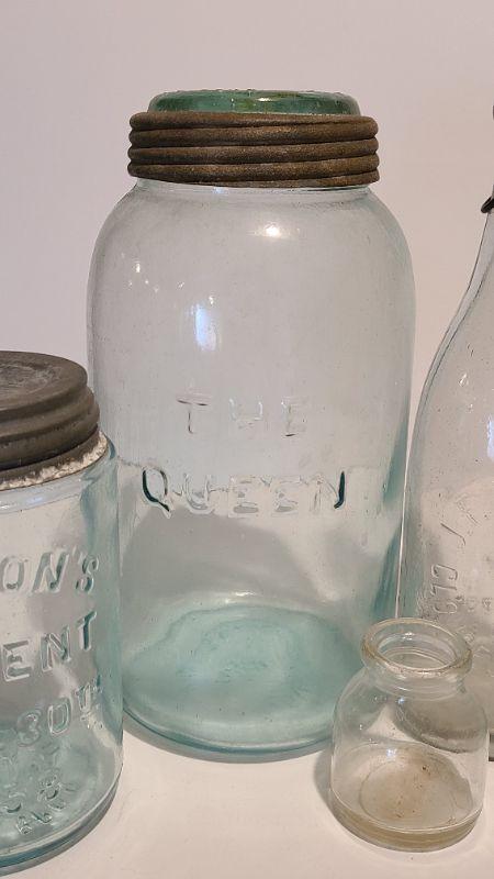 Antique Bottles including a rare large THE QUEEN Jar with glass and zinc lid, The Park View Old Fashioned bottle Newark NJ, and small dairy and Masons Jar) Each lot is unique and you will need to see all pictures. Pictures have been taken from all side to see condition and markings. What you see in the pictures is the actual content of the lot and the pictures are the best representation of the bottles. All bottles are sold-is according to the pictures. For further information please google the makers marks for age.