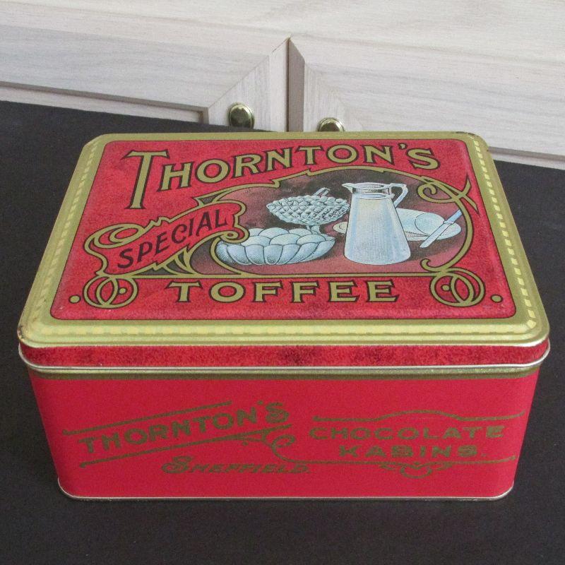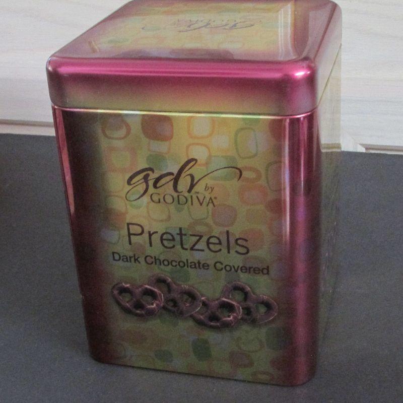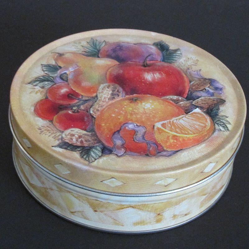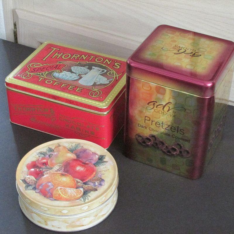1 Circular Fruit Décor tin with embossed lid, 1 Rectangular Thorton's Special Toffee, and 1 GDV by Godiva Pretzel Tin.