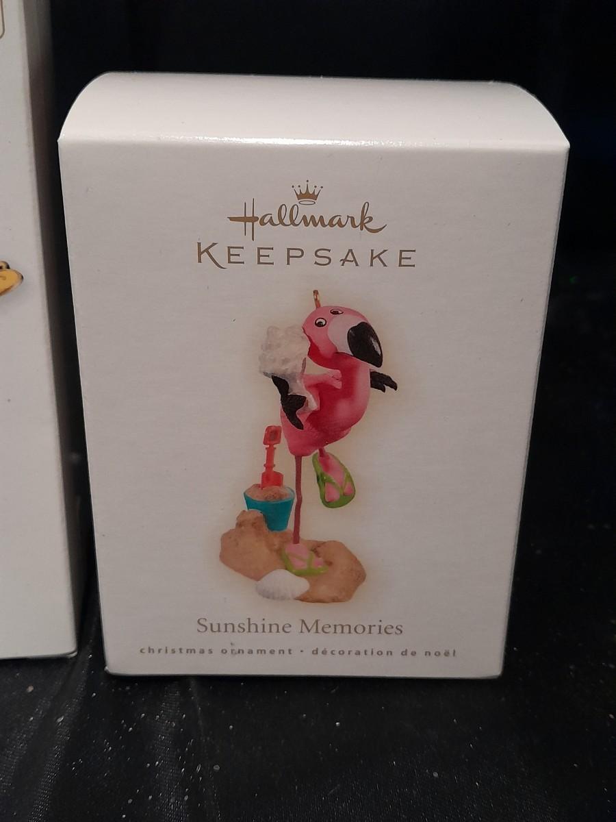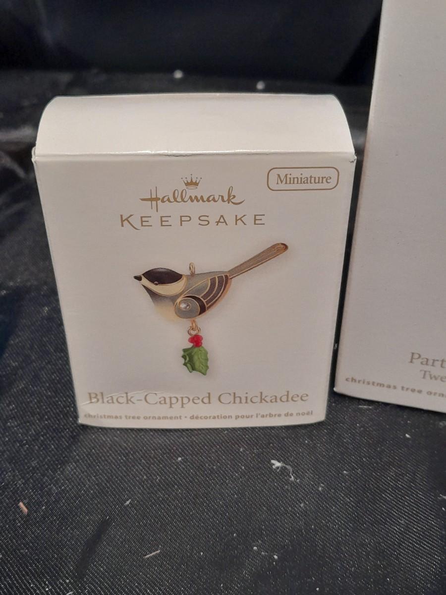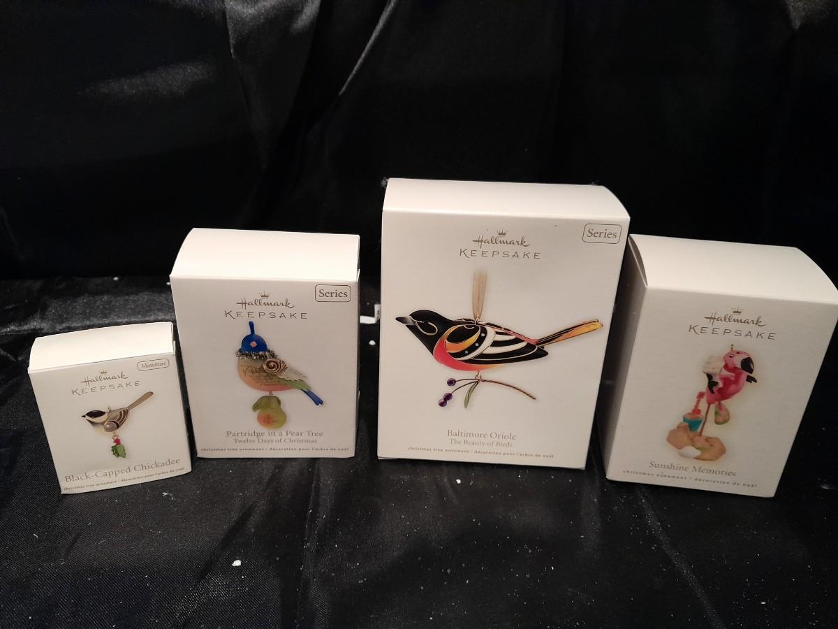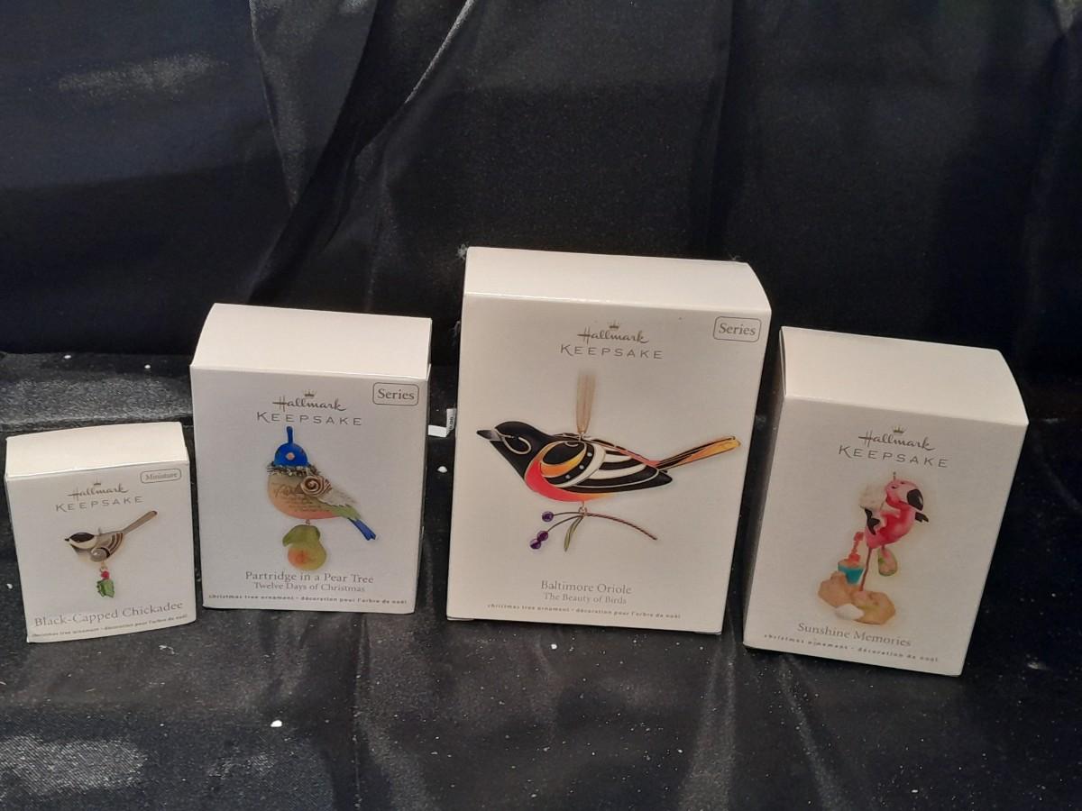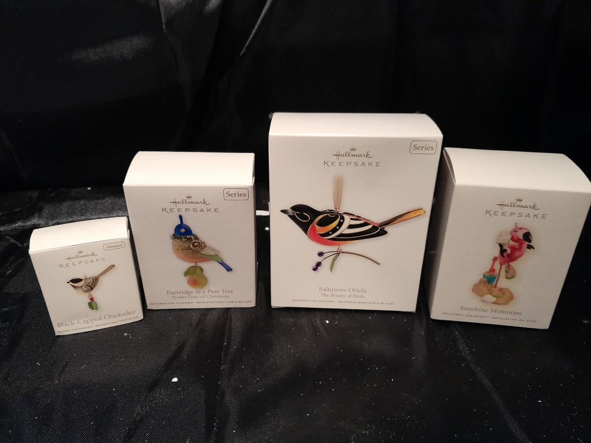 FOUR HALLMARK KEEPSAKE BIRD ORNAMENTS, SUNSHINE MEMORIES FLAMINGO, BALTIMORE ORIOLE, PARTRIDGE IN A PEAR TREE, AND BLACK CAPPED CHICADEE, ALL IN BOXES.