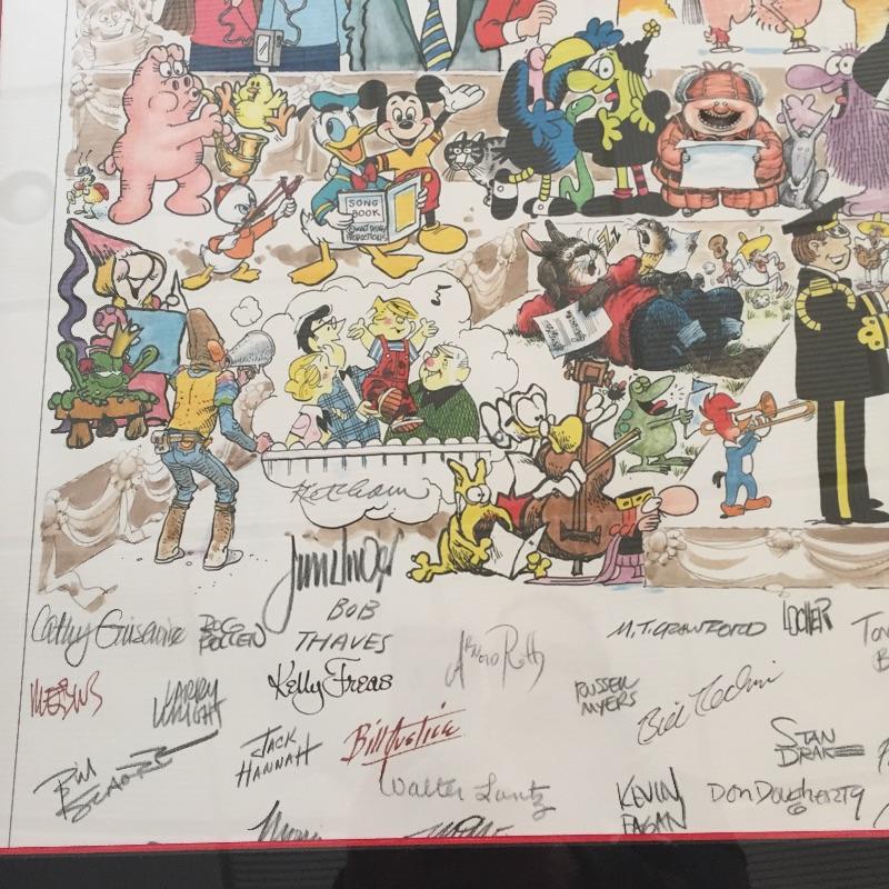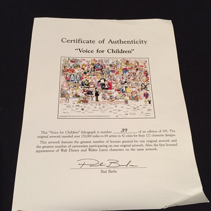 This limited edition framed “Voice for Children” comes with a Certificate of Authenticity. It includes lots of characters and many famous cartoonist signatures in one piece! Artwork is #39 of an edition of 195 and contains the first licensed appearances of Walt Disney and Walter Lantz characters on the same piece. This incredible piece of art is nice and large to make a statement and measures 40” x 32”