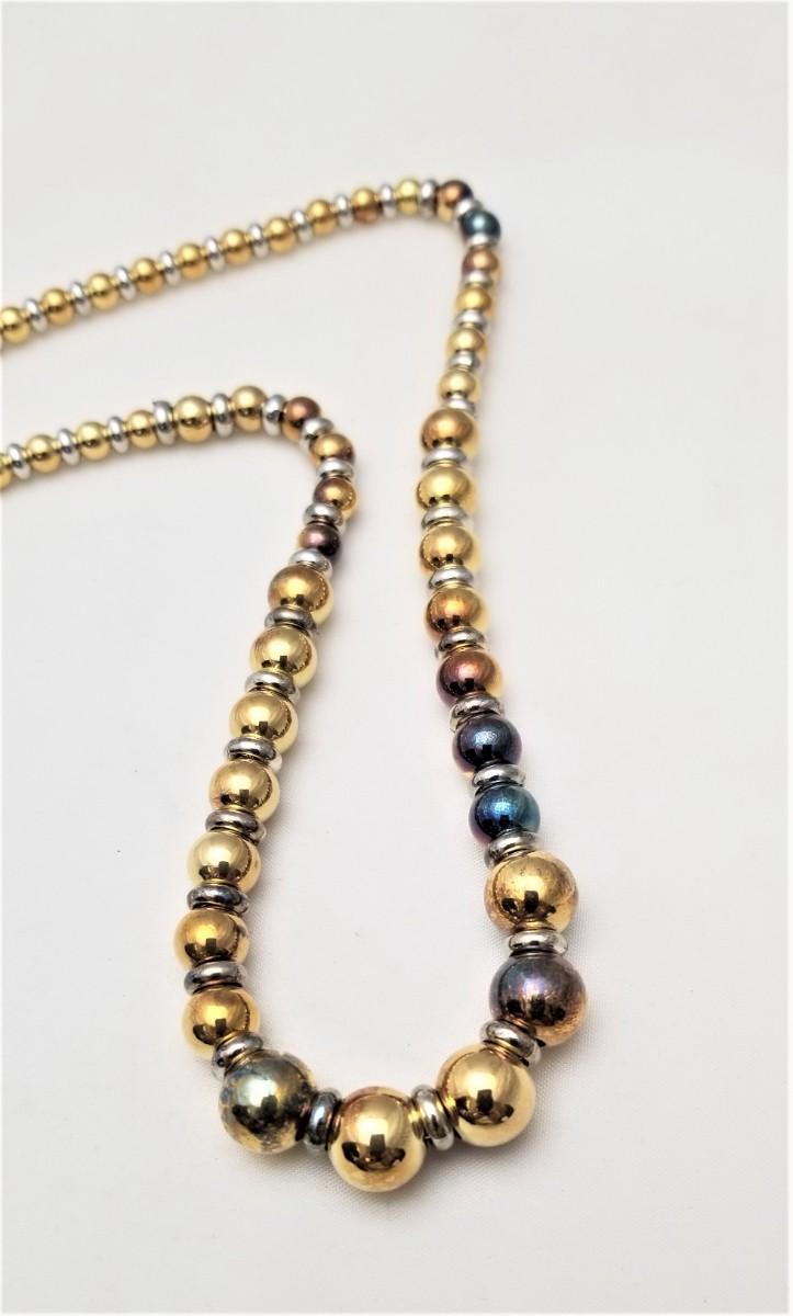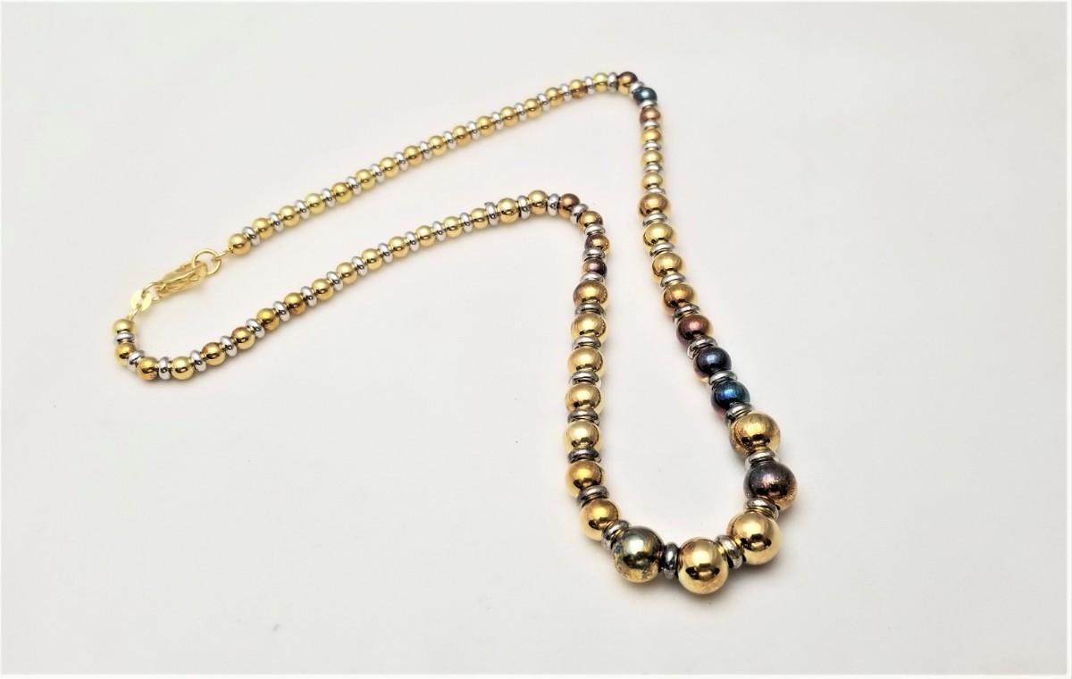 Marked "925" for Sterling - plated in gold - graduated bead necklace, strung on a sterling chain. About 20" long. Lobster claw clasp.