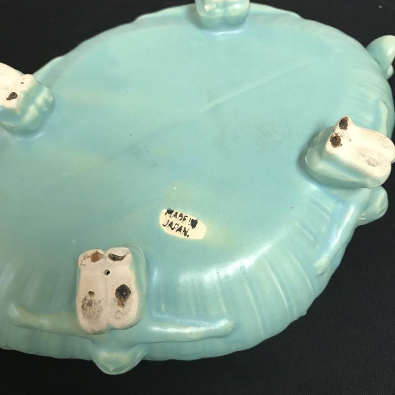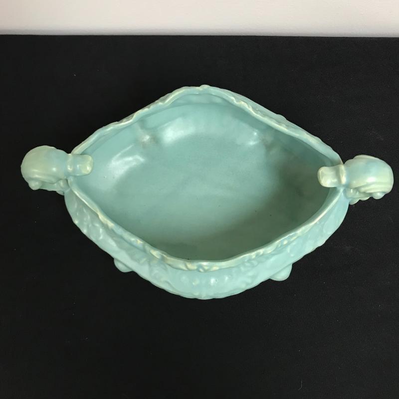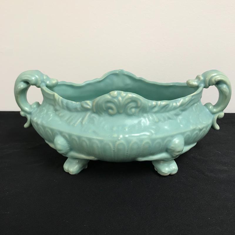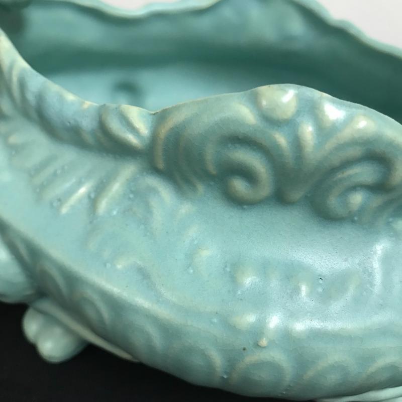 This unique aqua colored footed bowl was made in Japan and is in great condition. Use for plant or as a serving dish. Approx. 10” long. See pics. Shipping available or local pickup in Arden, NC.