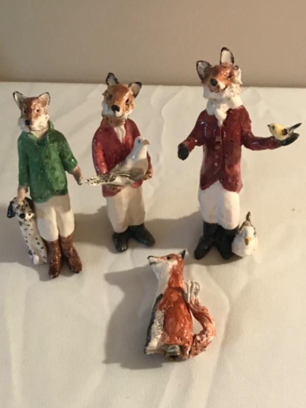 Four ceramic fox figurines signed JSP. The small fox is a finial.